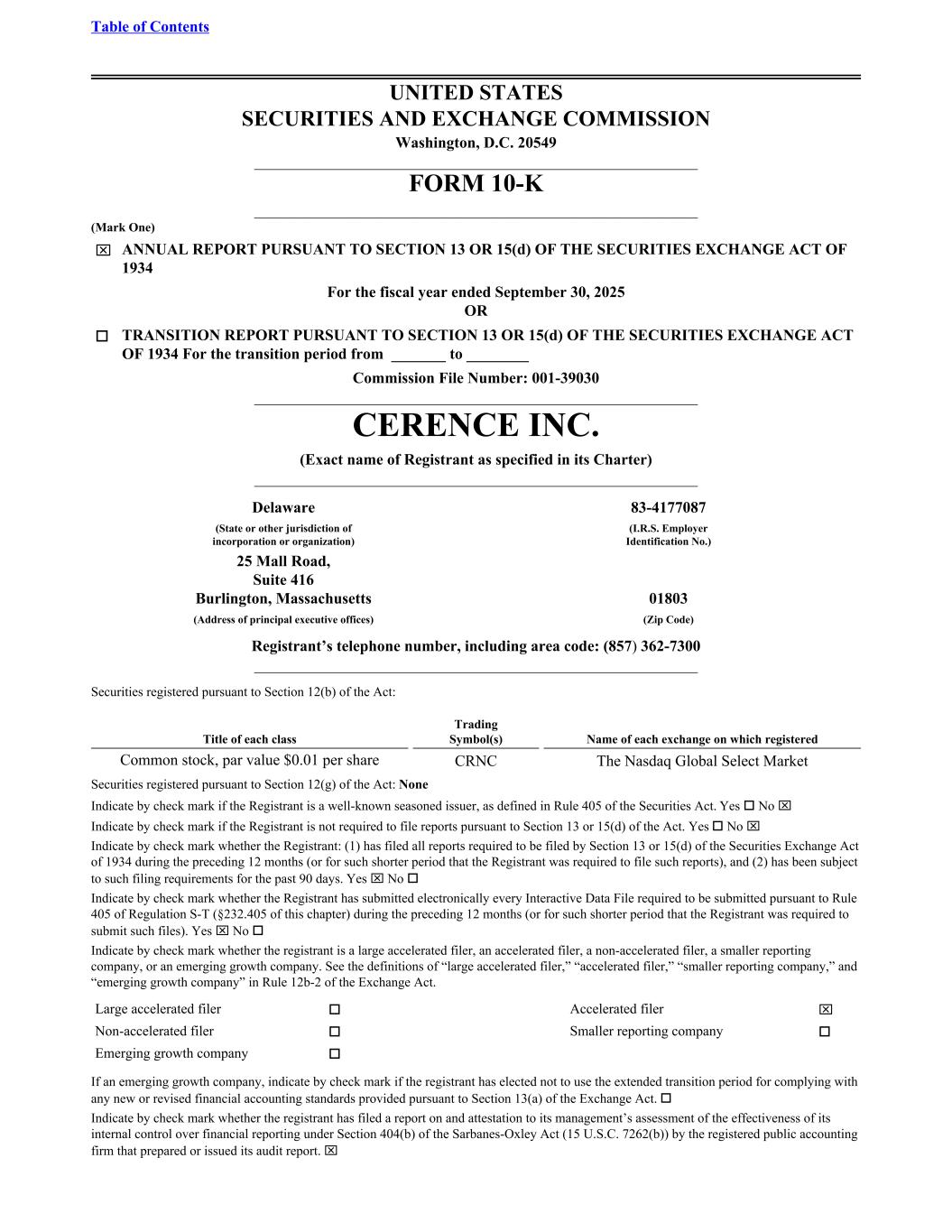 UNITED STATES SECURITIES AND EXCHANGE COMMISSION Washington, D.C. 20549 _________________________________________________________ FORM 10-K _________________________________________________________ (Mark One) x ANNUAL REPORT PURSUANT TO SECTION 13 OR 15(d) OF THE SECURITIES EXCHANGE ACT OF 1934 For the fiscal year ended September 30, 2025 OR o TRANSITION REPORT PURSUANT TO SECTION 13 OR 15(d) OF THE SECURITIES EXCHANGE ACT OF 1934 For the transition period from _______ to ________ Commission File Number: 001-39030 _________________________________________________________ CERENCE INC. (Exact name of Registrant as specified in its Charter) _________________________________________________________ Delaware 83-4177087 (State or other jurisdiction of incorporation or organization) (I.R.S. Employer Identification No.) 25 Mall Road, Suite 416 Burlington, Massachusetts 01803 (Address of principal executive offices) (Zip Code) Registrant’s telephone number, including area code: (857) 362-7300 _________________________________________________________ Securities registered pursuant to Section 12(b) of the Act: Title of each class Trading Symbol(s) Name of each exchange on which registered Common stock, par value $0.01 per share CRNC The Nasdaq Global Select Market Securities registered pursuant to Section 12(g) of the Act: None Indicate by check mark if the Registrant is a well-known seasoned issuer, as defined in Rule 405 of the Securities Act. Yes o No x Indicate by check mark if the Registrant is not required to file reports pursuant to Section 13 or 15(d) of the Act. Yes o No x Indicate by check mark whether the Registrant: (1) has filed all reports required to be filed by Section 13 or 15(d) of the Securities Exchange Act of 1934 during the preceding 12 months (or for such shorter period that the Registrant was required to file such reports), and (2) has been subject to such filing requirements for the past 90 days. Yes x No o Indicate by check mark whether the Registrant has submitted electronically every Interactive Data File required to be submitted pursuant to Rule 405 of Regulation S-T (§232.405 of this chapter) during the preceding 12 months (or for such shorter period that the Registrant was required to submit such files). Yes x No o Indicate by check mark whether the registrant is a large accelerated filer, an accelerated filer, a non-accelerated filer, a smaller reporting company, or an emerging growth company. See the definitions of “large accelerated filer,” “accelerated filer,” “smaller reporting company,” and “emerging growth company” in Rule 12b-2 of the Exchange Act. Large accelerated filer o Accelerated filer x Non-accelerated filer o Smaller reporting company o Emerging growth company o If an emerging growth company, indicate by check mark if the registrant has elected not to use the extended transition period for complying with any new or revised financial accounting standards provided pursuant to Section 13(a) of the Exchange Act. o Indicate by check mark whether the registrant has filed a report on and attestation to its management’s assessment of the effectiveness of its internal control over financial reporting under Section 404(b) of the Sarbanes-Oxley Act (15 U.S.C. 7262(b)) by the registered public accounting firm that prepared or issued its audit report. x Table of Contents