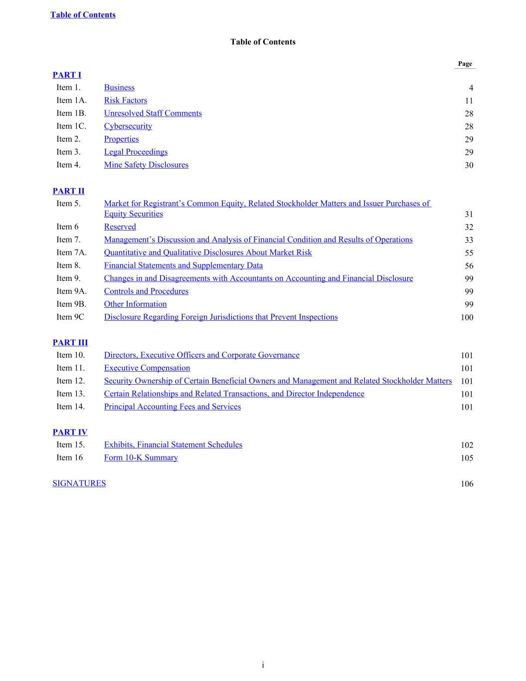 Table of Contents Page PART I Item 1. Business 4 Item 1A. Risk Factors 11 Item 1B. Unresolved Staff Comments 28 Item 1C. Cybersecurity 28 Item 2. Properties 29 Item 3. Legal Proceedings 29 Item 4. Mine Safety Disclosures 30 PART II Item 5. Market for Registrant’s Common Equity, Related Stockholder Matters and Issuer Purchases of Equity Securities 31 Item 6 Reserved 32 Item 7. Management’s Discussion and Analysis of Financial Condition and Results of Operations 33 Item 7A. Quantitative and Qualitative Disclosures About Market Risk 55 Item 8. Financial Statements and Supplementary Data 56 Item 9. Changes in and Disagreements with Accountants on Accounting and Financial Disclosure 99 Item 9A. Controls and Procedures 99 Item 9B. Other Information 99 Item 9C Disclosure Regarding Foreign Jurisdictions that Prevent Inspections 100 PART III Item 10. Directors, Executive Officers and Corporate Governance 101 Item 11. Executive Compensation 101 Item 12. Security Ownership of Certain Beneficial Owners and Management and Related Stockholder Matters 101 Item 13. Certain Relationships and Related Transactions, and Director Independence 101 Item 14. Principal Accounting Fees and Services 101 PART IV Item 15. Exhibits, Financial Statement Schedules 102 Item 16 Form 10-K Summary 105 SIGNATURES 106 Table of Contents i