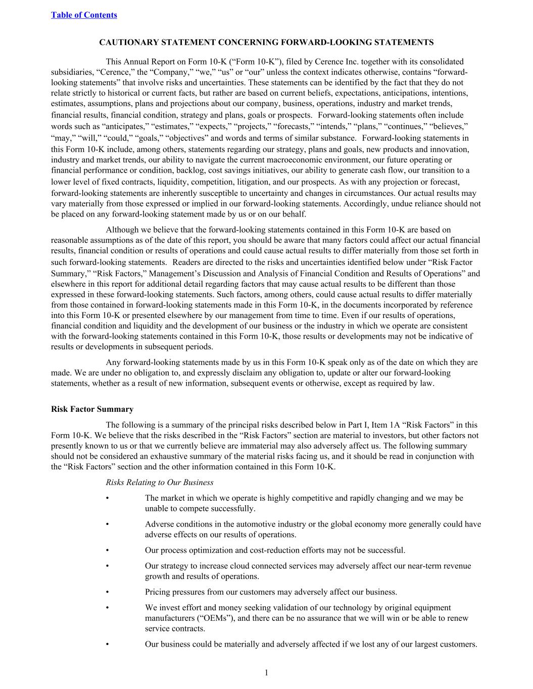 CAUTIONARY STATEMENT CONCERNING FORWARD-LOOKING STATEMENTS This Annual Report on Form 10-K (“Form 10-K”), filed by Cerence Inc. together with its consolidated subsidiaries, “Cerence,” the “Company,” “we,” “us” or “our” unless the context indicates otherwise, contains “forward- looking statements” that involve risks and uncertainties. These statements can be identified by the fact that they do not relate strictly to historical or current facts, but rather are based on current beliefs, expectations, anticipations, intentions, estimates, assumptions, plans and projections about our company, business, operations, industry and market trends, financial results, financial condition, strategy and plans, goals or prospects. Forward-looking statements often include words such as “anticipates,” “estimates,” “expects,” “projects,” “forecasts,” “intends,” “plans,” “continues,” “believes,” “may,” “will,” “could,” “goals,” “objectives” and words and terms of similar substance. Forward-looking statements in this Form 10-K include, among others, statements regarding our strategy, plans and goals, new products and innovation, industry and market trends, our ability to navigate the current macroeconomic environment, our future operating or financial performance or condition, backlog, cost savings initiatives, our ability to generate cash flow, our transition to a lower level of fixed contracts, liquidity, competition, litigation, and our prospects. As with any projection or forecast, forward-looking statements are inherently susceptible to uncertainty and changes in circumstances. Our actual results may vary materially from those expressed or implied in our forward-looking statements. Accordingly, undue reliance should not be placed on any forward-looking statement made by us or on our behalf. Although we believe that the forward-looking statements contained in this Form 10-K are based on reasonable assumptions as of the date of this report, you should be aware that many factors could affect our actual financial results, financial condition or results of operations and could cause actual results to differ materially from those set forth in such forward-looking statements. Readers are directed to the risks and uncertainties identified below under “Risk Factor Summary,” “Risk Factors,” Management’s Discussion and Analysis of Financial Condition and Results of Operations” and elsewhere in this report for additional detail regarding factors that may cause actual results to be different than those expressed in these forward-looking statements. Such factors, among others, could cause actual results to differ materially from those contained in forward-looking statements made in this Form 10-K, in the documents incorporated by reference into this Form 10-K or presented elsewhere by our management from time to time. Even if our results of operations, financial condition and liquidity and the development of our business or the industry in which we operate are consistent with the forward-looking statements contained in this Form 10-K, those results or developments may not be indicative of results or developments in subsequent periods. Any forward-looking statements made by us in this Form 10-K speak only as of the date on which they are made. We are under no obligation to, and expressly disclaim any obligation to, update or alter our forward-looking statements, whether as a result of new information, subsequent events or otherwise, except as required by law. Risk Factor Summary The following is a summary of the principal risks described below in Part I, Item 1A “Risk Factors” in this Form 10-K. We believe that the risks described in the “Risk Factors” section are material to investors, but other factors not presently known to us or that we currently believe are immaterial may also adversely affect us. The following summary should not be considered an exhaustive summary of the material risks facing us, and it should be read in conjunction with the “Risk Factors” section and the other information contained in this Form 10-K. Risks Relating to Our Business • The market in which we operate is highly competitive and rapidly changing and we may be unable to compete successfully. • Adverse conditions in the automotive industry or the global economy more generally could have adverse effects on our results of operations. • Our process optimization and cost-reduction efforts may not be successful. • Our strategy to increase cloud connected services may adversely affect our near-term revenue growth and results of operations. • Pricing pressures from our customers may adversely affect our business. • We invest effort and money seeking validation of our technology by original equipment manufacturers (“OEMs”), and there can be no assurance that we will win or be able to renew service contracts. • Our business could be materially and adversely affected if we lost any of our largest customers. Table of Contents 1