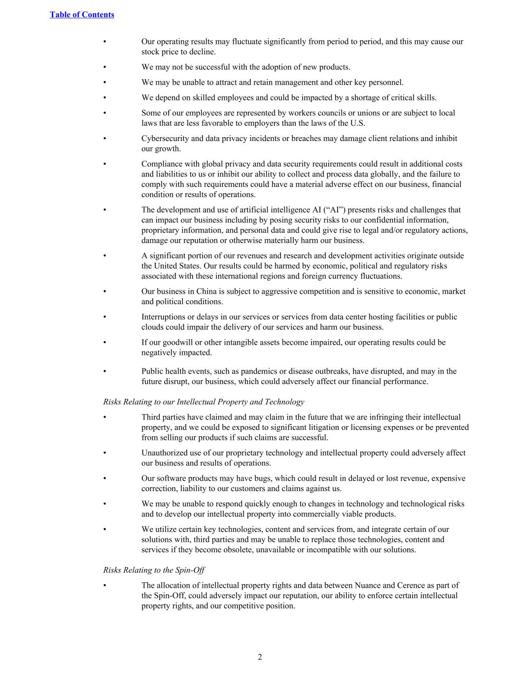 • Our operating results may fluctuate significantly from period to period, and this may cause our stock price to decline. • We may not be successful with the adoption of new products. • We may be unable to attract and retain management and other key personnel. • We depend on skilled employees and could be impacted by a shortage of critical skills. • Some of our employees are represented by workers councils or unions or are subject to local laws that are less favorable to employers than the laws of the U.S. • Cybersecurity and data privacy incidents or breaches may damage client relations and inhibit our growth. • Compliance with global privacy and data security requirements could result in additional costs and liabilities to us or inhibit our ability to collect and process data globally, and the failure to comply with such requirements could have a material adverse effect on our business, financial condition or results of operations. • The development and use of artificial intelligence AI (“AI”) presents risks and challenges that can impact our business including by posing security risks to our confidential information, proprietary information, and personal data and could give rise to legal and/or regulatory actions, damage our reputation or otherwise materially harm our business. • A significant portion of our revenues and research and development activities originate outside the United States. Our results could be harmed by economic, political and regulatory risks associated with these international regions and foreign currency fluctuations. • Our business in China is subject to aggressive competition and is sensitive to economic, market and political conditions. • Interruptions or delays in our services or services from data center hosting facilities or public clouds could impair the delivery of our services and harm our business. • If our goodwill or other intangible assets become impaired, our operating results could be negatively impacted. • Public health events, such as pandemics or disease outbreaks, have disrupted, and may in the future disrupt, our business, which could adversely affect our financial performance. Risks Relating to our Intellectual Property and Technology • Third parties have claimed and may claim in the future that we are infringing their intellectual property, and we could be exposed to significant litigation or licensing expenses or be prevented from selling our products if such claims are successful. • Unauthorized use of our proprietary technology and intellectual property could adversely affect our business and results of operations. • Our software products may have bugs, which could result in delayed or lost revenue, expensive correction, liability to our customers and claims against us. • We may be unable to respond quickly enough to changes in technology and technological risks and to develop our intellectual property into commercially viable products. • We utilize certain key technologies, content and services from, and integrate certain of our solutions with, third parties and may be unable to replace those technologies, content and services if they become obsolete, unavailable or incompatible with our solutions. Risks Relating to the Spin-Off • The allocation of intellectual property rights and data between Nuance and Cerence as part of the Spin-Off, could adversely impact our reputation, our ability to enforce certain intellectual property rights, and our competitive position. Table of Contents 2