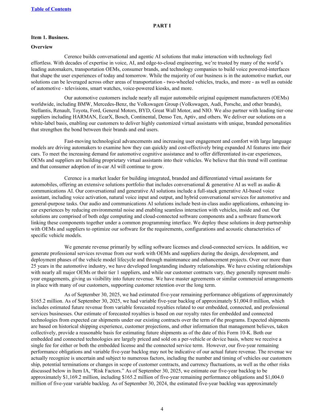 PART I Item 1. Business. Overview Cerence builds conversational and agentic AI solutions that make interaction with technology feel effortless. With decades of expertise in voice, AI, and edge-to-cloud engineering, we’re trusted by many of the world’s leading automakers, transportation OEMs, consumer brands, and technology companies to build voice powered-interfaces that shape the user experiences of today and tomorrow. While the majority of our business is in the automotive market, our solutions can be leveraged across other areas of transportation - two-wheeled vehicles, trucks, and more - as well as outside of automotive - televisions, smart watches, voice-powered kiosks, and more. Our automotive customers include nearly all major automobile original equipment manufacturers (OEMs) worldwide, including BMW, Mercedes-Benz, the Volkswagen Group (Volkswagen, Audi, Porsche, and other brands), Stellantis, Renault, Toyota, Ford, General Motors, BYD, Great Wall Motor, and NIO. We also partner with leading tier-one suppliers including HARMAN, EcarX, Bosch, Continental, Denso Ten, Aptiv, and others. We deliver our solutions on a white-label basis, enabling our customers to deliver highly customized virtual assistants with unique, branded personalities that strengthen the bond between their brands and end users. Fast-moving technological advancements and increasing user engagement and comfort with large language models are driving automakers to examine how they can quickly and cost-effectively bring expanded AI features into their cars. To meet the increasing demand for automotive cognitive assistance and to offer differentiated in-car experiences, OEMs and suppliers are building proprietary virtual assistants into their vehicles. We believe that this trend will continue and that consumer adoption of in-car AI will continue to grow. Cerence is a market leader for building integrated, branded and differentiated virtual assistants for automobiles, offering an extensive solutions portfolio that includes conversational & generative AI as well as audio & communications AI. Our conversational and generative AI solutions include a full-stack generative AI-based voice assistant, including voice activation, natural voice input and output, and hybrid conversational services for automotive and general-purpose tasks. Our audio and communications AI solutions include best-in-class audio applications, enhancing in- car experiences by reducing environmental noise and enabling seamless interaction with vehicles, inside and out. Our solutions are comprised of both edge computing and cloud-connected software components and a software framework linking these components together under a common programming interface. We deploy these solutions in deep partnership with OEMs and suppliers to optimize our software for the requirements, configurations and acoustic characteristics of specific vehicle models. We generate revenue primarily by selling software licenses and cloud-connected services. In addition, we generate professional services revenue from our work with OEMs and suppliers during the design, development, and deployment phases of the vehicle model lifecycle and through maintenance and enhancement projects. Over our more than 25 years in the automotive industry, we have developed longstanding industry relationships. We have existing relationships with nearly all major OEMs or their tier 1 suppliers, and while our customer contracts vary, they generally represent multi- year engagements, giving us visibility into future revenue. We have master agreements or similar commercial arrangements in place with many of our customers, supporting customer retention over the long term. As of September 30, 2025, we had estimated five-year remaining performance obligations of approximately $165.2 million. As of September 30, 2025, we had variable five-year backlog of approximately $1,004.0 million, which includes estimated future revenue from variable forecasted royalties related to our embedded, connected, and professional services businesses. Our estimate of forecasted royalties is based on our royalty rates for embedded and connected technologies from expected car shipments under our existing contracts over the term of the programs. Expected shipments are based on historical shipping experience, customer projections, and other information that management believes, taken collectively, provide a reasonable basis for estimating future shipments as of the date of this Form 10-K. Both our embedded and connected technologies are largely priced and sold on a per-vehicle or device basis, where we receive a single fee for either or both the embedded license and the connected service term. However, our five-year remaining performance obligations and variable five-year backlog may not be indicative of our actual future revenue. The revenue we actually recognize is uncertain and subject to numerous factors, including the number and timing of vehicles our customers ship, potential terminations or changes in scope of customer contracts, and currency fluctuations, as well as the other risks discussed below in Item IA, “Risk Factors.” As of September 30, 2025, we estimate our five-year backlog to be approximately $1,169.2 million, including $165.2 million of five-year remaining performance obligations and $1,004.0 million of five-year variable backlog. As of September 30, 2024, the estimated five-year backlog was approximately Table of Contents 4