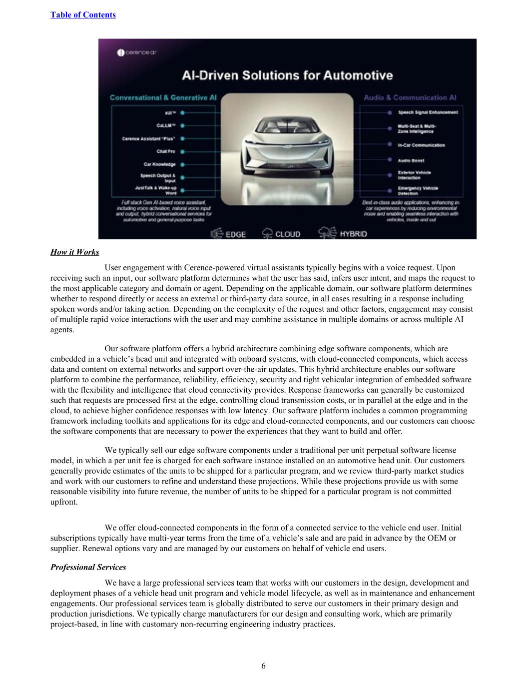How it Works User engagement with Cerence-powered virtual assistants typically begins with a voice request. Upon receiving such an input, our software platform determines what the user has said, infers user intent, and maps the request to the most applicable category and domain or agent. Depending on the applicable domain, our software platform determines whether to respond directly or access an external or third-party data source, in all cases resulting in a response including spoken words and/or taking action. Depending on the complexity of the request and other factors, engagement may consist of multiple rapid voice interactions with the user and may combine assistance in multiple domains or across multiple AI agents. Our software platform offers a hybrid architecture combining edge software components, which are embedded in a vehicle’s head unit and integrated with onboard systems, with cloud-connected components, which access data and content on external networks and support over-the-air updates. This hybrid architecture enables our software platform to combine the performance, reliability, efficiency, security and tight vehicular integration of embedded software with the flexibility and intelligence that cloud connectivity provides. Response frameworks can generally be customized such that requests are processed first at the edge, controlling cloud transmission costs, or in parallel at the edge and in the cloud, to achieve higher confidence responses with low latency. Our software platform includes a common programming framework including toolkits and applications for its edge and cloud-connected components, and our customers can choose the software components that are necessary to power the experiences that they want to build and offer. We typically sell our edge software components under a traditional per unit perpetual software license model, in which a per unit fee is charged for each software instance installed on an automotive head unit. Our customers generally provide estimates of the units to be shipped for a particular program, and we review third-party market studies and work with our customers to refine and understand these projections. While these projections provide us with some reasonable visibility into future revenue, the number of units to be shipped for a particular program is not committed upfront. We offer cloud-connected components in the form of a connected service to the vehicle end user. Initial subscriptions typically have multi-year terms from the time of a vehicle’s sale and are paid in advance by the OEM or supplier. Renewal options vary and are managed by our customers on behalf of vehicle end users. Professional Services We have a large professional services team that works with our customers in the design, development and deployment phases of a vehicle head unit program and vehicle model lifecycle, as well as in maintenance and enhancement engagements. Our professional services team is globally distributed to serve our customers in their primary design and production jurisdictions. We typically charge manufacturers for our design and consulting work, which are primarily project-based, in line with customary non-recurring engineering industry practices. Table of Contents 6