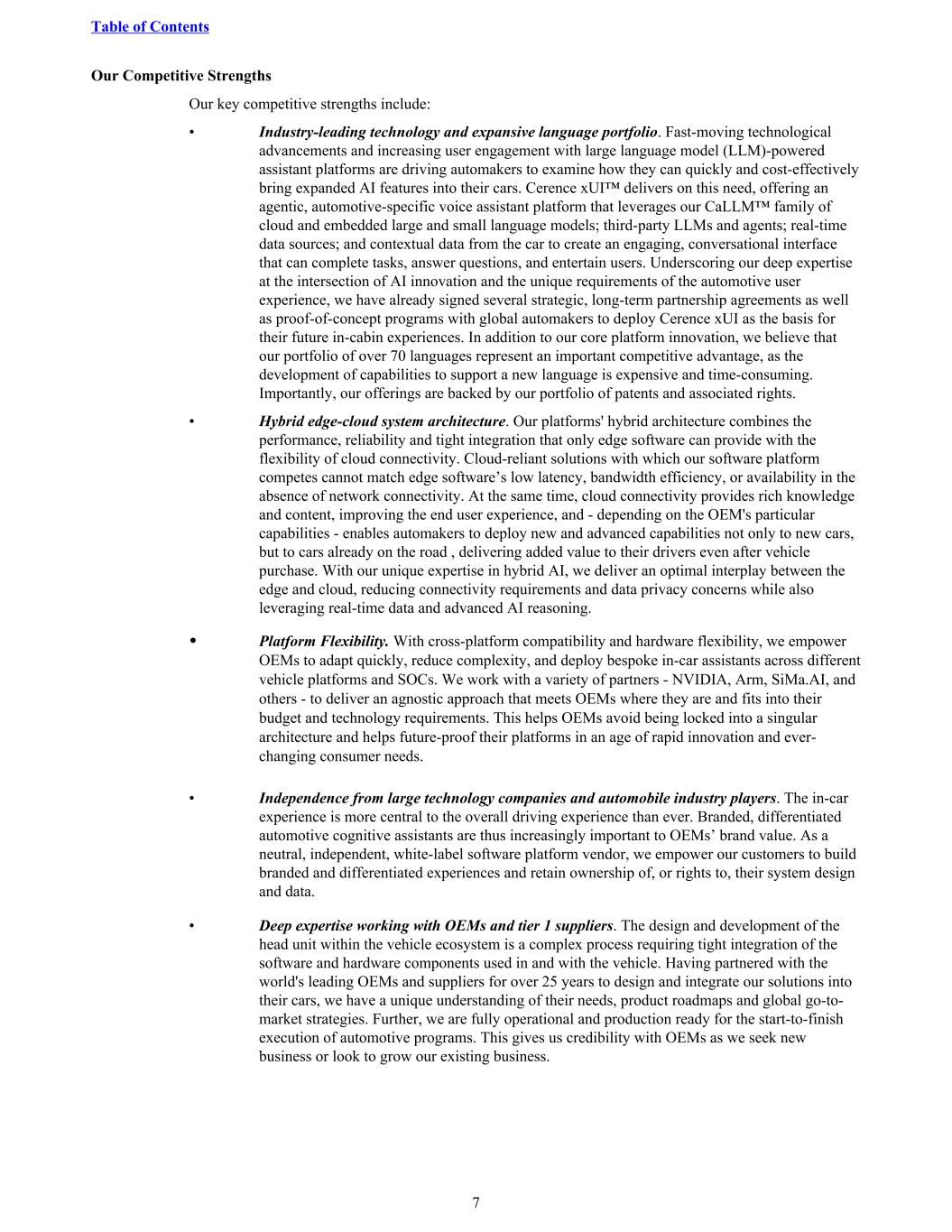 Our Competitive Strengths Our key competitive strengths include: • Industry-leading technology and expansive language portfolio. Fast-moving technological advancements and increasing user engagement with large language model (LLM)-powered assistant platforms are driving automakers to examine how they can quickly and cost-effectively bring expanded AI features into their cars. Cerence xUI™ delivers on this need, offering an agentic, automotive-specific voice assistant platform that leverages our CaLLM™ family of cloud and embedded large and small language models; third-party LLMs and agents; real-time data sources; and contextual data from the car to create an engaging, conversational interface that can complete tasks, answer questions, and entertain users. Underscoring our deep expertise at the intersection of AI innovation and the unique requirements of the automotive user experience, we have already signed several strategic, long-term partnership agreements as well as proof-of-concept programs with global automakers to deploy Cerence xUI as the basis for their future in-cabin experiences. In addition to our core platform innovation, we believe that our portfolio of over 70 languages represent an important competitive advantage, as the development of capabilities to support a new language is expensive and time-consuming. Importantly, our offerings are backed by our portfolio of patents and associated rights. • Hybrid edge-cloud system architecture. Our platforms' hybrid architecture combines the performance, reliability and tight integration that only edge software can provide with the flexibility of cloud connectivity. Cloud-reliant solutions with which our software platform competes cannot match edge software’s low latency, bandwidth efficiency, or availability in the absence of network connectivity. At the same time, cloud connectivity provides rich knowledge and content, improving the end user experience, and - depending on the OEM's particular capabilities - enables automakers to deploy new and advanced capabilities not only to new cars, but to cars already on the road , delivering added value to their drivers even after vehicle purchase. With our unique expertise in hybrid AI, we deliver an optimal interplay between the edge and cloud, reducing connectivity requirements and data privacy concerns while also leveraging real-time data and advanced AI reasoning. • Platform Flexibility. With cross-platform compatibility and hardware flexibility, we empower OEMs to adapt quickly, reduce complexity, and deploy bespoke in-car assistants across different vehicle platforms and SOCs. We work with a variety of partners - NVIDIA, Arm, SiMa.AI, and others - to deliver an agnostic approach that meets OEMs where they are and fits into their budget and technology requirements. This helps OEMs avoid being locked into a singular architecture and helps future-proof their platforms in an age of rapid innovation and ever- changing consumer needs. • Independence from large technology companies and automobile industry players. The in-car experience is more central to the overall driving experience than ever. Branded, differentiated automotive cognitive assistants are thus increasingly important to OEMs’ brand value. As a neutral, independent, white-label software platform vendor, we empower our customers to build branded and differentiated experiences and retain ownership of, or rights to, their system design and data. • Deep expertise working with OEMs and tier 1 suppliers. The design and development of the head unit within the vehicle ecosystem is a complex process requiring tight integration of the software and hardware components used in and with the vehicle. Having partnered with the world's leading OEMs and suppliers for over 25 years to design and integrate our solutions into their cars, we have a unique understanding of their needs, product roadmaps and global go-to- market strategies. Further, we are fully operational and production ready for the start-to-finish execution of automotive programs. This gives us credibility with OEMs as we seek new business or look to grow our existing business. Table of Contents 7
