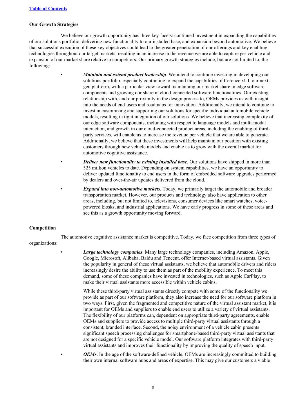 Our Growth Strategies We believe our growth opportunity has three key facets: continued investment in expanding the capabilities of our solutions portfolio, delivering new functionality to our installed base, and expansion beyond automotive. We believe that successful execution of these key objectives could lead to the greater penetration of our offerings and key enabling technologies throughout our target markets, resulting in an increase in the revenue we are able to capture per vehicle and expansion of our market share relative to competitors. Our primary growth strategies include, but are not limited to, the following: • Maintain and extend product leadership. We intend to continue investing in developing our solutions portfolio, especially continuing to expand the capabilities of Cerence xUI, our next- gen platform, with a particular view toward maintaining our market share in edge software components and growing our share in cloud-connected software functionalities. Our existing relationship with, and our proximity in the design process to, OEMs provides us with insight into the needs of end-users and roadmaps for innovation. Additionally, we intend to continue to invest in customizing and supporting our solutions for specific individual automobile vehicle models, resulting in tight integration of our solutions. We believe that increasing complexity of our edge software components, including with respect to language models and multi-modal interaction, and growth in our cloud-connected product areas, including the enabling of third- party services, will enable us to increase the revenue per vehicle that we are able to generate. Additionally, we believe that these investments will help maintain our position with existing customers through new vehicle models and enable us to grow with the overall market for automotive cognitive assistance. • Deliver new functionality to existing installed base. Our solutions have shipped in more than 525 million vehicles to date. Depending on system capabilities, we have an opportunity to deliver updated functionality to end users in the form of embedded software upgrades performed by dealers and over-the-air updates delivered from the cloud. • Expand into non-automotive markets. Today, we primarily target the automobile and broader transportation market. However, our products and technology also have application to other areas, including, but not limited to, televisions, consumer devices like smart watches, voice- powered kiosks, and industrial applications. We have early progress in some of these areas and see this as a growth opportunity moving forward. Competition The automotive cognitive assistance market is competitive. Today, we face competition from three types of organizations: • Large technology companies. Many large technology companies, including Amazon, Apple, Google, Microsoft, Alibaba, Baidu and Tencent, offer Internet-based virtual assistants. Given the popularity in general of these virtual assistants, we believe that automobile drivers and riders increasingly desire the ability to use them as part of the mobility experience. To meet this demand, some of these companies have invested in technologies, such as Apple CarPlay, to make their virtual assistants more accessible within vehicle cabins. While these third-party virtual assistants directly compete with some of the functionality we provide as part of our software platform, they also increase the need for our software platform in two ways. First, given the fragmented and competitive nature of the virtual assistant market, it is important for OEMs and suppliers to enable end users to utilize a variety of virtual assistants. The flexibility of our platforms can, dependent on appropriate third-party agreements, enable OEMs and suppliers to provide access to multiple third-party virtual assistants through a consistent, branded interface. Second, the noisy environment of a vehicle cabin presents significant speech processing challenges for smartphone-based third-party virtual assistants that are not designed for a specific vehicle model. Our software platform integrates with third-party virtual assistants and improves their functionality by improving the quality of speech input. • OEMs. In the age of the software-defined vehicle, OEMs are increasingly committed to building their own internal software hubs and areas of expertise. This may give our customers a viable Table of Contents 8