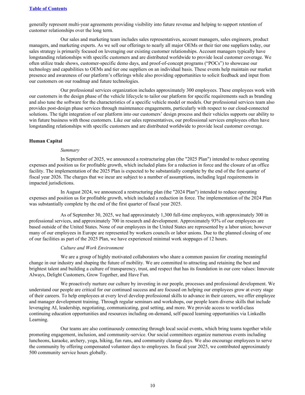 generally represent multi-year agreements providing visibility into future revenue and helping to support retention of customer relationships over the long term. Our sales and marketing team includes sales representatives, account managers, sales engineers, product managers, and marketing experts. As we sell our offerings to nearly all major OEMs or their tier one suppliers today, our sales strategy is primarily focused on leveraging our existing customer relationships. Account managers typically have longstanding relationships with specific customers and are distributed worldwide to provide local customer coverage. We often utilize trade shows, customer-specific demo days, and proof-of-concept programs (“POCs”) to showcase our technology and capabilities to OEMs and tier one suppliers on an individual basis. These events help maintain our market presence and awareness of our platform’s offerings while also providing opportunities to solicit feedback and input from our customers on our roadmap and future technologies. Our professional services organization includes approximately 300 employees. These employees work with our customers in the design phase of the vehicle lifecycle to tailor our platform for specific requirements such as branding and also tune the software for the characteristics of a specific vehicle model or models. Our professional services team also provides post-design phase services through maintenance engagements, particularly with respect to our cloud-connected solutions. The tight integration of our platform into our customers’ design process and their vehicles supports our ability to win future business with those customers. Like our sales representatives, our professional services employees often have longstanding relationships with specific customers and are distributed worldwide to provide local customer coverage. Human Capital Summary In September of 2025, we announced a restructuring plan (the "2025 Plan") intended to reduce operating expenses and position us for profitable growth, which included plans for a reduction in force and the closure of an office facility. The implementation of the 2025 Plan is expected to be substantially complete by the end of the first quarter of fiscal year 2026. The charges that we incur are subject to a number of assumptions, including legal requirements in impacted jurisdictions. In August 2024, we announced a restructuring plan (the "2024 Plan") intended to reduce operating expenses and position us for profitable growth, which included a reduction in force. The implementation of the 2024 Plan was substantially complete by the end of the first quarter of fiscal year 2025. As of September 30, 2025, we had approximately 1,300 full-time employees, with approximately 300 in professional services, and approximately 700 in research and development. Approximately 93% of our employees are based outside of the United States. None of our employees in the United States are represented by a labor union; however many of our employees in Europe are represented by workers councils or labor unions. Due to the planned closing of one of our facilities as part of the 2025 Plan, we have experienced minimal work stoppages of 12 hours. Culture and Work Environment We are a group of highly motivated collaborators who share a common passion for creating meaningful change in our industry and shaping the future of mobility. We are committed to attracting and retaining the best and brightest talent and building a culture of transparency, trust, and respect that has its foundation in our core values: Innovate Always, Delight Customers, Grow Together, and Have Fun. We proactively nurture our culture by investing in our people, processes and professional development. We understand our people are critical for our continued success and are focused on helping our employees grow at every stage of their careers. To help employees at every level develop professional skills to advance in their careers, we offer employee and manager development training. Through regular seminars and workshops, our people learn diverse skills that include leveraging AI, leadership, negotiating, communicating, goal setting, and more. We provide access to world-class continuing education opportunities and resources including on-demand, self-paced learning opportunities via LinkedIn Learning. Our teams are also continuously connecting through local social events, which bring teams together while promoting engagement, inclusion, and community-service. Our social committees organize numerous events including luncheons, karaoke, archery, yoga, hiking, fun runs, and community cleanup days. We also encourage employees to serve the community by offering compensated volunteer days to employees. In fiscal year 2025, we contributed approximately 500 community service hours globally. Table of Contents 10