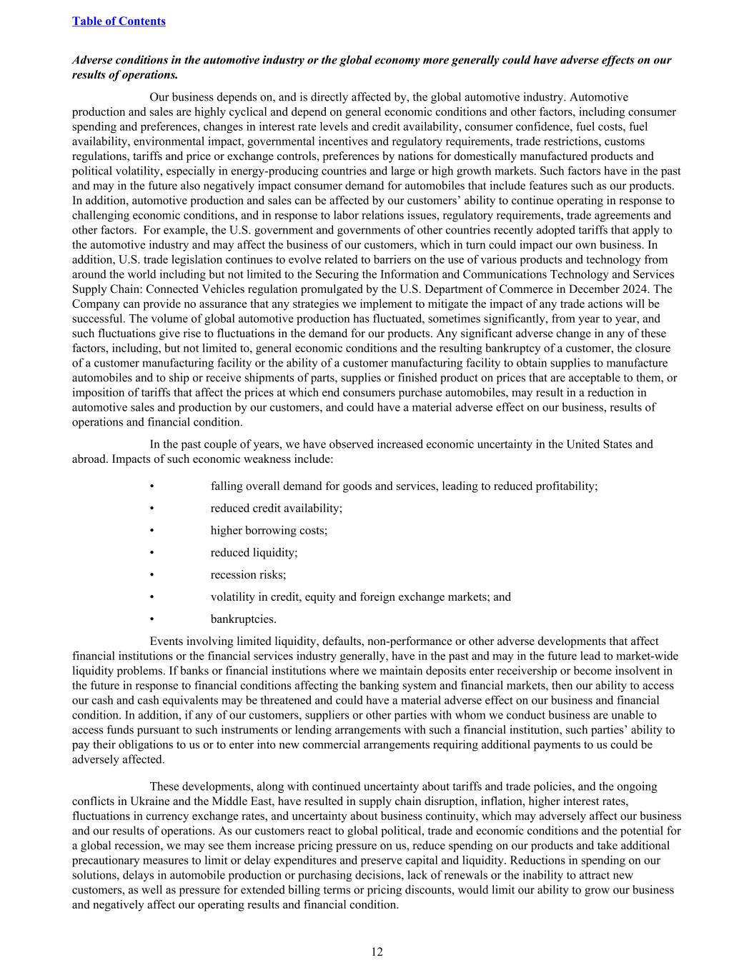 Adverse conditions in the automotive industry or the global economy more generally could have adverse effects on our results of operations. Our business depends on, and is directly affected by, the global automotive industry. Automotive production and sales are highly cyclical and depend on general economic conditions and other factors, including consumer spending and preferences, changes in interest rate levels and credit availability, consumer confidence, fuel costs, fuel availability, environmental impact, governmental incentives and regulatory requirements, trade restrictions, customs regulations, tariffs and price or exchange controls, preferences by nations for domestically manufactured products and political volatility, especially in energy-producing countries and large or high growth markets. Such factors have in the past and may in the future also negatively impact consumer demand for automobiles that include features such as our products. In addition, automotive production and sales can be affected by our customers’ ability to continue operating in response to challenging economic conditions, and in response to labor relations issues, regulatory requirements, trade agreements and other factors. For example, the U.S. government and governments of other countries recently adopted tariffs that apply to the automotive industry and may affect the business of our customers, which in turn could impact our own business. In addition, U.S. trade legislation continues to evolve related to barriers on the use of various products and technology from around the world including but not limited to the Securing the Information and Communications Technology and Services Supply Chain: Connected Vehicles regulation promulgated by the U.S. Department of Commerce in December 2024. The Company can provide no assurance that any strategies we implement to mitigate the impact of any trade actions will be successful. The volume of global automotive production has fluctuated, sometimes significantly, from year to year, and such fluctuations give rise to fluctuations in the demand for our products. Any significant adverse change in any of these factors, including, but not limited to, general economic conditions and the resulting bankruptcy of a customer, the closure of a customer manufacturing facility or the ability of a customer manufacturing facility to obtain supplies to manufacture automobiles and to ship or receive shipments of parts, supplies or finished product on prices that are acceptable to them, or imposition of tariffs that affect the prices at which end consumers purchase automobiles, may result in a reduction in automotive sales and production by our customers, and could have a material adverse effect on our business, results of operations and financial condition. In the past couple of years, we have observed increased economic uncertainty in the United States and abroad. Impacts of such economic weakness include: • falling overall demand for goods and services, leading to reduced profitability; • reduced credit availability; • higher borrowing costs; • reduced liquidity; • recession risks; • volatility in credit, equity and foreign exchange markets; and • bankruptcies. Events involving limited liquidity, defaults, non-performance or other adverse developments that affect financial institutions or the financial services industry generally, have in the past and may in the future lead to market-wide liquidity problems. If banks or financial institutions where we maintain deposits enter receivership or become insolvent in the future in response to financial conditions affecting the banking system and financial markets, then our ability to access our cash and cash equivalents may be threatened and could have a material adverse effect on our business and financial condition. In addition, if any of our customers, suppliers or other parties with whom we conduct business are unable to access funds pursuant to such instruments or lending arrangements with such a financial institution, such parties’ ability to pay their obligations to us or to enter into new commercial arrangements requiring additional payments to us could be adversely affected. These developments, along with continued uncertainty about tariffs and trade policies, and the ongoing conflicts in Ukraine and the Middle East, have resulted in supply chain disruption, inflation, higher interest rates, fluctuations in currency exchange rates, and uncertainty about business continuity, which may adversely affect our business and our results of operations. As our customers react to global political, trade and economic conditions and the potential for a global recession, we may see them increase pricing pressure on us, reduce spending on our products and take additional precautionary measures to limit or delay expenditures and preserve capital and liquidity. Reductions in spending on our solutions, delays in automobile production or purchasing decisions, lack of renewals or the inability to attract new customers, as well as pressure for extended billing terms or pricing discounts, would limit our ability to grow our business and negatively affect our operating results and financial condition. Table of Contents 12