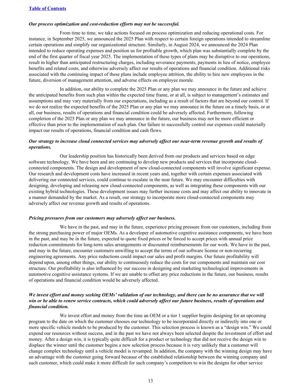 Our process optimization and cost-reduction efforts may not be successful. From time to time, we take actions focused on process optimization and reducing operational costs. For instance, in September 2025, we announced the 2025 Plan with respect to certain foreign operations intended to streamline certain operations and simplify our organizational structure. Similarly, in August 2024, we announced the 2024 Plan intended to reduce operating expenses and position us for profitable growth, which plan was substantially complete by the end of the first quarter of fiscal year 2025. The implementation of these types of plans may be disruptive to our operations, result in higher than anticipated restructuring charges, including severance payments, payments in lieu of notice, employee benefits and related costs, and otherwise adversely affect our results of operations and financial condition. Additional risks associated with the continuing impact of these plans include employee attrition, the ability to hire new employees in the future, diversion of management attention, and adverse effects on employee morale. In addition, our ability to complete the 2025 Plan or any plan we may announce in the future and achieve the anticipated benefits from such plan within the expected time frame, or at all, is subject to management’s estimates and assumptions and may vary materially from our expectations, including as a result of factors that are beyond our control. If we do not realize the expected benefits of the 2025 Plan or any plan we may announce in the future on a timely basis, or at all, our business, results of operations and financial condition could be adversely affected. Furthermore, following completion of the 2025 Plan or any plan we may announce in the future, our business may not be more efficient or effective than prior to the implementation of such plan. Our failure to successfully control our expenses could materially impact our results of operations, financial condition and cash flows. Our strategy to increase cloud connected services may adversely affect our near-term revenue growth and results of operations. Our leadership position has historically been derived from our products and services based on edge software technology. We have been and are continuing to develop new products and services that incorporate cloud- connected components. The design and development of new cloud-connected components will involve significant expense. Our research and development costs have increased in recent years and, together with certain expenses associated with delivering our connected services, could continue to escalate in the near future. We may encounter difficulties with designing, developing and releasing new cloud-connected components, as well as integrating these components with our existing hybrid technologies. These development issues may further increase costs and may affect our ability to innovate in a manner demanded by the market. As a result, our strategy to incorporate more cloud-connected components may adversely affect our revenue growth and results of operations. Pricing pressures from our customers may adversely affect our business. We have in the past, and may in the future, experience pricing pressure from our customers, including from the strong purchasing power of major OEMs. As a developer of automotive cognitive assistance components, we have been in the past, and may be in the future, expected to quote fixed prices or be forced to accept prices with annual price reduction commitments for long-term sales arrangements or discounted reimbursements for our work. We have in the past, and may in the future, encounter customers unwilling to accept the terms of our software license or non-recurring engineering agreements. Any price reductions could impact our sales and profit margins. Our future profitability will depend upon, among other things, our ability to continuously reduce the costs for our components and maintain our cost structure. Our profitability is also influenced by our success in designing and marketing technological improvements in automotive cognitive assistance systems. If we are unable to offset any price reductions in the future, our business, results of operations and financial condition would be adversely affected. We invest effort and money seeking OEMs’ validation of our technology, and there can be no assurance that we will win or be able to renew service contracts, which could adversely affect our future business, results of operations and financial condition. We invest effort and money from the time an OEM or a tier 1 supplier begins designing for an upcoming program to the date on which the customer chooses our technology to be incorporated directly or indirectly into one or more specific vehicle models to be produced by the customer. This selection process is known as a “design win.” We could expend our resources without success, and in the past we have not always been selected despite the investment of effort and money. After a design win, it is typically quite difficult for a product or technology that did not receive the design win to displace the winner until the customer begins a new selection process because it is very unlikely that a customer will change complex technology until a vehicle model is revamped. In addition, the company with the winning design may have an advantage with the customer going forward because of the established relationship between the winning company and such customer, which could make it more difficult for such company’s competitors to win the designs for other service Table of Contents 13