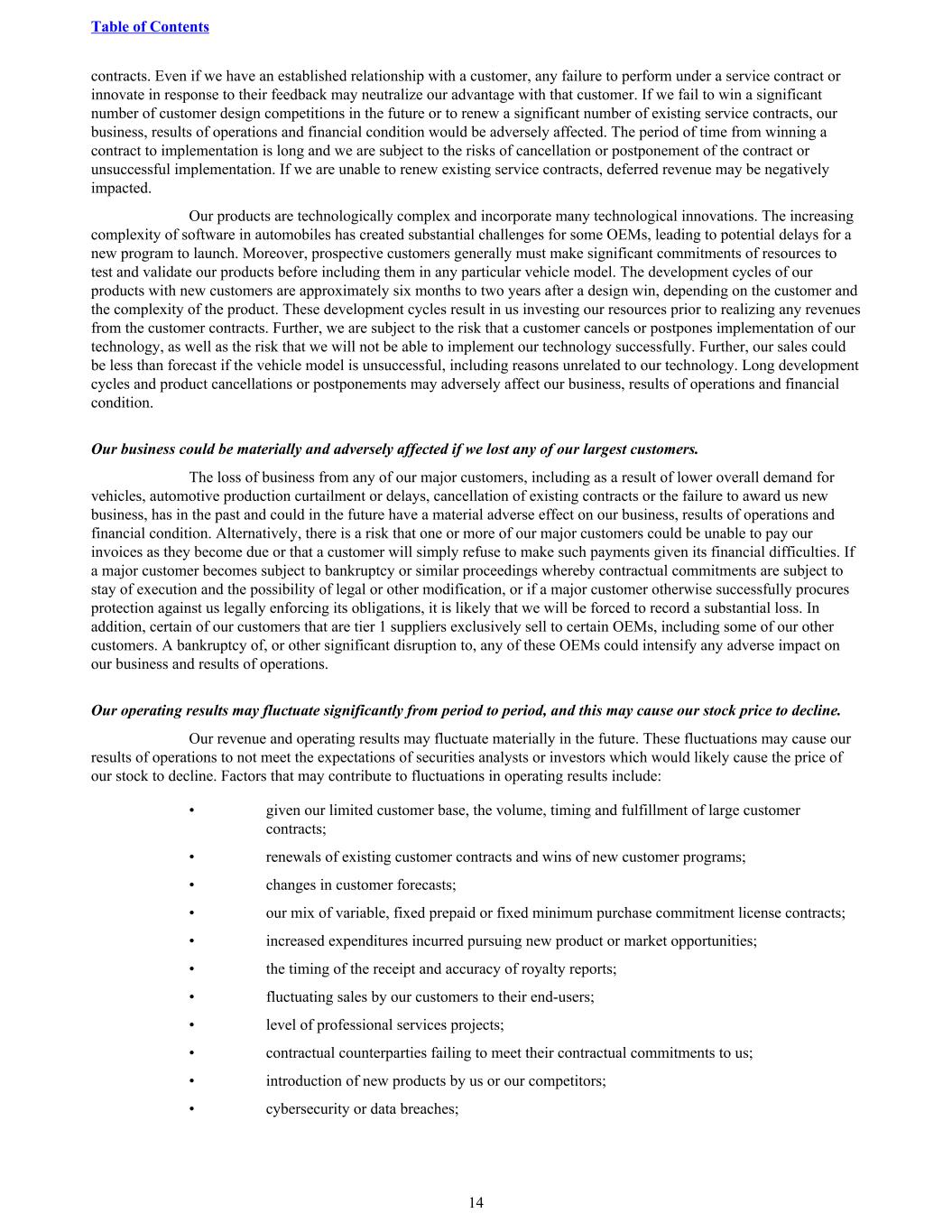 contracts. Even if we have an established relationship with a customer, any failure to perform under a service contract or innovate in response to their feedback may neutralize our advantage with that customer. If we fail to win a significant number of customer design competitions in the future or to renew a significant number of existing service contracts, our business, results of operations and financial condition would be adversely affected. The period of time from winning a contract to implementation is long and we are subject to the risks of cancellation or postponement of the contract or unsuccessful implementation. If we are unable to renew existing service contracts, deferred revenue may be negatively impacted. Our products are technologically complex and incorporate many technological innovations. The increasing complexity of software in automobiles has created substantial challenges for some OEMs, leading to potential delays for a new program to launch. Moreover, prospective customers generally must make significant commitments of resources to test and validate our products before including them in any particular vehicle model. The development cycles of our products with new customers are approximately six months to two years after a design win, depending on the customer and the complexity of the product. These development cycles result in us investing our resources prior to realizing any revenues from the customer contracts. Further, we are subject to the risk that a customer cancels or postpones implementation of our technology, as well as the risk that we will not be able to implement our technology successfully. Further, our sales could be less than forecast if the vehicle model is unsuccessful, including reasons unrelated to our technology. Long development cycles and product cancellations or postponements may adversely affect our business, results of operations and financial condition. Our business could be materially and adversely affected if we lost any of our largest customers. The loss of business from any of our major customers, including as a result of lower overall demand for vehicles, automotive production curtailment or delays, cancellation of existing contracts or the failure to award us new business, has in the past and could in the future have a material adverse effect on our business, results of operations and financial condition. Alternatively, there is a risk that one or more of our major customers could be unable to pay our invoices as they become due or that a customer will simply refuse to make such payments given its financial difficulties. If a major customer becomes subject to bankruptcy or similar proceedings whereby contractual commitments are subject to stay of execution and the possibility of legal or other modification, or if a major customer otherwise successfully procures protection against us legally enforcing its obligations, it is likely that we will be forced to record a substantial loss. In addition, certain of our customers that are tier 1 suppliers exclusively sell to certain OEMs, including some of our other customers. A bankruptcy of, or other significant disruption to, any of these OEMs could intensify any adverse impact on our business and results of operations. Our operating results may fluctuate significantly from period to period, and this may cause our stock price to decline. Our revenue and operating results may fluctuate materially in the future. These fluctuations may cause our results of operations to not meet the expectations of securities analysts or investors which would likely cause the price of our stock to decline. Factors that may contribute to fluctuations in operating results include: • given our limited customer base, the volume, timing and fulfillment of large customer contracts; • renewals of existing customer contracts and wins of new customer programs; • changes in customer forecasts; • our mix of variable, fixed prepaid or fixed minimum purchase commitment license contracts; • increased expenditures incurred pursuing new product or market opportunities; • the timing of the receipt and accuracy of royalty reports; • fluctuating sales by our customers to their end-users; • level of professional services projects; • contractual counterparties failing to meet their contractual commitments to us; • introduction of new products by us or our competitors; • cybersecurity or data breaches; Table of Contents 14