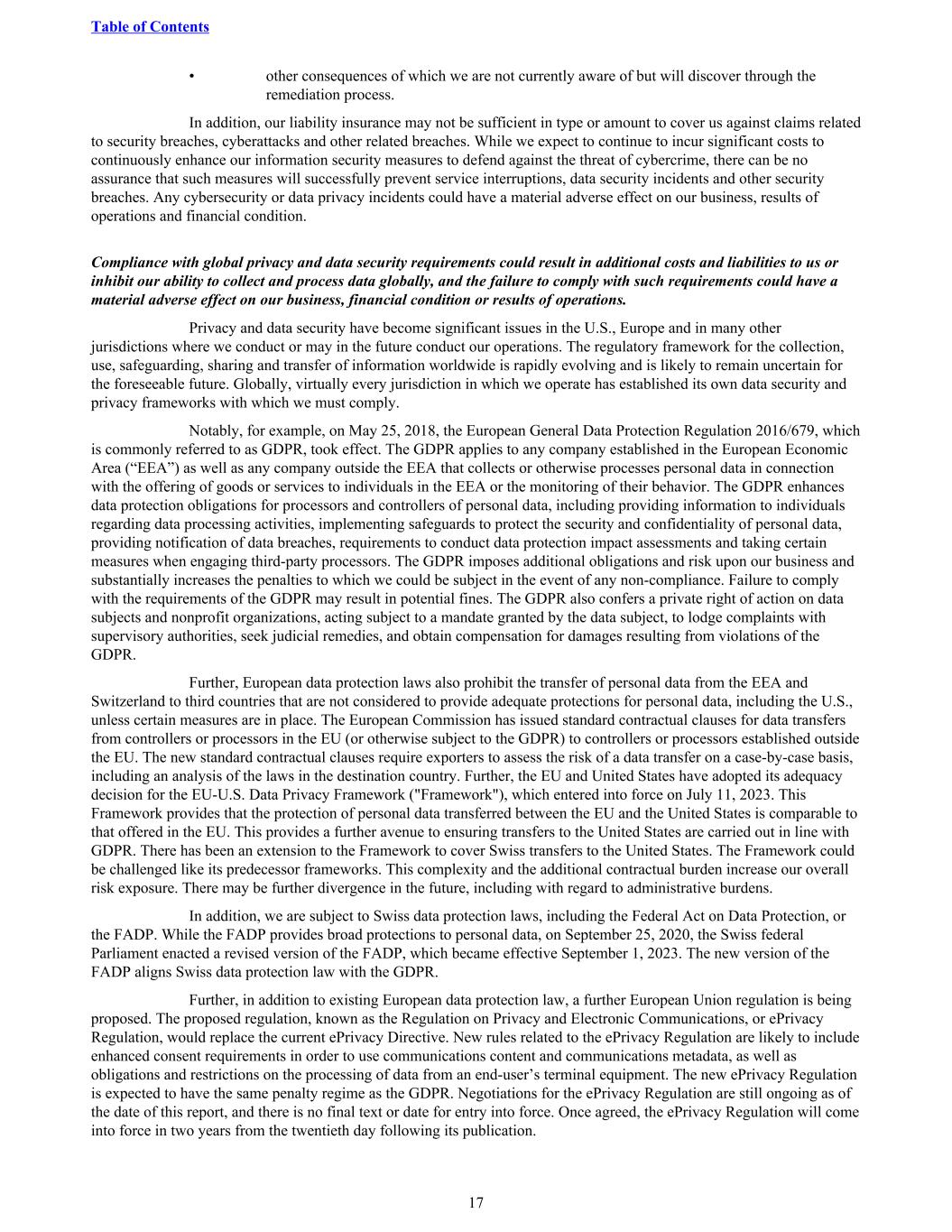 • other consequences of which we are not currently aware of but will discover through the remediation process. In addition, our liability insurance may not be sufficient in type or amount to cover us against claims related to security breaches, cyberattacks and other related breaches. While we expect to continue to incur significant costs to continuously enhance our information security measures to defend against the threat of cybercrime, there can be no assurance that such measures will successfully prevent service interruptions, data security incidents and other security breaches. Any cybersecurity or data privacy incidents could have a material adverse effect on our business, results of operations and financial condition. Compliance with global privacy and data security requirements could result in additional costs and liabilities to us or inhibit our ability to collect and process data globally, and the failure to comply with such requirements could have a material adverse effect on our business, financial condition or results of operations. Privacy and data security have become significant issues in the U.S., Europe and in many other jurisdictions where we conduct or may in the future conduct our operations. The regulatory framework for the collection, use, safeguarding, sharing and transfer of information worldwide is rapidly evolving and is likely to remain uncertain for the foreseeable future. Globally, virtually every jurisdiction in which we operate has established its own data security and privacy frameworks with which we must comply. Notably, for example, on May 25, 2018, the European General Data Protection Regulation 2016/679, which is commonly referred to as GDPR, took effect. The GDPR applies to any company established in the European Economic Area (“EEA”) as well as any company outside the EEA that collects or otherwise processes personal data in connection with the offering of goods or services to individuals in the EEA or the monitoring of their behavior. The GDPR enhances data protection obligations for processors and controllers of personal data, including providing information to individuals regarding data processing activities, implementing safeguards to protect the security and confidentiality of personal data, providing notification of data breaches, requirements to conduct data protection impact assessments and taking certain measures when engaging third-party processors. The GDPR imposes additional obligations and risk upon our business and substantially increases the penalties to which we could be subject in the event of any non-compliance. Failure to comply with the requirements of the GDPR may result in potential fines. The GDPR also confers a private right of action on data subjects and nonprofit organizations, acting subject to a mandate granted by the data subject, to lodge complaints with supervisory authorities, seek judicial remedies, and obtain compensation for damages resulting from violations of the GDPR. Further, European data protection laws also prohibit the transfer of personal data from the EEA and Switzerland to third countries that are not considered to provide adequate protections for personal data, including the U.S., unless certain measures are in place. The European Commission has issued standard contractual clauses for data transfers from controllers or processors in the EU (or otherwise subject to the GDPR) to controllers or processors established outside the EU. The new standard contractual clauses require exporters to assess the risk of a data transfer on a case-by-case basis, including an analysis of the laws in the destination country. Further, the EU and United States have adopted its adequacy decision for the EU-U.S. Data Privacy Framework ("Framework"), which entered into force on July 11, 2023. This Framework provides that the protection of personal data transferred between the EU and the United States is comparable to that offered in the EU. This provides a further avenue to ensuring transfers to the United States are carried out in line with GDPR. There has been an extension to the Framework to cover Swiss transfers to the United States. The Framework could be challenged like its predecessor frameworks. This complexity and the additional contractual burden increase our overall risk exposure. There may be further divergence in the future, including with regard to administrative burdens. In addition, we are subject to Swiss data protection laws, including the Federal Act on Data Protection, or the FADP. While the FADP provides broad protections to personal data, on September 25, 2020, the Swiss federal Parliament enacted a revised version of the FADP, which became effective September 1, 2023. The new version of the FADP aligns Swiss data protection law with the GDPR. Further, in addition to existing European data protection law, a further European Union regulation is being proposed. The proposed regulation, known as the Regulation on Privacy and Electronic Communications, or ePrivacy Regulation, would replace the current ePrivacy Directive. New rules related to the ePrivacy Regulation are likely to include enhanced consent requirements in order to use communications content and communications metadata, as well as obligations and restrictions on the processing of data from an end-user’s terminal equipment. The new ePrivacy Regulation is expected to have the same penalty regime as the GDPR. Negotiations for the ePrivacy Regulation are still ongoing as of the date of this report, and there is no final text or date for entry into force. Once agreed, the ePrivacy Regulation will come into force in two years from the twentieth day following its publication. Table of Contents 17