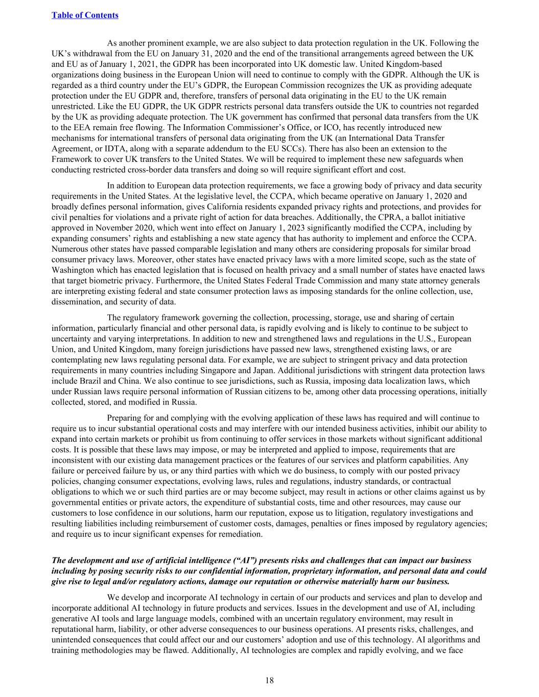 As another prominent example, we are also subject to data protection regulation in the UK. Following the UK’s withdrawal from the EU on January 31, 2020 and the end of the transitional arrangements agreed between the UK and EU as of January 1, 2021, the GDPR has been incorporated into UK domestic law. United Kingdom-based organizations doing business in the European Union will need to continue to comply with the GDPR. Although the UK is regarded as a third country under the EU’s GDPR, the European Commission recognizes the UK as providing adequate protection under the EU GDPR and, therefore, transfers of personal data originating in the EU to the UK remain unrestricted. Like the EU GDPR, the UK GDPR restricts personal data transfers outside the UK to countries not regarded by the UK as providing adequate protection. The UK government has confirmed that personal data transfers from the UK to the EEA remain free flowing. The Information Commissioner’s Office, or ICO, has recently introduced new mechanisms for international transfers of personal data originating from the UK (an International Data Transfer Agreement, or IDTA, along with a separate addendum to the EU SCCs). There has also been an extension to the Framework to cover UK transfers to the United States. We will be required to implement these new safeguards when conducting restricted cross-border data transfers and doing so will require significant effort and cost. In addition to European data protection requirements, we face a growing body of privacy and data security requirements in the United States. At the legislative level, the CCPA, which became operative on January 1, 2020 and broadly defines personal information, gives California residents expanded privacy rights and protections, and provides for civil penalties for violations and a private right of action for data breaches. Additionally, the CPRA, a ballot initiative approved in November 2020, which went into effect on January 1, 2023 significantly modified the CCPA, including by expanding consumers’ rights and establishing a new state agency that has authority to implement and enforce the CCPA. Numerous other states have passed comparable legislation and many others are considering proposals for similar broad consumer privacy laws. Moreover, other states have enacted privacy laws with a more limited scope, such as the state of Washington which has enacted legislation that is focused on health privacy and a small number of states have enacted laws that target biometric privacy. Furthermore, the United States Federal Trade Commission and many state attorney generals are interpreting existing federal and state consumer protection laws as imposing standards for the online collection, use, dissemination, and security of data. The regulatory framework governing the collection, processing, storage, use and sharing of certain information, particularly financial and other personal data, is rapidly evolving and is likely to continue to be subject to uncertainty and varying interpretations. In addition to new and strengthened laws and regulations in the U.S., European Union, and United Kingdom, many foreign jurisdictions have passed new laws, strengthened existing laws, or are contemplating new laws regulating personal data. For example, we are subject to stringent privacy and data protection requirements in many countries including Singapore and Japan. Additional jurisdictions with stringent data protection laws include Brazil and China. We also continue to see jurisdictions, such as Russia, imposing data localization laws, which under Russian laws require personal information of Russian citizens to be, among other data processing operations, initially collected, stored, and modified in Russia. Preparing for and complying with the evolving application of these laws has required and will continue to require us to incur substantial operational costs and may interfere with our intended business activities, inhibit our ability to expand into certain markets or prohibit us from continuing to offer services in those markets without significant additional costs. It is possible that these laws may impose, or may be interpreted and applied to impose, requirements that are inconsistent with our existing data management practices or the features of our services and platform capabilities. Any failure or perceived failure by us, or any third parties with which we do business, to comply with our posted privacy policies, changing consumer expectations, evolving laws, rules and regulations, industry standards, or contractual obligations to which we or such third parties are or may become subject, may result in actions or other claims against us by governmental entities or private actors, the expenditure of substantial costs, time and other resources, may cause our customers to lose confidence in our solutions, harm our reputation, expose us to litigation, regulatory investigations and resulting liabilities including reimbursement of customer costs, damages, penalties or fines imposed by regulatory agencies; and require us to incur significant expenses for remediation. The development and use of artificial intelligence (“AI”) presents risks and challenges that can impact our business including by posing security risks to our confidential information, proprietary information, and personal data and could give rise to legal and/or regulatory actions, damage our reputation or otherwise materially harm our business. We develop and incorporate AI technology in certain of our products and services and plan to develop and incorporate additional AI technology in future products and services. Issues in the development and use of AI, including generative AI tools and large language models, combined with an uncertain regulatory environment, may result in reputational harm, liability, or other adverse consequences to our business operations. AI presents risks, challenges, and unintended consequence