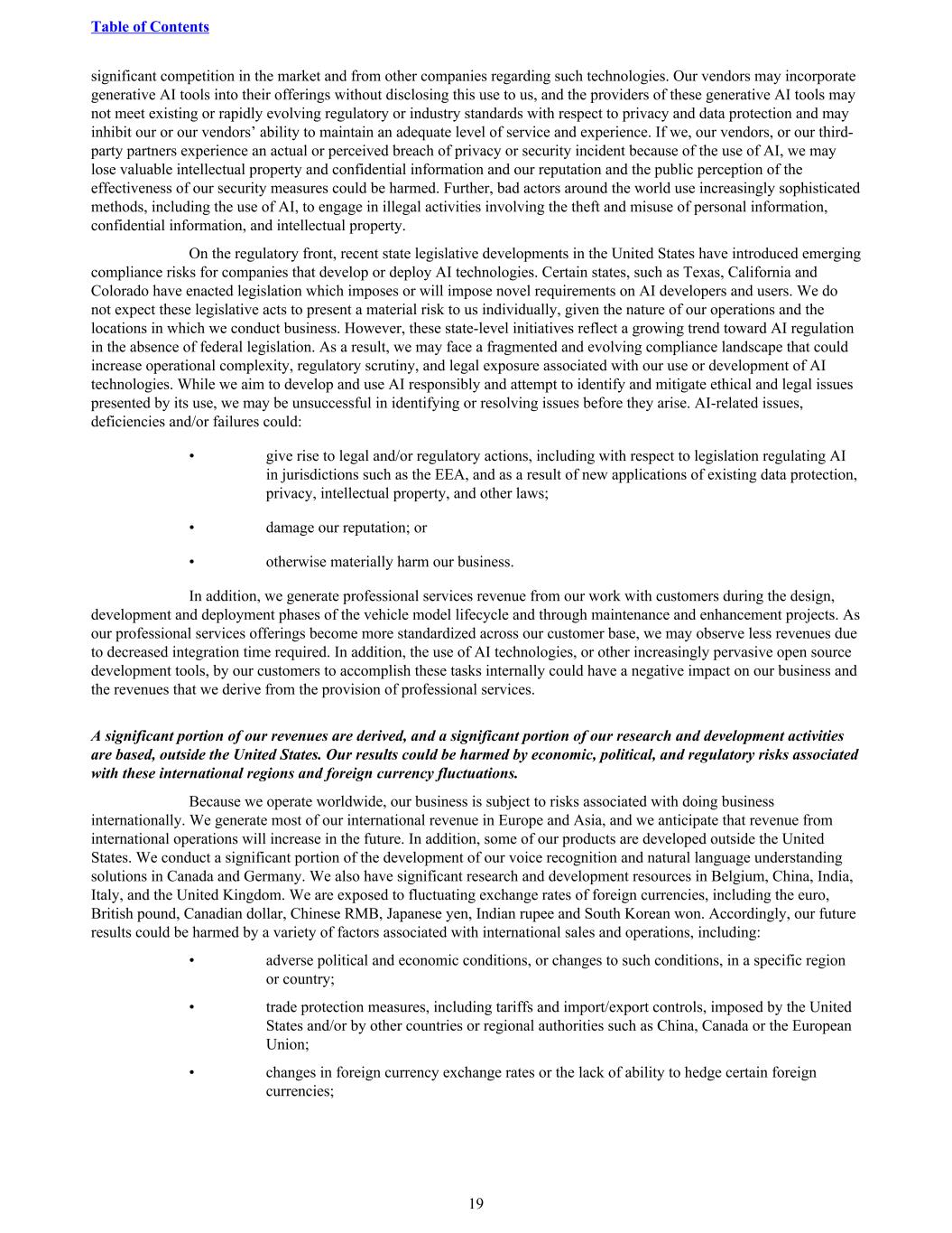 significant competition in the market and from other companies regarding such technologies. Our vendors may incorporate generative AI tools into their offerings without disclosing this use to us, and the providers of these generative AI tools may not meet existing or rapidly evolving regulatory or industry standards with respect to privacy and data protection and may inhibit our or our vendors’ ability to maintain an adequate level of service and experience. If we, our vendors, or our third- party partners experience an actual or perceived breach of privacy or security incident because of the use of AI, we may lose valuable intellectual property and confidential information and our reputation and the public perception of the effectiveness of our security measures could be harmed. Further, bad actors around the world use increasingly sophisticated methods, including the use of AI, to engage in illegal activities involving the theft and misuse of personal information, confidential information, and intellectual property. On the regulatory front, recent state legislative developments in the United States have introduced emerging compliance risks for companies that develop or deploy AI technologies. Certain states, such as Texas, California and Colorado have enacted legislation which imposes or will impose novel requirements on AI developers and users. We do not expect these legislative acts to present a material risk to us individually, given the nature of our operations and the locations in which we conduct business. However, these state-level initiatives reflect a growing trend toward AI regulation in the absence of federal legislation. As a result, we may face a fragmented and evolving compliance landscape that could increase operational complexity, regulatory scrutiny, and legal exposure associated with our use or development of AI technologies. While we aim to develop and use AI responsibly and attempt to identify and mitigate ethical and legal issues presented by its use, we may be unsuccessful in identifying or resolving issues before they arise. AI-related issues, deficiencies and/or failures could: • give rise to legal and/or regulatory actions, including with respect to legislation regulating AI in jurisdictions such as the EEA, and as a result of new applications of existing data protection, privacy, intellectual property, and other laws; • damage our reputation; or • otherwise materially harm our business. In addition, we generate professional services revenue from our work with customers during the design, development and deployment phases of the vehicle model lifecycle and through maintenance and enhancement projects. As our professional services offerings become more standardized across our customer base, we may observe less revenues due to decreased integration time required. In addition, the use of AI technologies, or other increasingly pervasive open source development tools, by our customers to accomplish these tasks internally could have a negative impact on our business and the revenues that we derive from the provision of professional services. A significant portion of our revenues are derived, and a significant portion of our research and development activities are based, outside the United States. Our results could be harmed by economic, political, and regulatory risks associated with these international regions and foreign currency fluctuations. Because we operate worldwide, our business is subject to risks associated with doing business internationally. We generate most of our international revenue in Europe and Asia, and we anticipate that revenue from international operations will increase in the future. In addition, some of our products are developed outside the United States. We conduct a significant portion of the development of our voice recognition and natural language understanding solutions in Canada and Germany. We also have significant research and development resources in Belgium, China, India, Italy, and the United Kingdom. We are exposed to fluctuating exchange rates of foreign currencies, including the euro, British pound, Canadian dollar, Chinese RMB, Japanese yen, Indian rupee and South Korean won. Accordingly, our future results could be harmed by a variety of factors associated with international sales and operations, including: • adverse political and economic conditions, or changes to such conditions, in a specific region or country; • trade protection measures, including tariffs and import/export controls, imposed by the United States and/or by other countries or regional authorities such as China, Canada or the European Union; • changes in foreign currency exchange rates or the lack of ability to hedge certain foreign currencies; Table of Contents 19