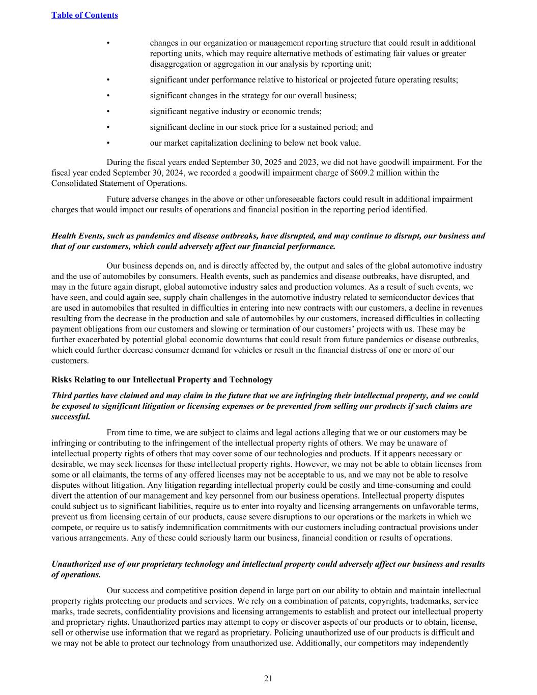 • changes in our organization or management reporting structure that could result in additional reporting units, which may require alternative methods of estimating fair values or greater disaggregation or aggregation in our analysis by reporting unit; • significant under performance relative to historical or projected future operating results; • significant changes in the strategy for our overall business; • significant negative industry or economic trends; • significant decline in our stock price for a sustained period; and • our market capitalization declining to below net book value. During the fiscal years ended September 30, 2025 and 2023, we did not have goodwill impairment. For the fiscal year ended September 30, 2024, we recorded a goodwill impairment charge of $609.2 million within the Consolidated Statement of Operations. Future adverse changes in the above or other unforeseeable factors could result in additional impairment charges that would impact our results of operations and financial position in the reporting period identified. Health Events, such as pandemics and disease outbreaks, have disrupted, and may continue to disrupt, our business and that of our customers, which could adversely affect our financial performance. Our business depends on, and is directly affected by, the output and sales of the global automotive industry and the use of automobiles by consumers. Health events, such as pandemics and disease outbreaks, have disrupted, and may in the future again disrupt, global automotive industry sales and production volumes. As a result of such events, we have seen, and could again see, supply chain challenges in the automotive industry related to semiconductor devices that are used in automobiles that resulted in difficulties in entering into new contracts with our customers, a decline in revenues resulting from the decrease in the production and sale of automobiles by our customers, increased difficulties in collecting payment obligations from our customers and slowing or termination of our customers’ projects with us. These may be further exacerbated by potential global economic downturns that could result from future pandemics or disease outbreaks, which could further decrease consumer demand for vehicles or result in the financial distress of one or more of our customers. Risks Relating to our Intellectual Property and Technology Third parties have claimed and may claim in the future that we are infringing their intellectual property, and we could be exposed to significant litigation or licensing expenses or be prevented from selling our products if such claims are successful. From time to time, we are subject to claims and legal actions alleging that we or our customers may be infringing or contributing to the infringement of the intellectual property rights of others. We may be unaware of intellectual property rights of others that may cover some of our technologies and products. If it appears necessary or desirable, we may seek licenses for these intellectual property rights. However, we may not be able to obtain licenses from some or all claimants, the terms of any offered licenses may not be acceptable to us, and we may not be able to resolve disputes without litigation. Any litigation regarding intellectual property could be costly and time-consuming and could divert the attention of our management and key personnel from our business operations. Intellectual property disputes could subject us to significant liabilities, require us to enter into royalty and licensing arrangements on unfavorable terms, prevent us from licensing certain of our products, cause severe disruptions to our operations or the markets in which we compete, or require us to satisfy indemnification commitments with our customers including contractual provisions under various arrangements. Any of these could seriously harm our business, financial condition or results of operations. Unauthorized use of our proprietary technology and intellectual property could adversely affect our business and results of operations. Our success and competitive position depend in large part on our ability to obtain and maintain intellectual property rights protecting our products and services. We rely on a combination of patents, copyrights, trademarks, service marks, trade secrets, confidentiality provisions and licensing arrangements to establish and protect our intellectual property and proprietary rights. Unauthorized parties may attempt to copy or discover aspects of our products or to obtain, license, sell or otherwise use information that we regard as proprietary. Policing unauthorized use of our products is difficult and we may not be able to protect our technology from unauthorized use. Additionally, our competitors may independently Table of Contents 21