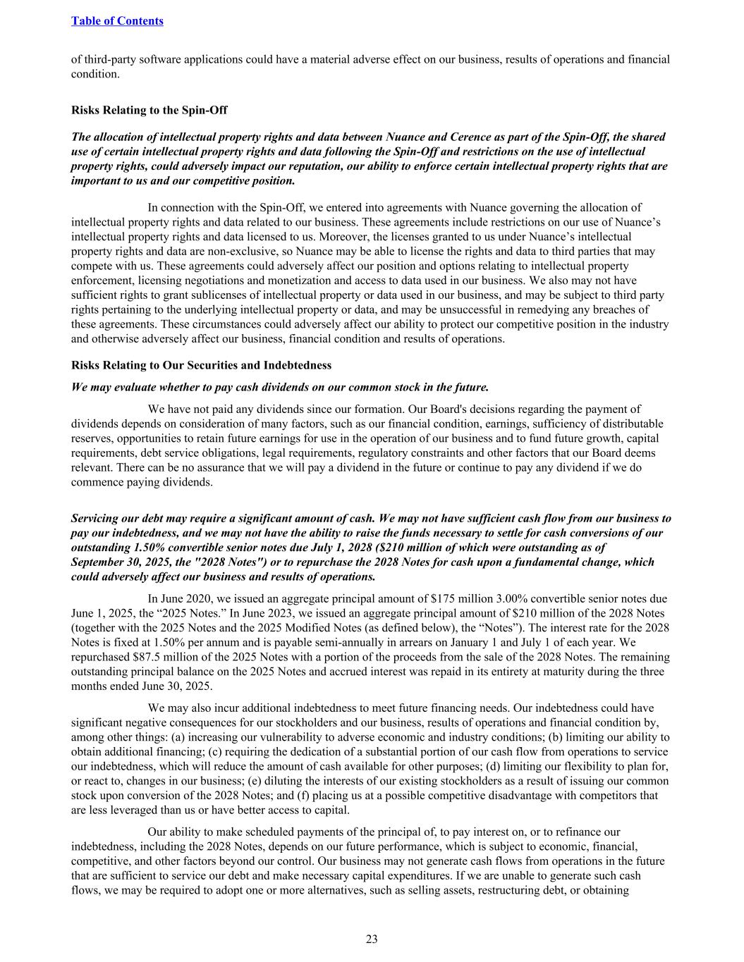 of third-party software applications could have a material adverse effect on our business, results of operations and financial condition. Risks Relating to the Spin-Off The allocation of intellectual property rights and data between Nuance and Cerence as part of the Spin-Off, the shared use of certain intellectual property rights and data following the Spin-Off and restrictions on the use of intellectual property rights, could adversely impact our reputation, our ability to enforce certain intellectual property rights that are important to us and our competitive position. In connection with the Spin-Off, we entered into agreements with Nuance governing the allocation of intellectual property rights and data related to our business. These agreements include restrictions on our use of Nuance’s intellectual property rights and data licensed to us. Moreover, the licenses granted to us under Nuance’s intellectual property rights and data are non-exclusive, so Nuance may be able to license the rights and data to third parties that may compete with us. These agreements could adversely affect our position and options relating to intellectual property enforcement, licensing negotiations and monetization and access to data used in our business. We also may not have sufficient rights to grant sublicenses of intellectual property or data used in our business, and may be subject to third party rights pertaining to the underlying intellectual property or data, and may be unsuccessful in remedying any breaches of these agreements. These circumstances could adversely affect our ability to protect our competitive position in the industry and otherwise adversely affect our business, financial condition and results of operations. Risks Relating to Our Securities and Indebtedness We may evaluate whether to pay cash dividends on our common stock in the future. We have not paid any dividends since our formation. Our Board's decisions regarding the payment of dividends depends on consideration of many factors, such as our financial condition, earnings, sufficiency of distributable reserves, opportunities to retain future earnings for use in the operation of our business and to fund future growth, capital requirements, debt service obligations, legal requirements, regulatory constraints and other factors that our Board deems relevant. There can be no assurance that we will pay a dividend in the future or continue to pay any dividend if we do commence paying dividends. Servicing our debt may require a significant amount of cash. We may not have sufficient cash flow from our business to pay our indebtedness, and we may not have the ability to raise the funds necessary to settle for cash conversions of our outstanding 1.50% convertible senior notes due July 1, 2028 ($210 million of which were outstanding as of September 30, 2025, the "2028 Notes") or to repurchase the 2028 Notes for cash upon a fundamental change, which could adversely affect our business and results of operations. In June 2020, we issued an aggregate principal amount of $175 million 3.00% convertible senior notes due June 1, 2025, the “2025 Notes.” In June 2023, we issued an aggregate principal amount of $210 million of the 2028 Notes (together with the 2025 Notes and the 2025 Modified Notes (as defined below), the “Notes”). The interest rate for the 2028 Notes is fixed at 1.50% per annum and is payable semi-annually in arrears on January 1 and July 1 of each year. We repurchased $87.5 million of the 2025 Notes with a portion of the proceeds from the sale of the 2028 Notes. The remaining outstanding principal balance on the 2025 Notes and accrued interest was repaid in its entirety at maturity during the three months ended June 30, 2025. We may also incur additional indebtedness to meet future financing needs. Our indebtedness could have significant negative consequences for our stockholders and our business, results of operations and financial condition by, among other things: (a) increasing our vulnerability to adverse economic and industry conditions; (b) limiting our ability to obtain additional financing; (c) requiring the dedication of a substantial portion of our cash flow from operations to service our indebtedness, which will reduce the amount of cash available for other purposes; (d) limiting our flexibility to plan for, or react to, changes in our business; (e) diluting the interests of our existing stockholders as a result of issuing our common stock upon conversion of the 2028 Notes; and (f) placing us at a possible competitive disadvantage with competitors that are less leveraged than us or have better access to capital. Our ability to make scheduled payments of the principal of, to pay interest on, or to refinance our indebtedness, including the 2028 Notes, depends on our future performance, which is subject to economic, financial, competitive, and other factors beyond our control. Our business may not generate cash flows from operations in the future that are sufficient to service our debt and make necessary capital expenditures. If we are unable to generate such cash flows, we may be required to adopt one or more alternatives, such as selling assets, restructuring debt, or obtaining Table of Contents 23