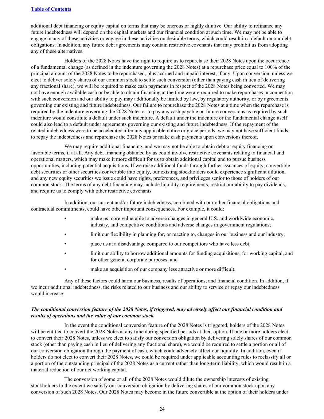 additional debt financing or equity capital on terms that may be onerous or highly dilutive. Our ability to refinance any future indebtedness will depend on the capital markets and our financial condition at such time. We may not be able to engage in any of these activities or engage in these activities on desirable terms, which could result in a default on our debt obligations. In addition, any future debt agreements may contain restrictive covenants that may prohibit us from adopting any of these alternatives. Holders of the 2028 Notes have the right to require us to repurchase their 2028 Notes upon the occurrence of a fundamental change (as defined in the indenture governing the 2028 Notes) at a repurchase price equal to 100% of the principal amount of the 2028 Notes to be repurchased, plus accrued and unpaid interest, if any. Upon conversion, unless we elect to deliver solely shares of our common stock to settle such conversion (other than paying cash in lieu of delivering any fractional share), we will be required to make cash payments in respect of the 2028 Notes being converted. We may not have enough available cash or be able to obtain financing at the time we are required to make repurchases in connection with such conversion and our ability to pay may additionally be limited by law, by regulatory authority, or by agreements governing our existing and future indebtedness. Our failure to repurchase the 2028 Notes at a time when the repurchase is required by the indenture governing the 2028 Notes or to pay any cash payable on future conversions as required by such indenture would constitute a default under such indenture. A default under the indenture or the fundamental change itself could also lead to a default under agreements governing our existing and future indebtedness. If the repayment of the related indebtedness were to be accelerated after any applicable notice or grace periods, we may not have sufficient funds to repay the indebtedness and repurchase the 2028 Notes or make cash payments upon conversions thereof. We may require additional financing, and we may not be able to obtain debt or equity financing on favorable terms, if at all. Any debt financing obtained by us could involve restrictive covenants relating to financial and operational matters, which may make it more difficult for us to obtain additional capital and to pursue business opportunities, including potential acquisitions. If we raise additional funds through further issuances of equity, convertible debt securities or other securities convertible into equity, our existing stockholders could experience significant dilution, and any new equity securities we issue could have rights, preferences, and privileges senior to those of holders of our common stock. The terms of any debt financing may include liquidity requirements, restrict our ability to pay dividends, and require us to comply with other restrictive covenants. In addition, our current and/or future indebtedness, combined with our other financial obligations and contractual commitments, could have other important consequences. For example, it could: • make us more vulnerable to adverse changes in general U.S. and worldwide economic, industry, and competitive conditions and adverse changes in government regulations; • limit our flexibility in planning for, or reacting to, changes in our business and our industry; • place us at a disadvantage compared to our competitors who have less debt; • limit our ability to borrow additional amounts for funding acquisitions, for working capital, and for other general corporate purposes; and • make an acquisition of our company less attractive or more difficult. Any of these factors could harm our business, results of operations, and financial condition. In addition, if we incur additional indebtedness, the risks related to our business and our ability to service or repay our indebtedness would increase. The conditional conversion feature of the 2028 Notes, if triggered, may adversely affect our financial condition and results of operations and the value of our common stock. In the event the conditional conversion feature of the 2028 Notes is triggered, holders of the 2028 Notes will be entitled to convert the 2028 Notes at any time during specified periods at their option. If one or more holders elect to convert their 2028 Notes, unless we elect to satisfy our conversion obligation by delivering solely shares of our common stock (other than paying cash in lieu of delivering any fractional share), we would be required to settle a portion or all of our conversion obligation through the payment of cash, which could adversely affect our liquidity. In addition, even if holders do not elect to convert their 2028 Notes, we could be required under applicable accounting rules to reclassify all or a portion of the outstanding principal of the 2028 Notes as a current rather than long-term liability, which would result in a material reduction of our net working capital. The conversion of some or all of the 2028 Notes would dilute the ownership interests of existing stockholders to the extent we satisfy our conversion obligation by delivering shares of our common stock upon any conversion of such 2028 Notes. Our 2028 Notes may become in the future convertible at the option of their holders under Table of Contents 24
