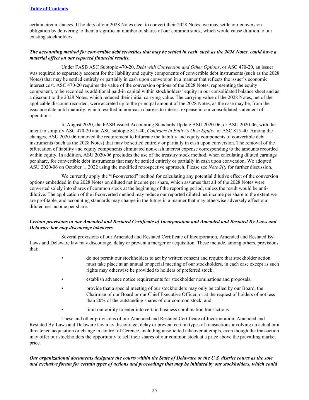 certain circumstances. If holders of our 2028 Notes elect to convert their 2028 Notes, we may settle our conversion obligation by delivering to them a significant number of shares of our common stock, which would cause dilution to our existing stockholders. The accounting method for convertible debt securities that may be settled in cash, such as the 2028 Notes, could have a material effect on our reported financial results. Under FASB ASC Subtopic 470-20, Debt with Conversion and Other Options, or ASC 470-20, an issuer was required to separately account for the liability and equity components of convertible debt instruments (such as the 2028 Notes) that may be settled entirely or partially in cash upon conversion in a manner that reflects the issuer’s economic interest cost. ASC 470-20 requires the value of the conversion options of the 2028 Notes, representing the equity component, to be recorded as additional paid-in capital within stockholders’ equity in our consolidated balance sheet and as a discount to the 2028 Notes, which reduced their initial carrying value. The carrying value of the 2028 Notes, net of the applicable discount recorded, were accreted up to the principal amount of the 2028 Notes, as the case may be, from the issuance date until maturity, which resulted in non-cash charges to interest expense in our consolidated statement of operations. In August 2020, the FASB issued Accounting Standards Update ASU 2020-06, or ASU 2020-06, with the intent to simplify ASC 470-20 and ASC subtopic 815-40, Contracts in Entity’s Own Equity, or ASC 815-40. Among the changes, ASU 2020-06 removed the requirement to bifurcate the liability and equity components of convertible debt instruments (such as the 2028 Notes) that may be settled entirely or partially in cash upon conversion. The removal of the bifurcation of liability and equity components eliminated non-cash interest expense corresponding to the amounts recorded within equity. In addition, ASU 2020-06 precludes the use of the treasury stock method, when calculating diluted earnings per share, for convertible debt instruments that may be settled entirely or partially in cash upon conversion. We adopted ASU 2020-06 on October 1, 2022 using the modified retrospective approach. Please see Note 2(t) for further discussion. We currently apply the “if-converted” method for calculating any potential dilutive effect of the conversion options embedded in the 2028 Notes on diluted net income per share, which assumes that all of the 2028 Notes were converted solely into shares of common stock at the beginning of the reporting period, unless the result would be anti- dilutive. The application of the if-converted method may reduce our reported diluted net income per share to the extent we are profitable, and accounting standards may change in the future in a manner that may otherwise adversely affect our diluted net income per share. Certain provisions in our Amended and Restated Certificate of Incorporation and Amended and Restated By-Laws and Delaware law may discourage takeovers. Several provisions of our Amended and Restated Certificate of Incorporation, Amended and Restated By- Laws and Delaware law may discourage, delay or prevent a merger or acquisition. These include, among others, provisions that: • do not permit our stockholders to act by written consent and require that stockholder action must take place at an annual or special meeting of our stockholders, in each case except as such rights may otherwise be provided to holders of preferred stock; • establish advance notice requirements for stockholder nominations and proposals; • provide that a special meeting of our stockholders may only be called by our Board, the Chairman of our Board or our Chief Executive Officer, or at the request of holders of not less than 20% of the outstanding shares of our common stock; and • limit our ability to enter into certain business combination transactions. These and other provisions of our Amended and Restated Certificate of Incorporation, Amended and Restated By-Laws and Delaware law may discourage, delay or prevent certain types of transactions involving an actual or a threatened acquisition or change in control of Cerence, including unsolicited takeover attempts, even though the transaction may offer our stockholders the opportunity to sell their shares of our common stock at a price above the prevailing market price. Our organizational documents designate the courts within the State of Delaware or the U.S. district courts as the sole and exclusive forum for certain types of actions and proceedings that may be initiated by our stockholders, which could Table of Contents 25