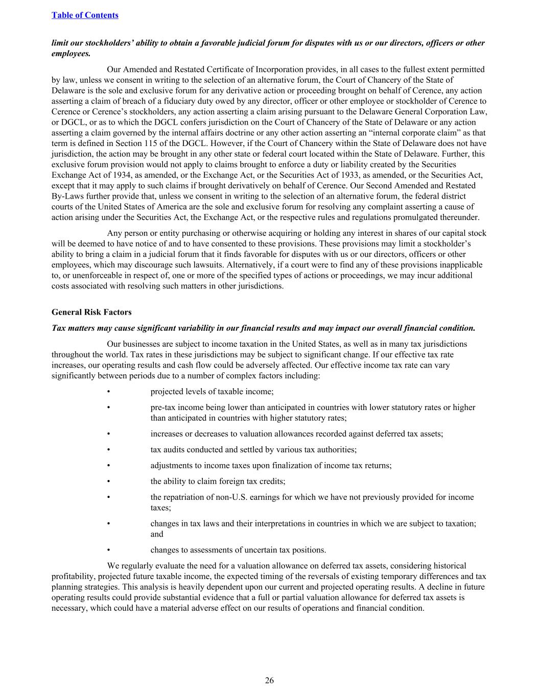 limit our stockholders’ ability to obtain a favorable judicial forum for disputes with us or our directors, officers or other employees. Our Amended and Restated Certificate of Incorporation provides, in all cases to the fullest extent permitted by law, unless we consent in writing to the selection of an alternative forum, the Court of Chancery of the State of Delaware is the sole and exclusive forum for any derivative action or proceeding brought on behalf of Cerence, any action asserting a claim of breach of a fiduciary duty owed by any director, officer or other employee or stockholder of Cerence to Cerence or Cerence’s stockholders, any action asserting a claim arising pursuant to the Delaware General Corporation Law, or DGCL, or as to which the DGCL confers jurisdiction on the Court of Chancery of the State of Delaware or any action asserting a claim governed by the internal affairs doctrine or any other action asserting an “internal corporate claim” as that term is defined in Section 115 of the DGCL. However, if the Court of Chancery within the State of Delaware does not have jurisdiction, the action may be brought in any other state or federal court located within the State of Delaware. Further, this exclusive forum provision would not apply to claims brought to enforce a duty or liability created by the Securities Exchange Act of 1934, as amended, or the Exchange Act, or the Securities Act of 1933, as amended, or the Securities Act, except that it may apply to such claims if brought derivatively on behalf of Cerence. Our Second Amended and Restated By-Laws further provide that, unless we consent in writing to the selection of an alternative forum, the federal district courts of the United States of America are the sole and exclusive forum for resolving any complaint asserting a cause of action arising under the Securities Act, the Exchange Act, or the respective rules and regulations promulgated thereunder. Any person or entity purchasing or otherwise acquiring or holding any interest in shares of our capital stock will be deemed to have notice of and to have consented to these provisions. These provisions may limit a stockholder’s ability to bring a claim in a judicial forum that it finds favorable for disputes with us or our directors, officers or other employees, which may discourage such lawsuits. Alternatively, if a court were to find any of these provisions inapplicable to, or unenforceable in respect of, one or more of the specified types of actions or proceedings, we may incur additional costs associated with resolving such matters in other jurisdictions. General Risk Factors Tax matters may cause significant variability in our financial results and may impact our overall financial condition. Our businesses are subject to income taxation in the United States, as well as in many tax jurisdictions throughout the world. Tax rates in these jurisdictions may be subject to significant change. If our effective tax rate increases, our operating results and cash flow could be adversely affected. Our effective income tax rate can vary significantly between periods due to a number of complex factors including: • projected levels of taxable income; • pre-tax income being lower than anticipated in countries with lower statutory rates or higher than anticipated in countries with higher statutory rates; • increases or decreases to valuation allowances recorded against deferred tax assets; • tax audits conducted and settled by various tax authorities; • adjustments to income taxes upon finalization of income tax returns; • the ability to claim foreign tax credits; • the repatriation of non-U.S. earnings for which we have not previously provided for income taxes; • changes in tax laws and their interpretations in countries in which we are subject to taxation; and • changes to assessments of uncertain tax positions. We regularly evaluate the need for a valuation allowance on deferred tax assets, considering historical profitability, projected future taxable income, the expected timing of the reversals of existing temporary differences and tax planning strategies. This analysis is heavily dependent upon our current and projected operating results. A decline in future operating results could provide substantial evidence that a full or partial valuation allowance for deferred tax assets is necessary, which could have a material adverse effect on our results of operations and financial condition. Table of Contents 26