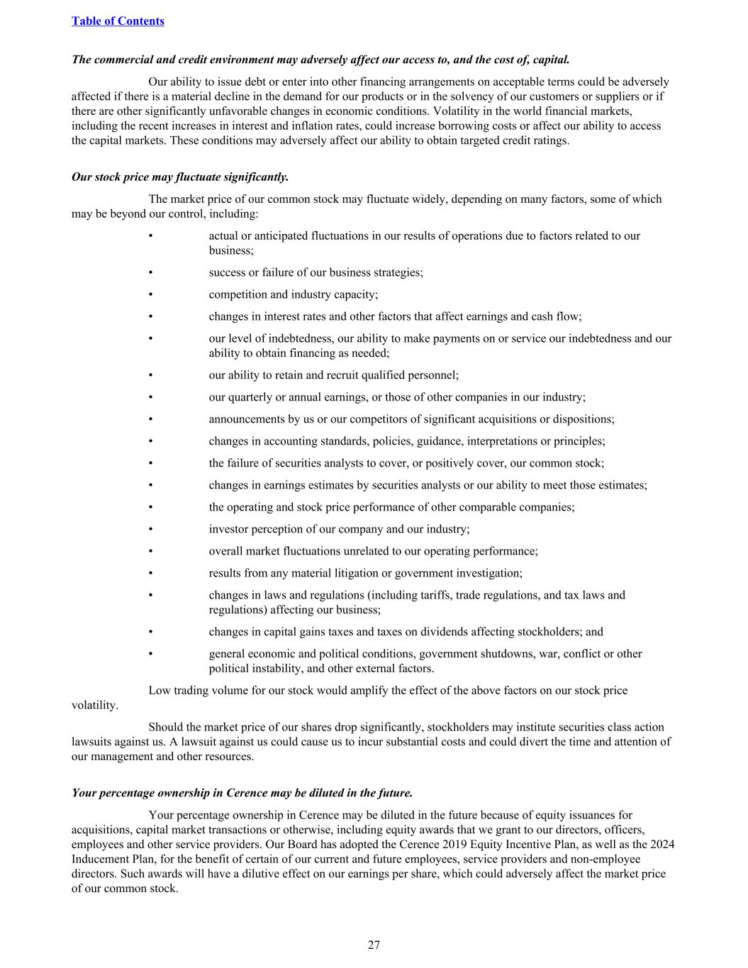 The commercial and credit environment may adversely affect our access to, and the cost of, capital. Our ability to issue debt or enter into other financing arrangements on acceptable terms could be adversely affected if there is a material decline in the demand for our products or in the solvency of our customers or suppliers or if there are other significantly unfavorable changes in economic conditions. Volatility in the world financial markets, including the recent increases in interest and inflation rates, could increase borrowing costs or affect our ability to access the capital markets. These conditions may adversely affect our ability to obtain targeted credit ratings. Our stock price may fluctuate significantly. The market price of our common stock may fluctuate widely, depending on many factors, some of which may be beyond our control, including: • actual or anticipated fluctuations in our results of operations due to factors related to our business; • success or failure of our business strategies; • competition and industry capacity; • changes in interest rates and other factors that affect earnings and cash flow; • our level of indebtedness, our ability to make payments on or service our indebtedness and our ability to obtain financing as needed; • our ability to retain and recruit qualified personnel; • our quarterly or annual earnings, or those of other companies in our industry; • announcements by us or our competitors of significant acquisitions or dispositions; • changes in accounting standards, policies, guidance, interpretations or principles; • the failure of securities analysts to cover, or positively cover, our common stock; • changes in earnings estimates by securities analysts or our ability to meet those estimates; • the operating and stock price performance of other comparable companies; • investor perception of our company and our industry; • overall market fluctuations unrelated to our operating performance; • results from any material litigation or government investigation; • changes in laws and regulations (including tariffs, trade regulations, and tax laws and regulations) affecting our business; • changes in capital gains taxes and taxes on dividends affecting stockholders; and • general economic and political conditions, government shutdowns, war, conflict or other political instability, and other external factors. Low trading volume for our stock would amplify the effect of the above factors on our stock price volatility. Should the market price of our shares drop significantly, stockholders may institute securities class action lawsuits against us. A lawsuit against us could cause us to incur substantial costs and could divert the time and attention of our management and other resources. Your percentage ownership in Cerence may be diluted in the future. Your percentage ownership in Cerence may be diluted in the future because of equity issuances for acquisitions, capital market transactions or otherwise, including equity awards that we grant to our directors, officers, employees and other service providers. Our Board has adopted the Cerence 2019 Equity Incentive Plan, as well as the 2024 Inducement Plan, for the benefit of certain of our current and future employees, service providers and non-employee directors. Such awards will have a dilutive effect on our earnings per share, which could adversely affect the market price of our common stock. Table of Contents 27