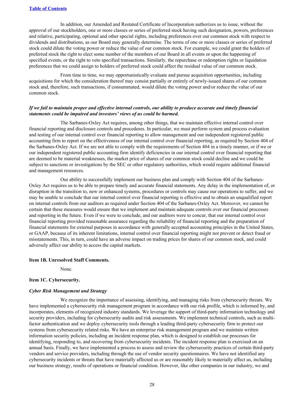 In addition, our Amended and Restated Certificate of Incorporation authorizes us to issue, without the approval of our stockholders, one or more classes or series of preferred stock having such designation, powers, preferences and relative, participating, optional and other special rights, including preferences over our common stock with respect to dividends and distributions, as our Board may generally determine. The terms of one or more classes or series of preferred stock could dilute the voting power or reduce the value of our common stock. For example, we could grant the holders of preferred stock the right to elect some number of the members of our Board in all events or upon the happening of specified events, or the right to veto specified transactions. Similarly, the repurchase or redemption rights or liquidation preferences that we could assign to holders of preferred stock could affect the residual value of our common stock. From time to time, we may opportunistically evaluate and pursue acquisition opportunities, including acquisitions for which the consideration thereof may consist partially or entirely of newly-issued shares of our common stock and, therefore, such transactions, if consummated, would dilute the voting power and/or reduce the value of our common stock. If we fail to maintain proper and effective internal controls, our ability to produce accurate and timely financial statements could be impaired and investors’ views of us could be harmed. The Sarbanes-Oxley Act requires, among other things, that we maintain effective internal control over financial reporting and disclosure controls and procedures. In particular, we must perform system and process evaluation and testing of our internal control over financial reporting to allow management and our independent registered public accounting firm to report on the effectiveness of our internal control over financial reporting, as required by Section 404 of the Sarbanes-Oxley Act. If we are not able to comply with the requirements of Section 404 in a timely manner, or if we or our independent registered public accounting firm identify deficiencies in our internal control over financial reporting that are deemed to be material weaknesses, the market price of shares of our common stock could decline and we could be subject to sanctions or investigations by the SEC or other regulatory authorities, which would require additional financial and management resources. Our ability to successfully implement our business plan and comply with Section 404 of the Sarbanes- Oxley Act requires us to be able to prepare timely and accurate financial statements. Any delay in the implementation of, or disruption in the transition to, new or enhanced systems, procedures or controls may cause our operations to suffer, and we may be unable to conclude that our internal control over financial reporting is effective and to obtain an unqualified report on internal controls from our auditors as required under Section 404 of the Sarbanes-Oxley Act. Moreover, we cannot be certain that these measures would ensure that we implement and maintain adequate controls over our financial processes and reporting in the future. Even if we were to conclude, and our auditors were to concur, that our internal control over financial reporting provided reasonable assurance regarding the reliability of financial reporting and the preparation of financial statements for external purposes in accordance with generally accepted accounting principles in the United States, or GAAP, because of its inherent limitations, internal control over financial reporting might not prevent or detect fraud or misstatements. This, in turn, could have an adverse impact on trading prices for shares of our common stock, and could adversely affect our ability to access the capital markets. Item 1B. Unresolved Staff Comments. None. Item 1C. Cybersecurity. Cyber Risk Management and Strategy We recognize the importance of assessing, identifying, and managing risks from cybersecurity threats. We have implemented a cybersecurity risk management program in accordance with our risk profile, which is informed by, and incorporates, elements of recognized industry standards. We leverage the support of third-party information technology and security providers, including for cybersecurity audits and risk assessments. We implement technical controls, such as multi- factor authentication and we deploy cybersecurity tools through a leading third-party cybersecurity firm to protect our systems from cybersecurity related risks. We have an enterprise risk management program and we maintain written information security policies, including an incident response plan, which is designed to establish our processes for identifying, responding to, and recovering from cybersecurity incidents. The incident response plan is exercised on an annual basis. Finally, we have implemented a process to assess and review the cybersecurity practices of certain third-party vendors and service providers, including through the use of vendor security questionnaires. We have not identified any cybersecurity incidents or threats that have materially affected us or are reasonably likely to materially affect us, including our business strategy, results of operations or financial condition. However, like other companies in our industry, we and Table of Contents 28
