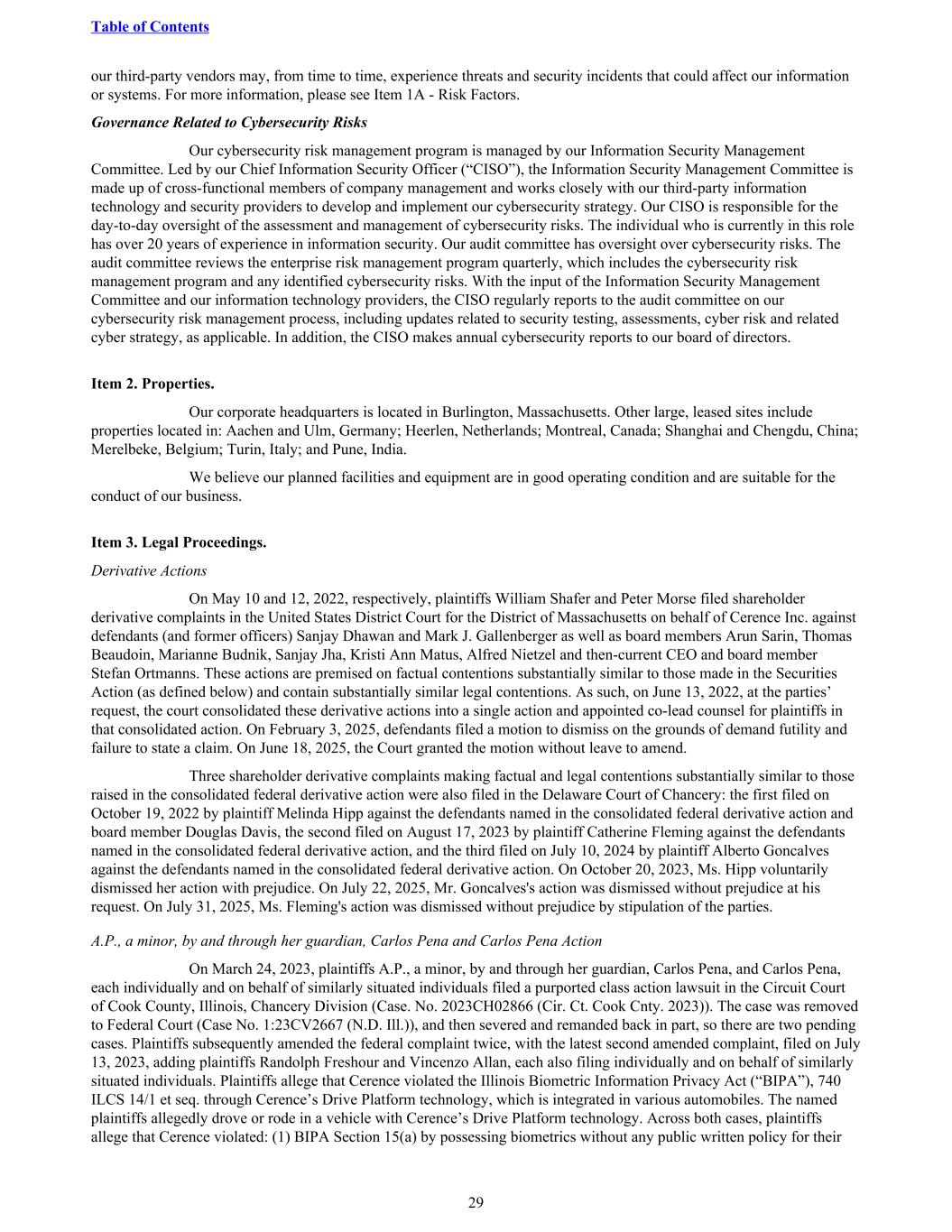 our third-party vendors may, from time to time, experience threats and security incidents that could affect our information or systems. For more information, please see Item 1A - Risk Factors. Governance Related to Cybersecurity Risks Our cybersecurity risk management program is managed by our Information Security Management Committee. Led by our Chief Information Security Officer (“CISO”), the Information Security Management Committee is made up of cross-functional members of company management and works closely with our third-party information technology and security providers to develop and implement our cybersecurity strategy. Our CISO is responsible for the day-to-day oversight of the assessment and management of cybersecurity risks. The individual who is currently in this role has over 20 years of experience in information security. Our audit committee has oversight over cybersecurity risks. The audit committee reviews the enterprise risk management program quarterly, which includes the cybersecurity risk management program and any identified cybersecurity risks. With the input of the Information Security Management Committee and our information technology providers, the CISO regularly reports to the audit committee on our cybersecurity risk management process, including updates related to security testing, assessments, cyber risk and related cyber strategy, as applicable. In addition, the CISO makes annual cybersecurity reports to our board of directors. Item 2. Properties. Our corporate headquarters is located in Burlington, Massachusetts. Other large, leased sites include properties located in: Aachen and Ulm, Germany; Heerlen, Netherlands; Montreal, Canada; Shanghai and Chengdu, China; Merelbeke, Belgium; Turin, Italy; and Pune, India. We believe our planned facilities and equipment are in good operating condition and are suitable for the conduct of our business. Item 3. Legal Proceedings. Derivative Actions On May 10 and 12, 2022, respectively, plaintiffs William Shafer and Peter Morse filed shareholder derivative complaints in the United States District Court for the District of Massachusetts on behalf of Cerence Inc. against defendants (and former officers) Sanjay Dhawan and Mark J. Gallenberger as well as board members Arun Sarin, Thomas Beaudoin, Marianne Budnik, Sanjay Jha, Kristi Ann Matus, Alfred Nietzel and then-current CEO and board member Stefan Ortmanns. These actions are premised on factual contentions substantially similar to those made in the Securities Action (as defined below) and contain substantially similar legal contentions. As such, on June 13, 2022, at the parties’ request, the court consolidated these derivative actions into a single action and appointed co-lead counsel for plaintiffs in that consolidated action. On February 3, 2025, defendants filed a motion to dismiss on the grounds of demand futility and failure to state a claim. On June 18, 2025, the Court granted the motion without leave to amend. Three shareholder derivative complaints making factual and legal contentions substantially similar to those raised in the consolidated federal derivative action were also filed in the Delaware Court of Chancery: the first filed on October 19, 2022 by plaintiff Melinda Hipp against the defendants named in the consolidated federal derivative action and board member Douglas Davis, the second filed on August 17, 2023 by plaintiff Catherine Fleming against the defendants named in the consolidated federal derivative action, and the third filed on July 10, 2024 by plaintiff Alberto Goncalves against the defendants named in the consolidated federal derivative action. On October 20, 2023, Ms. Hipp voluntarily dismissed her action with prejudice. On July 22, 2025, Mr. Goncalves's action was dismissed without prejudice at his request. On July 31, 2025, Ms. Fleming's action was dismissed without prejudice by stipulation of the parties. A.P., a minor, by and through her guardian, Carlos Pena and Carlos Pena Action On March 24, 2023, plaintiffs A.P., a minor, by and through her guardian, Carlos Pena, and Carlos Pena, each individually and on behalf of similarly situated individuals filed a purported class action lawsuit in the Circuit Court of Cook County, Illinois, Chancery Division (Case. No. 2023CH02866 (Cir. Ct. Cook Cnty. 2023)). The case was removed to Federal Court (Case No. 1:23CV2667 (N.D. Ill.)), and then severed and remanded back in part, so there are two pending cases. Plaintiffs subsequently amended the federal complaint twice, with the latest second amended complaint, filed on July 13, 2023, adding plaintiffs Randolph Freshour and Vincenzo Allan, each also filing individually and on behalf of similarly situated individuals. Plaintiffs allege that Cerence violated the Illinois Biometric Information Privacy Act (“BIPA”), 740 ILCS 14/1 et seq. through Cerence’s Drive Platform technology, which is integrated in various automobiles. The named plaintiffs allegedly drove or rode in a vehicle with Cerence’s Drive Platform technology. Across both cases, plaintiffs allege that Cerence violated: (1) BIPA Section 15(a) by possessing biometrics without any public written policy for their Table of Contents 29