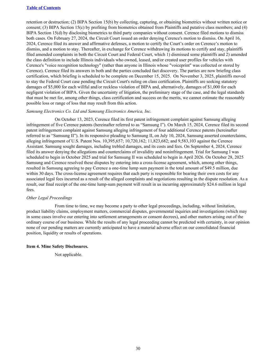 retention or destruction; (2) BIPA Section 15(b) by collecting, capturing, or obtaining biometrics without written notice or consent; (3) BIPA Section 15(c) by profiting from biometrics obtained from Plaintiffs and putative class members; and (4) BIPA Section 15(d) by disclosing biometrics to third party companies without consent. Cerence filed motions to dismiss both cases. On February 27, 2024, the Circuit Court issued an order denying Cerence's motion to dismiss. On April 16, 2024, Cerence filed its answer and affirmative defenses, a motion to certify the Court’s order on Cerence’s motion to dismiss, and a motion to stay. Thereafter, in exchange for Cerence withdrawing its motions to certify and stay, plaintiffs filed amended complaints in both the Circuit Court and Federal Court, which 1) dismissed some plaintiffs and 2) amended the class definition to include Illinois individuals who owned, leased, and/or created user profiles for vehicles with Cerence's "voice recognition technology" (rather than anyone in Illinois whose "voiceprint" was collected or stored by Cerence). Cerence filed its answers in both and the parties concluded fact discovery. The parties are now briefing class certification, which briefing is scheduled to be complete on December 15, 2025. On November 3, 2025, plaintiffs moved to stay the Federal Court case pending the Circuit Court's ruling on class certification. Plaintiffs are seeking statutory damages of $5,000 for each willful and/or reckless violation of BIPA and, alternatively, damages of $1,000 for each negligent violation of BIPA. Given the uncertainty of litigation, the preliminary stage of the case, and the legal standards that must be met for, among other things, class certification and success on the merits, we cannot estimate the reasonably possible loss or range of loss that may result from this action. Samsung Electronics Co. Ltd and Samsung Electronics America, Inc. On October 13, 2023, Cerence filed its first patent infringement complaint against Samsung alleging infringement of five Cerence patents (hereinafter referred to as “Samsung I”). On March 15, 2024, Cerence filed its second patent infringement complaint against Samsung alleging infringement of four additional Cerence patents (hereinafter referred to as “Samsung II”). In its responsive pleading to Samsung II, on July 10, 2024, Samsung asserted counterclaims, alleging infringement of U.S. Patent Nos. 10,395,657; 10,720,162; 11,823,682; and 9,583,103 against the Cerence Assistant. Samsung sought damages, including trebled damages, and its costs and fees. On September 4, 2024, Cerence filed its answer denying the allegations and counterclaims of invalidity and noninfringement. Trial for Samsung I was scheduled to begin in October 2025 and trial for Samsung II was scheduled to begin in April 2026. On October 28, 2025 Samsung and Cerence resolved these disputes by entering into a cross-license agreement, which, among other things, resulted in Samsung agreeing to pay Cerence a one-time lump sum payment in the total amount of $49.5 million, due within 30 days. The cross-license agreement requires that each party is responsible for bearing their own costs for any associated legal fees incurred as a result of the alleged complaints and negotiations resulting in the dispute resolution. As a result, our final receipt of the one-time lump-sum payment will result in us incurring approximately $24.6 million in legal fees. Other Legal Proceedings From time to time, we may become a party to other legal proceedings, including, without limitation, product liability claims, employment matters, commercial disputes, governmental inquiries and investigations (which may in some cases involve our entering into settlement arrangements or consent decrees), and other matters arising out of the ordinary course of our business. While the results of any legal proceeding cannot be predicted with certainty, in our opinion none of our pending matters are currently anticipated to have a material adverse effect on our consolidated financial position, liquidity or results of operations. Item 4. Mine Safety Disclosures. Not applicable. Table of Contents 30