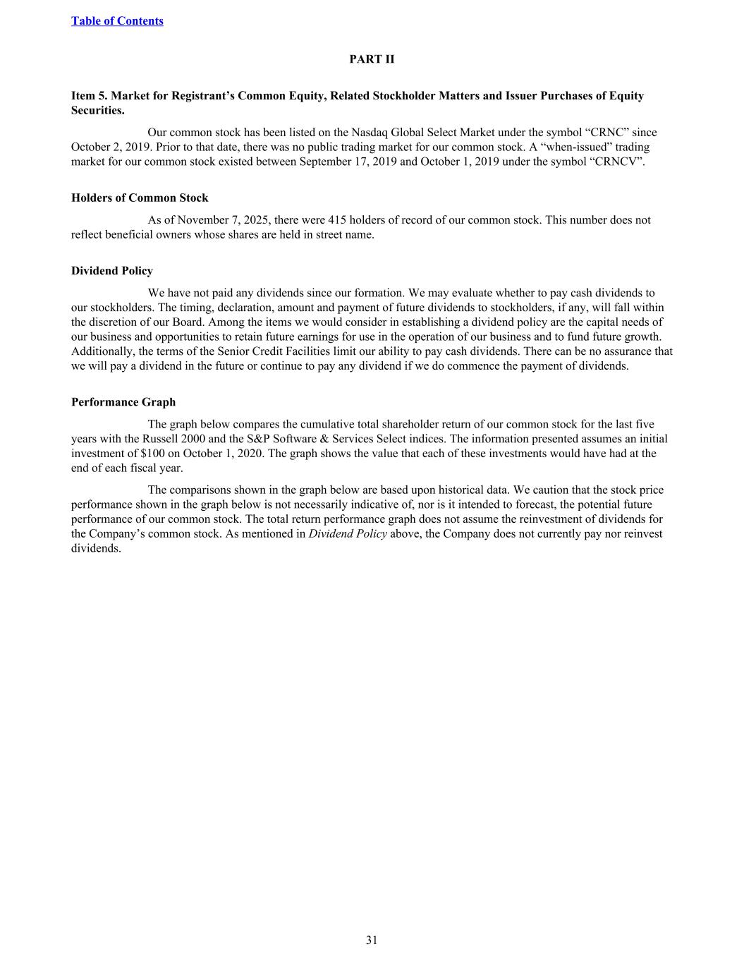 PART II Item 5. Market for Registrant’s Common Equity, Related Stockholder Matters and Issuer Purchases of Equity Securities. Our common stock has been listed on the Nasdaq Global Select Market under the symbol “CRNC” since October 2, 2019. Prior to that date, there was no public trading market for our common stock. A “when-issued” trading market for our common stock existed between September 17, 2019 and October 1, 2019 under the symbol “CRNCV”. Holders of Common Stock As of November 7, 2025, there were 415 holders of record of our common stock. This number does not reflect beneficial owners whose shares are held in street name. Dividend Policy We have not paid any dividends since our formation. We may evaluate whether to pay cash dividends to our stockholders. The timing, declaration, amount and payment of future dividends to stockholders, if any, will fall within the discretion of our Board. Among the items we would consider in establishing a dividend policy are the capital needs of our business and opportunities to retain future earnings for use in the operation of our business and to fund future growth. Additionally, the terms of the Senior Credit Facilities limit our ability to pay cash dividends. There can be no assurance that we will pay a dividend in the future or continue to pay any dividend if we do commence the payment of dividends. Performance Graph The graph below compares the cumulative total shareholder return of our common stock for the last five years with the Russell 2000 and the S&P Software & Services Select indices. The information presented assumes an initial investment of $100 on October 1, 2020. The graph shows the value that each of these investments would have had at the end of each fiscal year. The comparisons shown in the graph below are based upon historical data. We caution that the stock price performance shown in the graph below is not necessarily indicative of, nor is it intended to forecast, the potential future performance of our common stock. The total return performance graph does not assume the reinvestment of dividends for the Company’s common stock. As mentioned in Dividend Policy above, the Company does not currently pay nor reinvest dividends. Table of Contents 31