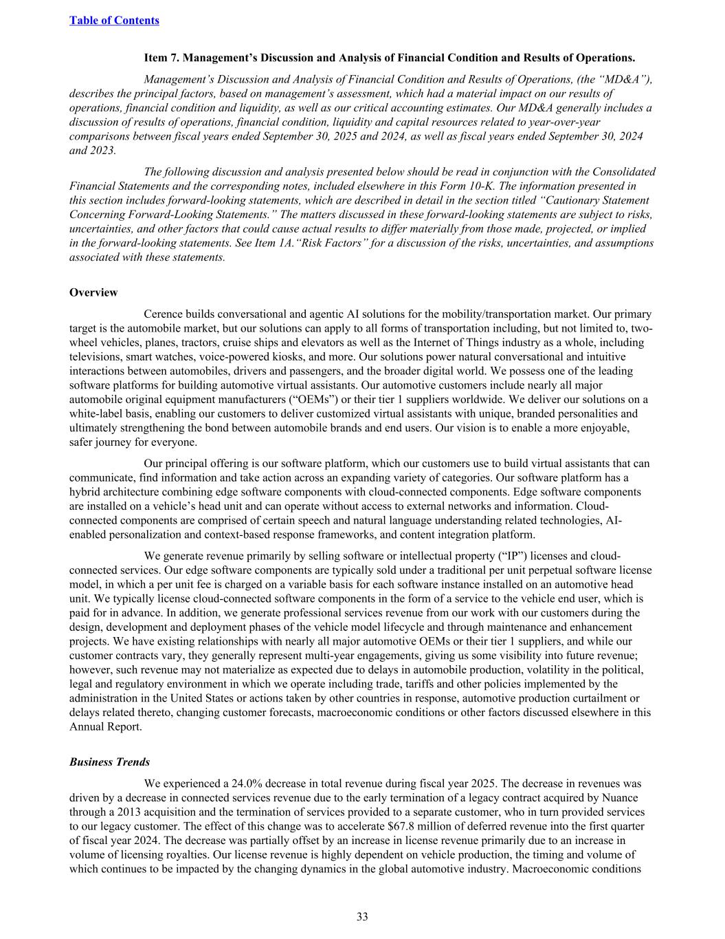 Item 7. Management’s Discussion and Analysis of Financial Condition and Results of Operations. Management’s Discussion and Analysis of Financial Condition and Results of Operations, (the “MD&A”), describes the principal factors, based on management’s assessment, which had a material impact on our results of operations, financial condition and liquidity, as well as our critical accounting estimates. Our MD&A generally includes a discussion of results of operations, financial condition, liquidity and capital resources related to year-over-year comparisons between fiscal years ended September 30, 2025 and 2024, as well as fiscal years ended September 30, 2024 and 2023. The following discussion and analysis presented below should be read in conjunction with the Consolidated Financial Statements and the corresponding notes, included elsewhere in this Form 10-K. The information presented in this section includes forward-looking statements, which are described in detail in the section titled “Cautionary Statement Concerning Forward-Looking Statements.” The matters discussed in these forward-looking statements are subject to risks, uncertainties, and other factors that could cause actual results to differ materially from those made, projected, or implied in the forward-looking statements. See Item 1A.“Risk Factors” for a discussion of the risks, uncertainties, and assumptions associated with these statements. Overview Cerence builds conversational and agentic AI solutions for the mobility/transportation market. Our primary target is the automobile market, but our solutions can apply to all forms of transportation including, but not limited to, two- wheel vehicles, planes, tractors, cruise ships and elevators as well as the Internet of Things industry as a whole, including televisions, smart watches, voice-powered kiosks, and more. Our solutions power natural conversational and intuitive interactions between automobiles, drivers and passengers, and the broader digital world. We possess one of the leading software platforms for building automotive virtual assistants. Our automotive customers include nearly all major automobile original equipment manufacturers (“OEMs”) or their tier 1 suppliers worldwide. We deliver our solutions on a white-label basis, enabling our customers to deliver customized virtual assistants with unique, branded personalities and ultimately strengthening the bond between automobile brands and end users. Our vision is to enable a more enjoyable, safer journey for everyone. Our principal offering is our software platform, which our customers use to build virtual assistants that can communicate, find information and take action across an expanding variety of categories. Our software platform has a hybrid architecture combining edge software components with cloud-connected components. Edge software components are installed on a vehicle’s head unit and can operate without access to external networks and information. Cloud- connected components are comprised of certain speech and natural language understanding related technologies, AI- enabled personalization and context-based response frameworks, and content integration platform. We generate revenue primarily by selling software or intellectual property (“IP”) licenses and cloud- connected services. Our edge software components are typically sold under a traditional per unit perpetual software license model, in which a per unit fee is charged on a variable basis for each software instance installed on an automotive head unit. We typically license cloud-connected software components in the form of a service to the vehicle end user, which is paid for in advance. In addition, we generate professional services revenue from our work with our customers during the design, development and deployment phases of the vehicle model lifecycle and through maintenance and enhancement projects. We have existing relationships with nearly all major automotive OEMs or their tier 1 suppliers, and while our customer contracts vary, they generally represent multi-year engagements, giving us some visibility into future revenue; however, such revenue may not materialize as expected due to delays in automobile production, volatility in the political, legal and regulatory environment in which we operate including trade, tariffs and other policies implemented by the administration in the United States or actions taken by other countries in response, automotive production curtailment or delays related thereto, changing customer forecasts, macroeconomic conditions or other factors discussed elsewhere in this Annual Report. Business Trends We experienced a 24.0% decrease in total revenue during fiscal year 2025. The decrease in revenues was driven by a decrease in connected services revenue due to the early termination of a legacy contract acquired by Nuance through a 2013 acquisition and the termination of services provided to a separate customer, who in turn provided services to our legacy customer. The effect of this change was to accelerate $67.8 million of deferred revenue into the first quarter of fiscal year 2024. The decrease was partially offset by an increase in license revenue primarily due to an increase in volume of licensing royalties. Our license revenue is highly dependent on vehicle production, the timing and volume of which continues to be impacted by the changing dynamics in the global automotive industry. Macroeconomic conditions Table of Contents 33