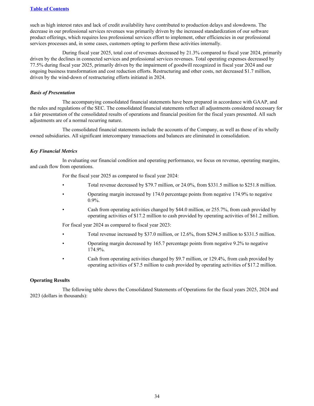 such as high interest rates and lack of credit availability have contributed to production delays and slowdowns. The decrease in our professional services revenues was primarily driven by the increased standardization of our software product offerings, which requires less professional services effort to implement, other efficiencies in our professional services processes and, in some cases, customers opting to perform these activities internally. During fiscal year 2025, total cost of revenues decreased by 21.3% compared to fiscal year 2024, primarily driven by the declines in connected services and professional services revenues. Total operating expenses decreased by 77.5% during fiscal year 2025, primarily driven by the impairment of goodwill recognized in fiscal year 2024 and our ongoing business transformation and cost reduction efforts. Restructuring and other costs, net decreased $1.7 million, driven by the wind-down of restructuring efforts initiated in 2024. Basis of Presentation The accompanying consolidated financial statements have been prepared in accordance with GAAP, and the rules and regulations of the SEC. The consolidated financial statements reflect all adjustments considered necessary for a fair presentation of the consolidated results of operations and financial position for the fiscal years presented. All such adjustments are of a normal recurring nature. The consolidated financial statements include the accounts of the Company, as well as those of its wholly owned subsidiaries. All significant intercompany transactions and balances are eliminated in consolidation. Key Financial Metrics In evaluating our financial condition and operating performance, we focus on revenue, operating margins, and cash flow from operations. For the fiscal year 2025 as compared to fiscal year 2024: • Total revenue decreased by $79.7 million, or 24.0%, from $331.5 million to $251.8 million. • Operating margin increased by 174.0 percentage points from negative 174.9% to negative 0.9%. • Cash from operating activities changed by $44.0 million, or 255.7%, from cash provided by operating activities of $17.2 million to cash provided by operating activities of $61.2 million. For fiscal year 2024 as compared to fiscal year 2023: • Total revenue increased by $37.0 million, or 12.6%, from $294.5 million to $331.5 million. • Operating margin decreased by 165.7 percentage points from negative 9.2% to negative 174.9%. • Cash from operating activities changed by $9.7 million, or 129.4%, from cash provided by operating activities of $7.5 million to cash provided by operating activities of $17.2 million. Operating Results The following table shows the Consolidated Statements of Operations for the fiscal years 2025, 2024 and 2023 (dollars in thousands): Table of Contents 34