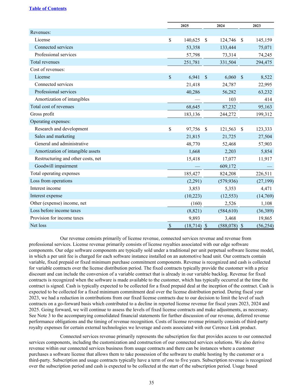 2025 2024 2023 Revenues: License $ 140,625 $ 124,746 $ 145,159 Connected services 53,358 133,444 75,071 Professional services 57,798 73,314 74,245 Total revenues 251,781 331,504 294,475 Cost of revenues: License $ 6,941 $ 6,060 $ 8,522 Connected services 21,418 24,787 22,995 Professional services 40,286 56,282 63,232 Amortization of intangibles — 103 414 Total cost of revenues 68,645 87,232 95,163 Gross profit 183,136 244,272 199,312 Operating expenses: Research and development $ 97,756 $ 121,563 $ 123,333 Sales and marketing 21,815 21,725 27,504 General and administrative 48,770 52,468 57,903 Amortization of intangible assets 1,668 2,203 5,854 Restructuring and other costs, net 15,418 17,077 11,917 Goodwill impairment — 609,172 — Total operating expenses 185,427 824,208 226,511 Loss from operations (2,291) (579,936) (27,199) Interest income 3,853 5,353 4,471 Interest expense (10,223) (12,553) (14,769) Other (expense) income, net (160) 2,526 1,108 Loss before income taxes (8,821) (584,610) (36,389) Provision for income taxes 9,893 3,468 19,865 Net loss $ (18,714) $ (588,078) $ (56,254) Our revenue consists primarily of license revenue, connected services revenue and revenue from professional services. License revenue primarily consists of license royalties associated with our edge software components. Our edge software components are typically sold under a traditional per unit perpetual software license model, in which a per unit fee is charged for each software instance installed on an automotive head unit. Our contracts contain variable, fixed prepaid or fixed minimum purchase commitment components. Revenue is recognized and cash is collected for variable contracts over the license distribution period. The fixed contracts typically provide the customer with a price discount and can include the conversion of a variable contract that is already in our variable backlog. Revenue for fixed contracts is recognized when the software is made available to the customer, which has typically occurred at the time the contract is signed. Cash is typically expected to be collected for a fixed prepaid deal at the inception of the contract. Cash is expected to be collected for a fixed minimum commitment deal over the license distribution period. During fiscal year 2023, we had a reduction in contributions from our fixed license contracts due to our decision to limit the level of such contracts on a go-forward basis which contributed to a decline in reported license revenue for fiscal years 2023, 2024 and 2025. Going forward, we will continue to assess the levels of fixed license contracts and make adjustments, as necessary. See Note 3 to the accompanying consolidated financial statements for further discussion of our revenue, deferred revenue performance obligations and the timing of revenue recognition. Costs of license revenue primarily consists of third-party royalty expenses for certain external technologies we leverage and costs associated with our Cerence Link product. Connected services revenue primarily represents the subscription fee that provides access to our connected services components, including the customization and construction of our connected services solutions. We also derive revenue within our connected services business from usage contracts and there can be instances where a customer purchases a software license that allows them to take possession of the software to enable hosting by the customer or a third-party. Subscription and usage contracts typically have a term of one to five years. Subscription revenue is recognized over the subscription period and cash is expected to be collected at the start of the subscription period. Usage based Table of Contents 35