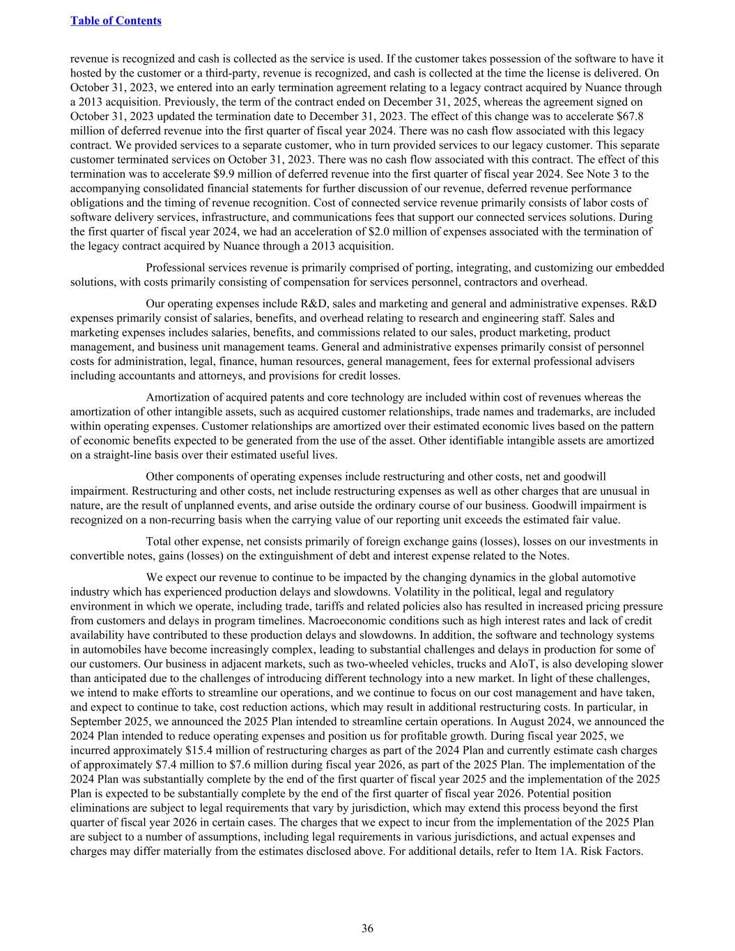 revenue is recognized and cash is collected as the service is used. If the customer takes possession of the software to have it hosted by the customer or a third-party, revenue is recognized, and cash is collected at the time the license is delivered. On October 31, 2023, we entered into an early termination agreement relating to a legacy contract acquired by Nuance through a 2013 acquisition. Previously, the term of the contract ended on December 31, 2025, whereas the agreement signed on October 31, 2023 updated the termination date to December 31, 2023. The effect of this change was to accelerate $67.8 million of deferred revenue into the first quarter of fiscal year 2024. There was no cash flow associated with this legacy contract. We provided services to a separate customer, who in turn provided services to our legacy customer. This separate customer terminated services on October 31, 2023. There was no cash flow associated with this contract. The effect of this termination was to accelerate $9.9 million of deferred revenue into the first quarter of fiscal year 2024. See Note 3 to the accompanying consolidated financial statements for further discussion of our revenue, deferred revenue performance obligations and the timing of revenue recognition. Cost of connected service revenue primarily consists of labor costs of software delivery services, infrastructure, and communications fees that support our connected services solutions. During the first quarter of fiscal year 2024, we had an acceleration of $2.0 million of expenses associated with the termination of the legacy contract acquired by Nuance through a 2013 acquisition. Professional services revenue is primarily comprised of porting, integrating, and customizing our embedded solutions, with costs primarily consisting of compensation for services personnel, contractors and overhead. Our operating expenses include R&D, sales and marketing and general and administrative expenses. R&D expenses primarily consist of salaries, benefits, and overhead relating to research and engineering staff. Sales and marketing expenses includes salaries, benefits, and commissions related to our sales, product marketing, product management, and business unit management teams. General and administrative expenses primarily consist of personnel costs for administration, legal, finance, human resources, general management, fees for external professional advisers including accountants and attorneys, and provisions for credit losses. Amortization of acquired patents and core technology are included within cost of revenues whereas the amortization of other intangible assets, such as acquired customer relationships, trade names and trademarks, are included within operating expenses. Customer relationships are amortized over their estimated economic lives based on the pattern of economic benefits expected to be generated from the use of the asset. Other identifiable intangible assets are amortized on a straight-line basis over their estimated useful lives. Other components of operating expenses include restructuring and other costs, net and goodwill impairment. Restructuring and other costs, net include restructuring expenses as well as other charges that are unusual in nature, are the result of unplanned events, and arise outside the ordinary course of our business. Goodwill impairment is recognized on a non-recurring basis when the carrying value of our reporting unit exceeds the estimated fair value. Total other expense, net consists primarily of foreign exchange gains (losses), losses on our investments in convertible notes, gains (losses) on the extinguishment of debt and interest expense related to the Notes. We expect our revenue to continue to be impacted by the changing dynamics in the global automotive industry which has experienced production delays and slowdowns. Volatility in the political, legal and regulatory environment in which we operate, including trade, tariffs and related policies also has resulted in increased pricing pressure from customers and delays in program timelines. Macroeconomic conditions such as high interest rates and lack of credit availability have contributed to these production delays and slowdowns. In addition, the software and technology systems in automobiles have become increasingly complex, leading to substantial challenges and delays in production for some of our customers. Our business in adjacent markets, such as two-wheeled vehicles, trucks and AIoT, is also developing slower than anticipated due to the challenges of introducing different technology into a new market. In light of these challenges, we intend to make efforts to streamline our operations, and we continue to focus on our cost management and have taken, and expect to continue to take, cost reduction actions, which may result in additional restructuring costs. In particular, in September 2025, we announced the 2025 Plan intended to streamline certain operations. In August 2024, we announced the 2024 Plan intended to reduce operating expenses and position us for profitable growth. During fiscal year 2025, we incurred approximately $15.4 million of restructuring charges as part of the 2024 Plan and currently estimate cash charges of approximately $7.4 million to $7.6 million during fiscal year 2026, as part of the 2025 Plan. The implementation of the 2024 Plan was substantially complete by the end of the first quarter of fiscal year 2025 and the implementation of the 2025 Plan is expected to be substantially complete by the end of the first quarter of fiscal year 2026. Potential position eliminations are subject to legal requirements that vary by jurisdiction, which may extend this process beyond the first quarter of fiscal year 2026 in certain cases. The charges that we expect to incur from the implementation of the 2025 Plan are subject to a number of assumptions, including legal requirements in various jurisdictions, and actual expenses and charges may