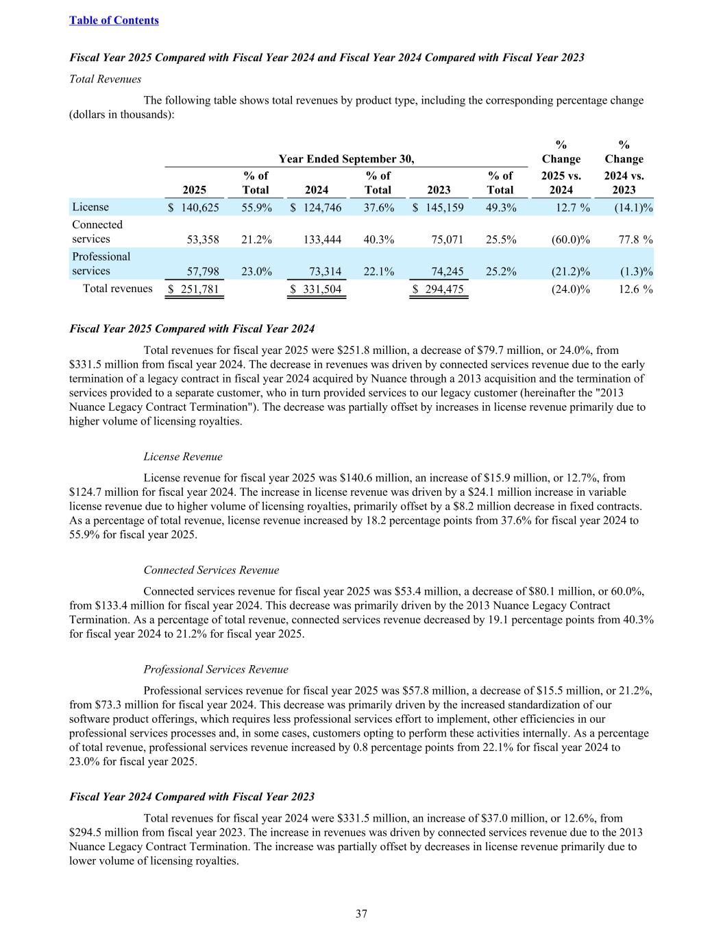 Fiscal Year 2025 Compared with Fiscal Year 2024 and Fiscal Year 2024 Compared with Fiscal Year 2023 Total Revenues The following table shows total revenues by product type, including the corresponding percentage change (dollars in thousands): Year Ended September 30, % Change % Change 2025 % of Total 2024 % of Total 2023 % of Total 2025 vs. 2024 2024 vs. 2023 License $ 140,625 55.9% $ 124,746 37.6% $ 145,159 49.3% 12.7 % (14.1) % Connected services 53,358 21.2% 133,444 40.3% 75,071 25.5% (60.0) % 77.8 % Professional services 57,798 23.0% 73,314 22.1% 74,245 25.2% (21.2) % (1.3) % Total revenues $ 251,781 $ 331,504 $ 294,475 (24.0) % 12.6 % Fiscal Year 2025 Compared with Fiscal Year 2024 Total revenues for fiscal year 2025 were $251.8 million, a decrease of $79.7 million, or 24.0%, from $331.5 million from fiscal year 2024. The decrease in revenues was driven by connected services revenue due to the early termination of a legacy contract in fiscal year 2024 acquired by Nuance through a 2013 acquisition and the termination of services provided to a separate customer, who in turn provided services to our legacy customer (hereinafter the "2013 Nuance Legacy Contract Termination"). The decrease was partially offset by increases in license revenue primarily due to higher volume of licensing royalties. License Revenue License revenue for fiscal year 2025 was $140.6 million, an increase of $15.9 million, or 12.7%, from $124.7 million for fiscal year 2024. The increase in license revenue was driven by a $24.1 million increase in variable license revenue due to higher volume of licensing royalties, primarily offset by a $8.2 million decrease in fixed contracts. As a percentage of total revenue, license revenue increased by 18.2 percentage points from 37.6% for fiscal year 2024 to 55.9% for fiscal year 2025. Connected Services Revenue Connected services revenue for fiscal year 2025 was $53.4 million, a decrease of $80.1 million, or 60.0%, from $133.4 million for fiscal year 2024. This decrease was primarily driven by the 2013 Nuance Legacy Contract Termination. As a percentage of total revenue, connected services revenue decreased by 19.1 percentage points from 40.3% for fiscal year 2024 to 21.2% for fiscal year 2025. Professional Services Revenue Professional services revenue for fiscal year 2025 was $57.8 million, a decrease of $15.5 million, or 21.2%, from $73.3 million for fiscal year 2024. This decrease was primarily driven by the increased standardization of our software product offerings, which requires less professional services effort to implement, other efficiencies in our professional services processes and, in some cases, customers opting to perform these activities internally. As a percentage of total revenue, professional services revenue increased by 0.8 percentage points from 22.1% for fiscal year 2024 to 23.0% for fiscal year 2025. Fiscal Year 2024 Compared with Fiscal Year 2023 Total revenues for fiscal year 2024 were $331.5 million, an increase of $37.0 million, or 12.6%, from $294.5 million from fiscal year 2023. The increase in revenues was driven by connected services revenue due to the 2013 Nuance Legacy Contract Termination. The increase was partially offset by decreases in license revenue primarily due to lower volume of licensing royalties. Table of Contents 37