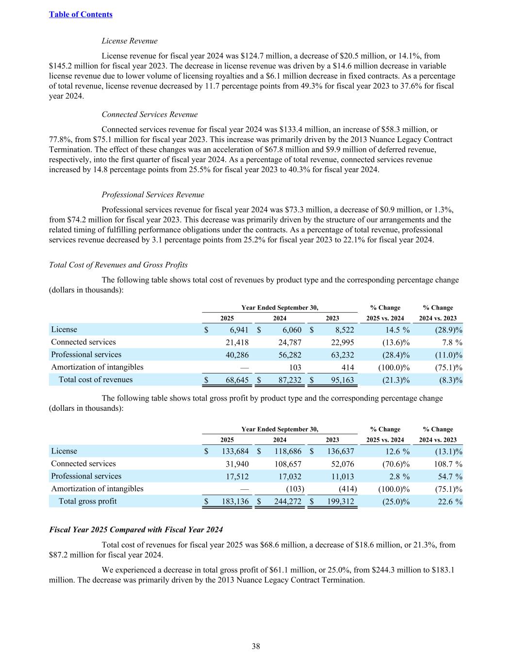 License Revenue License revenue for fiscal year 2024 was $124.7 million, a decrease of $20.5 million, or 14.1%, from $145.2 million for fiscal year 2023. The decrease in license revenue was driven by a $14.6 million decrease in variable license revenue due to lower volume of licensing royalties and a $6.1 million decrease in fixed contracts. As a percentage of total revenue, license revenue decreased by 11.7 percentage points from 49.3% for fiscal year 2023 to 37.6% for fiscal year 2024. Connected Services Revenue Connected services revenue for fiscal year 2024 was $133.4 million, an increase of $58.3 million, or 77.8%, from $75.1 million for fiscal year 2023. This increase was primarily driven by the 2013 Nuance Legacy Contract Termination. The effect of these changes was an acceleration of $67.8 million and $9.9 million of deferred revenue, respectively, into the first quarter of fiscal year 2024. As a percentage of total revenue, connected services revenue increased by 14.8 percentage points from 25.5% for fiscal year 2023 to 40.3% for fiscal year 2024. Professional Services Revenue Professional services revenue for fiscal year 2024 was $73.3 million, a decrease of $0.9 million, or 1.3%, from $74.2 million for fiscal year 2023. This decrease was primarily driven by the structure of our arrangements and the related timing of fulfilling performance obligations under the contracts. As a percentage of total revenue, professional services revenue decreased by 3.1 percentage points from 25.2% for fiscal year 2023 to 22.1% for fiscal year 2024. Total Cost of Revenues and Gross Profits The following table shows total cost of revenues by product type and the corresponding percentage change (dollars in thousands): Year Ended September 30, % Change % Change 2025 2024 2023 2025 vs. 2024 2024 vs. 2023 License $ 6,941 $ 6,060 $ 8,522 14.5 % (28.9) % Connected services 21,418 24,787 22,995 (13.6) % 7.8 % Professional services 40,286 56,282 63,232 (28.4) % (11.0) % Amortization of intangibles — 103 414 (100.0) % (75.1) % Total cost of revenues $ 68,645 $ 87,232 $ 95,163 (21.3) % (8.3) % The following table shows total gross profit by product type and the corresponding percentage change (dollars in thousands): Year Ended September 30, % Change % Change 2025 2024 2023 2025 vs. 2024 2024 vs. 2023 License $ 133,684 $ 118,686 $ 136,637 12.6 % (13.1) % Connected services 31,940 108,657 52,076 (70.6) % 108.7 % Professional services 17,512 17,032 11,013 2.8 % 54.7 % Amortization of intangibles — (103) (414) (100.0) % (75.1) % Total gross profit $ 183,136 $ 244,272 $ 199,312 (25.0) % 22.6 % Fiscal Year 2025 Compared with Fiscal Year 2024 Total cost of revenues for fiscal year 2025 was $68.6 million, a decrease of $18.6 million, or 21.3%, from $87.2 million for fiscal year 2024. We experienced a decrease in total gross profit of $61.1 million, or 25.0%, from $244.3 million to $183.1 million. The decrease was primarily driven by the 2013 Nuance Legacy Contract Termination. Table of Contents 38