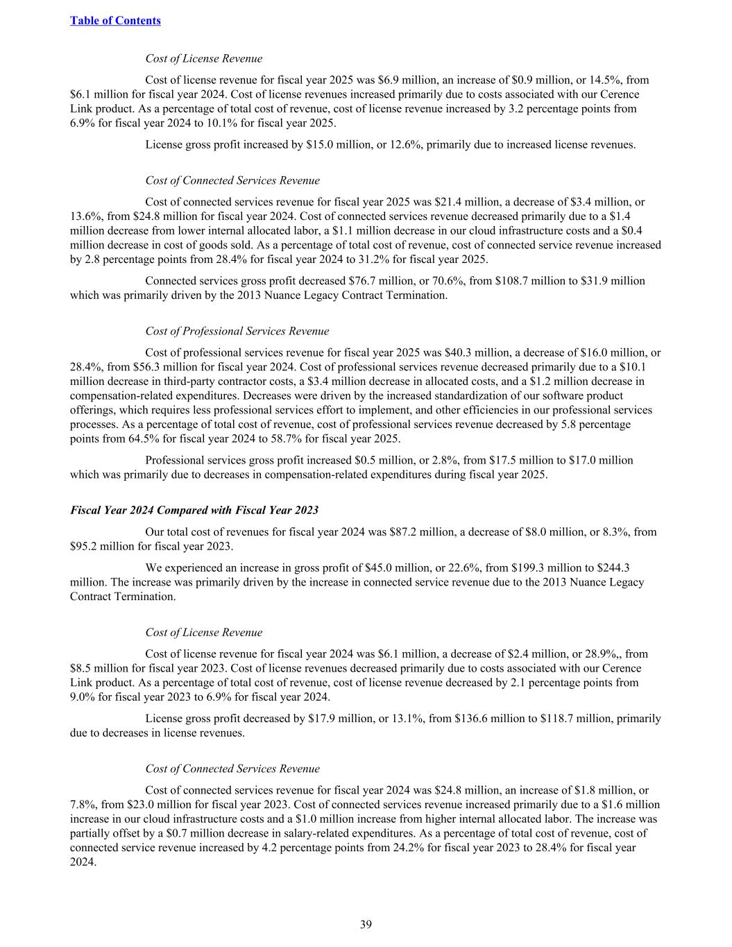 Cost of License Revenue Cost of license revenue for fiscal year 2025 was $6.9 million, an increase of $0.9 million, or 14.5%, from $6.1 million for fiscal year 2024. Cost of license revenues increased primarily due to costs associated with our Cerence Link product. As a percentage of total cost of revenue, cost of license revenue increased by 3.2 percentage points from 6.9% for fiscal year 2024 to 10.1% for fiscal year 2025. License gross profit increased by $15.0 million, or 12.6%, primarily due to increased license revenues. Cost of Connected Services Revenue Cost of connected services revenue for fiscal year 2025 was $21.4 million, a decrease of $3.4 million, or 13.6%, from $24.8 million for fiscal year 2024. Cost of connected services revenue decreased primarily due to a $1.4 million decrease from lower internal allocated labor, a $1.1 million decrease in our cloud infrastructure costs and a $0.4 million decrease in cost of goods sold. As a percentage of total cost of revenue, cost of connected service revenue increased by 2.8 percentage points from 28.4% for fiscal year 2024 to 31.2% for fiscal year 2025. Connected services gross profit decreased $76.7 million, or 70.6%, from $108.7 million to $31.9 million which was primarily driven by the 2013 Nuance Legacy Contract Termination. Cost of Professional Services Revenue Cost of professional services revenue for fiscal year 2025 was $40.3 million, a decrease of $16.0 million, or 28.4%, from $56.3 million for fiscal year 2024. Cost of professional services revenue decreased primarily due to a $10.1 million decrease in third-party contractor costs, a $3.4 million decrease in allocated costs, and a $1.2 million decrease in compensation-related expenditures. Decreases were driven by the increased standardization of our software product offerings, which requires less professional services effort to implement, and other efficiencies in our professional services processes. As a percentage of total cost of revenue, cost of professional services revenue decreased by 5.8 percentage points from 64.5% for fiscal year 2024 to 58.7% for fiscal year 2025. Professional services gross profit increased $0.5 million, or 2.8%, from $17.5 million to $17.0 million which was primarily due to decreases in compensation-related expenditures during fiscal year 2025. Fiscal Year 2024 Compared with Fiscal Year 2023 Our total cost of revenues for fiscal year 2024 was $87.2 million, a decrease of $8.0 million, or 8.3%, from $95.2 million for fiscal year 2023. We experienced an increase in gross profit of $45.0 million, or 22.6%, from $199.3 million to $244.3 million. The increase was primarily driven by the increase in connected service revenue due to the 2013 Nuance Legacy Contract Termination. Cost of License Revenue Cost of license revenue for fiscal year 2024 was $6.1 million, a decrease of $2.4 million, or 28.9%,, from $8.5 million for fiscal year 2023. Cost of license revenues decreased primarily due to costs associated with our Cerence Link product. As a percentage of total cost of revenue, cost of license revenue decreased by 2.1 percentage points from 9.0% for fiscal year 2023 to 6.9% for fiscal year 2024. License gross profit decreased by $17.9 million, or 13.1%, from $136.6 million to $118.7 million, primarily due to decreases in license revenues. Cost of Connected Services Revenue Cost of connected services revenue for fiscal year 2024 was $24.8 million, an increase of $1.8 million, or 7.8%, from $23.0 million for fiscal year 2023. Cost of connected services revenue increased primarily due to a $1.6 million increase in our cloud infrastructure costs and a $1.0 million increase from higher internal allocated labor. The increase was partially offset by a $0.7 million decrease in salary-related expenditures. As a percentage of total cost of revenue, cost of connected service revenue increased by 4.2 percentage points from 24.2% for fiscal year 2023 to 28.4% for fiscal year 2024. Table of Contents 39