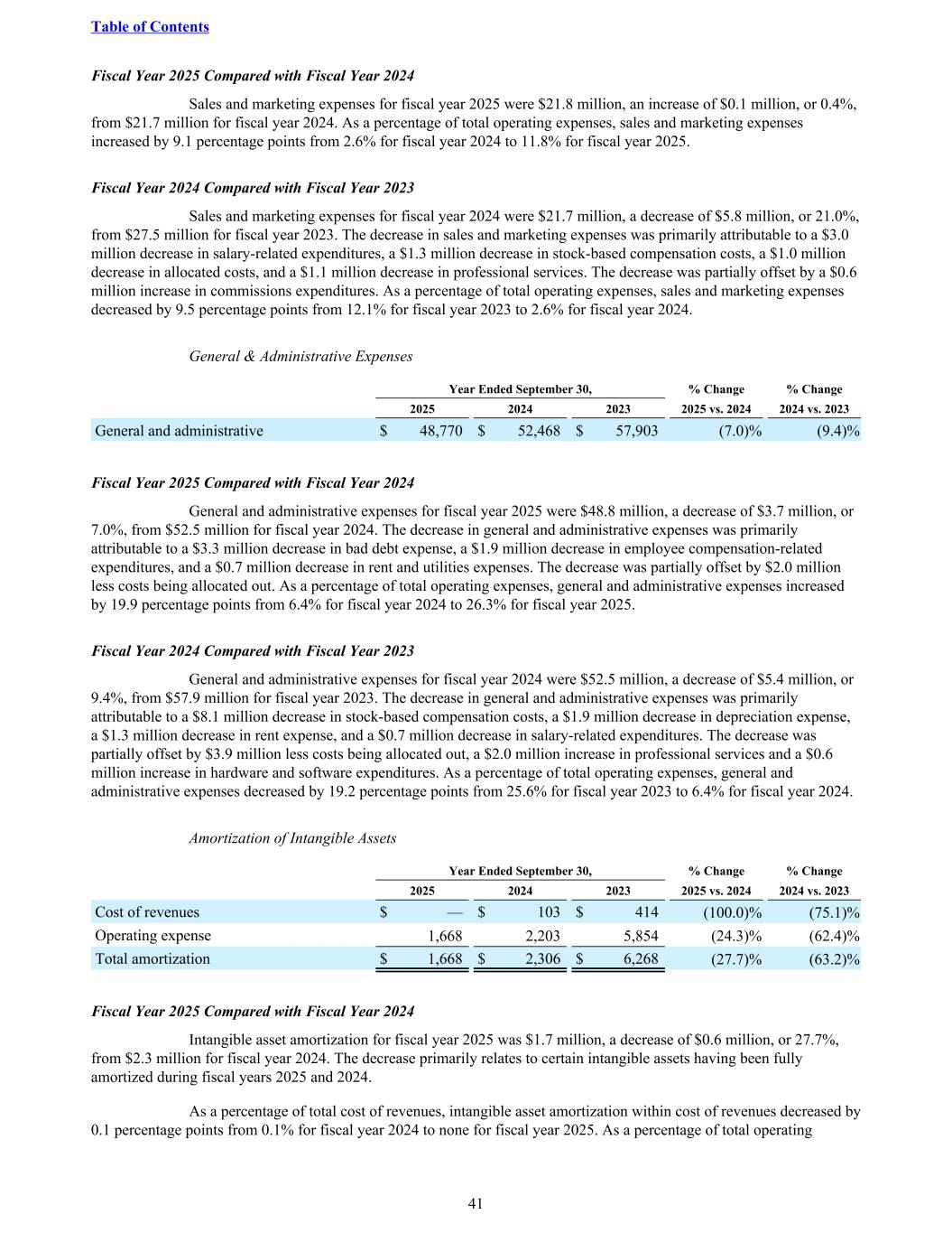 Fiscal Year 2025 Compared with Fiscal Year 2024 Sales and marketing expenses for fiscal year 2025 were $21.8 million, an increase of $0.1 million, or 0.4%, from $21.7 million for fiscal year 2024. As a percentage of total operating expenses, sales and marketing expenses increased by 9.1 percentage points from 2.6% for fiscal year 2024 to 11.8% for fiscal year 2025. Fiscal Year 2024 Compared with Fiscal Year 2023 Sales and marketing expenses for fiscal year 2024 were $21.7 million, a decrease of $5.8 million, or 21.0%, from $27.5 million for fiscal year 2023. The decrease in sales and marketing expenses was primarily attributable to a $3.0 million decrease in salary-related expenditures, a $1.3 million decrease in stock-based compensation costs, a $1.0 million decrease in allocated costs, and a $1.1 million decrease in professional services. The decrease was partially offset by a $0.6 million increase in commissions expenditures. As a percentage of total operating expenses, sales and marketing expenses decreased by 9.5 percentage points from 12.1% for fiscal year 2023 to 2.6% for fiscal year 2024. General & Administrative Expenses Year Ended September 30, % Change % Change 2025 2024 2023 2025 vs. 2024 2024 vs. 2023 General and administrative $ 48,770 $ 52,468 $ 57,903 (7.0) % (9.4) % Fiscal Year 2025 Compared with Fiscal Year 2024 General and administrative expenses for fiscal year 2025 were $48.8 million, a decrease of $3.7 million, or 7.0%, from $52.5 million for fiscal year 2024. The decrease in general and administrative expenses was primarily attributable to a $3.3 million decrease in bad debt expense, a $1.9 million decrease in employee compensation-related expenditures, and a $0.7 million decrease in rent and utilities expenses. The decrease was partially offset by $2.0 million less costs being allocated out. As a percentage of total operating expenses, general and administrative expenses increased by 19.9 percentage points from 6.4% for fiscal year 2024 to 26.3% for fiscal year 2025. Fiscal Year 2024 Compared with Fiscal Year 2023 General and administrative expenses for fiscal year 2024 were $52.5 million, a decrease of $5.4 million, or 9.4%, from $57.9 million for fiscal year 2023. The decrease in general and administrative expenses was primarily attributable to a $8.1 million decrease in stock-based compensation costs, a $1.9 million decrease in depreciation expense, a $1.3 million decrease in rent expense, and a $0.7 million decrease in salary-related expenditures. The decrease was partially offset by $3.9 million less costs being allocated out, a $2.0 million increase in professional services and a $0.6 million increase in hardware and software expenditures. As a percentage of total operating expenses, general and administrative expenses decreased by 19.2 percentage points from 25.6% for fiscal year 2023 to 6.4% for fiscal year 2024. Amortization of Intangible Assets Year Ended September 30, % Change % Change 2025 2024 2023 2025 vs. 2024 2024 vs. 2023 Cost of revenues $ — $ 103 $ 414 (100.0) % (75.1) % Operating expense 1,668 2,203 5,854 (24.3) % (62.4) % Total amortization $ 1,668 $ 2,306 $ 6,268 (27.7) % (63.2) % Fiscal Year 2025 Compared with Fiscal Year 2024 Intangible asset amortization for fiscal year 2025 was $1.7 million, a decrease of $0.6 million, or 27.7%, from $2.3 million for fiscal year 2024. The decrease primarily relates to certain intangible assets having been fully amortized during fiscal years 2025 and 2024. As a percentage of total cost of revenues, intangible asset amortization within cost of revenues decreased by 0.1 percentage points from 0.1% for fiscal year 2024 to none for fiscal year 2025. As a percentage of total operating Table of Contents 41