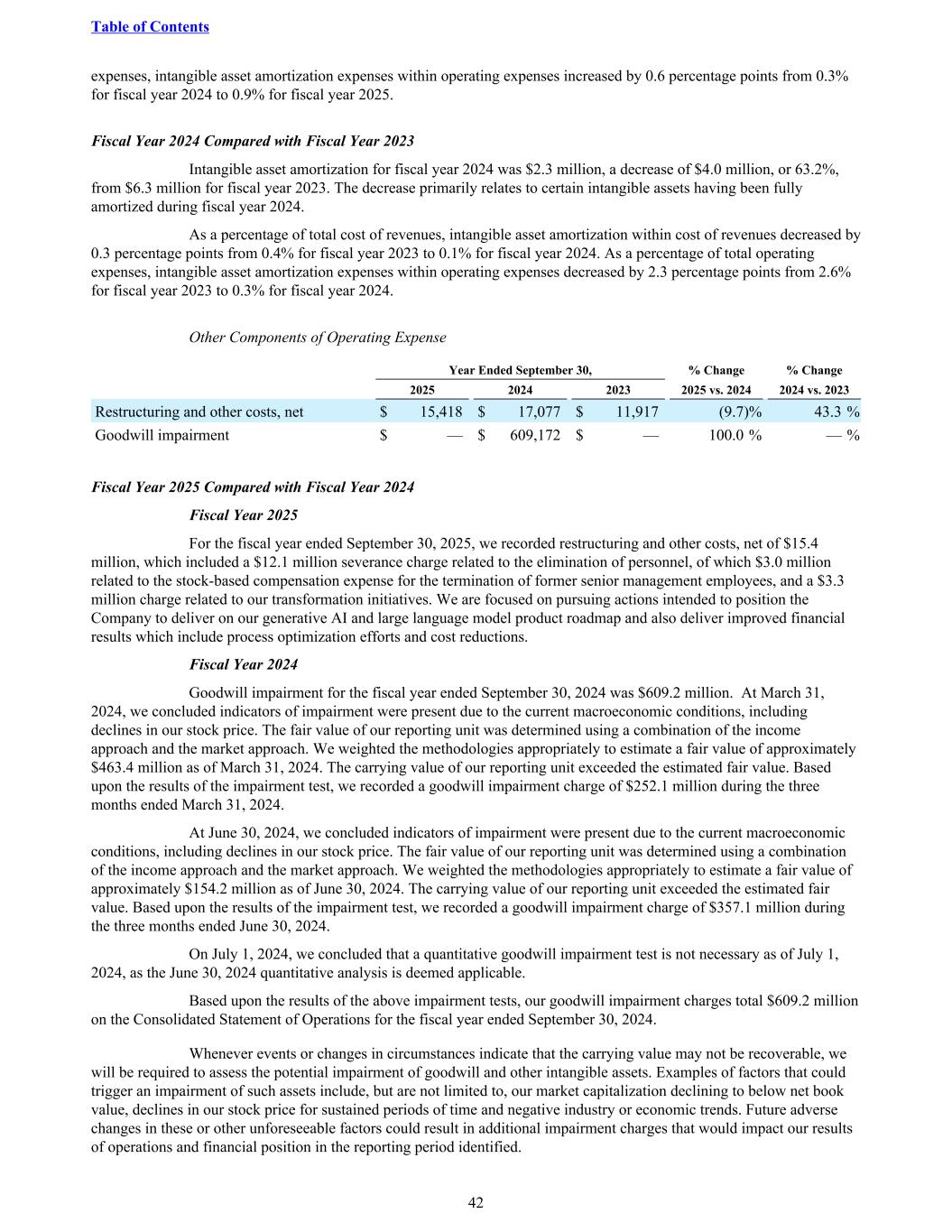 expenses, intangible asset amortization expenses within operating expenses increased by 0.6 percentage points from 0.3% for fiscal year 2024 to 0.9% for fiscal year 2025. Fiscal Year 2024 Compared with Fiscal Year 2023 Intangible asset amortization for fiscal year 2024 was $2.3 million, a decrease of $4.0 million, or 63.2%, from $6.3 million for fiscal year 2023. The decrease primarily relates to certain intangible assets having been fully amortized during fiscal year 2024. As a percentage of total cost of revenues, intangible asset amortization within cost of revenues decreased by 0.3 percentage points from 0.4% for fiscal year 2023 to 0.1% for fiscal year 2024. As a percentage of total operating expenses, intangible asset amortization expenses within operating expenses decreased by 2.3 percentage points from 2.6% for fiscal year 2023 to 0.3% for fiscal year 2024. Other Components of Operating Expense Year Ended September 30, % Change % Change 2025 2024 2023 2025 vs. 2024 2024 vs. 2023 Restructuring and other costs, net $ 15,418 $ 17,077 $ 11,917 (9.7) % 43.3 % Goodwill impairment $ — $ 609,172 $ — 100.0 % — % Fiscal Year 2025 Compared with Fiscal Year 2024 Fiscal Year 2025 For the fiscal year ended September 30, 2025, we recorded restructuring and other costs, net of $15.4 million, which included a $12.1 million severance charge related to the elimination of personnel, of which $3.0 million related to the stock-based compensation expense for the termination of former senior management employees, and a $3.3 million charge related to our transformation initiatives. We are focused on pursuing actions intended to position the Company to deliver on our generative AI and large language model product roadmap and also deliver improved financial results which include process optimization efforts and cost reductions. Fiscal Year 2024 Goodwill impairment for the fiscal year ended September 30, 2024 was $609.2 million. At March 31, 2024, we concluded indicators of impairment were present due to the current macroeconomic conditions, including declines in our stock price. The fair value of our reporting unit was determined using a combination of the income approach and the market approach. We weighted the methodologies appropriately to estimate a fair value of approximately $463.4 million as of March 31, 2024. The carrying value of our reporting unit exceeded the estimated fair value. Based upon the results of the impairment test, we recorded a goodwill impairment charge of $252.1 million during the three months ended March 31, 2024. At June 30, 2024, we concluded indicators of impairment were present due to the current macroeconomic conditions, including declines in our stock price. The fair value of our reporting unit was determined using a combination of the income approach and the market approach. We weighted the methodologies appropriately to estimate a fair value of approximately $154.2 million as of June 30, 2024. The carrying value of our reporting unit exceeded the estimated fair value. Based upon the results of the impairment test, we recorded a goodwill impairment charge of $357.1 million during the three months ended June 30, 2024. On July 1, 2024, we concluded that a quantitative goodwill impairment test is not necessary as of July 1, 2024, as the June 30, 2024 quantitative analysis is deemed applicable. Based upon the results of the above impairment tests, our goodwill impairment charges total $609.2 million on the Consolidated Statement of Operations for the fiscal year ended September 30, 2024. Whenever events or changes in circumstances indicate that the carrying value may not be recoverable, we will be required to assess the potential impairment of goodwill and other intangible assets. Examples of factors that could trigger an impairment of such assets include, but are not limited to, our market capitalization declining to below net book value, declines in our stock price for sustained periods of time and negative industry or economic trends. Future adverse changes in these or other unforeseeable factors could result in additional impairment charges that would impact our results of operations and financial position in the reporting period identified. Table of Contents 42