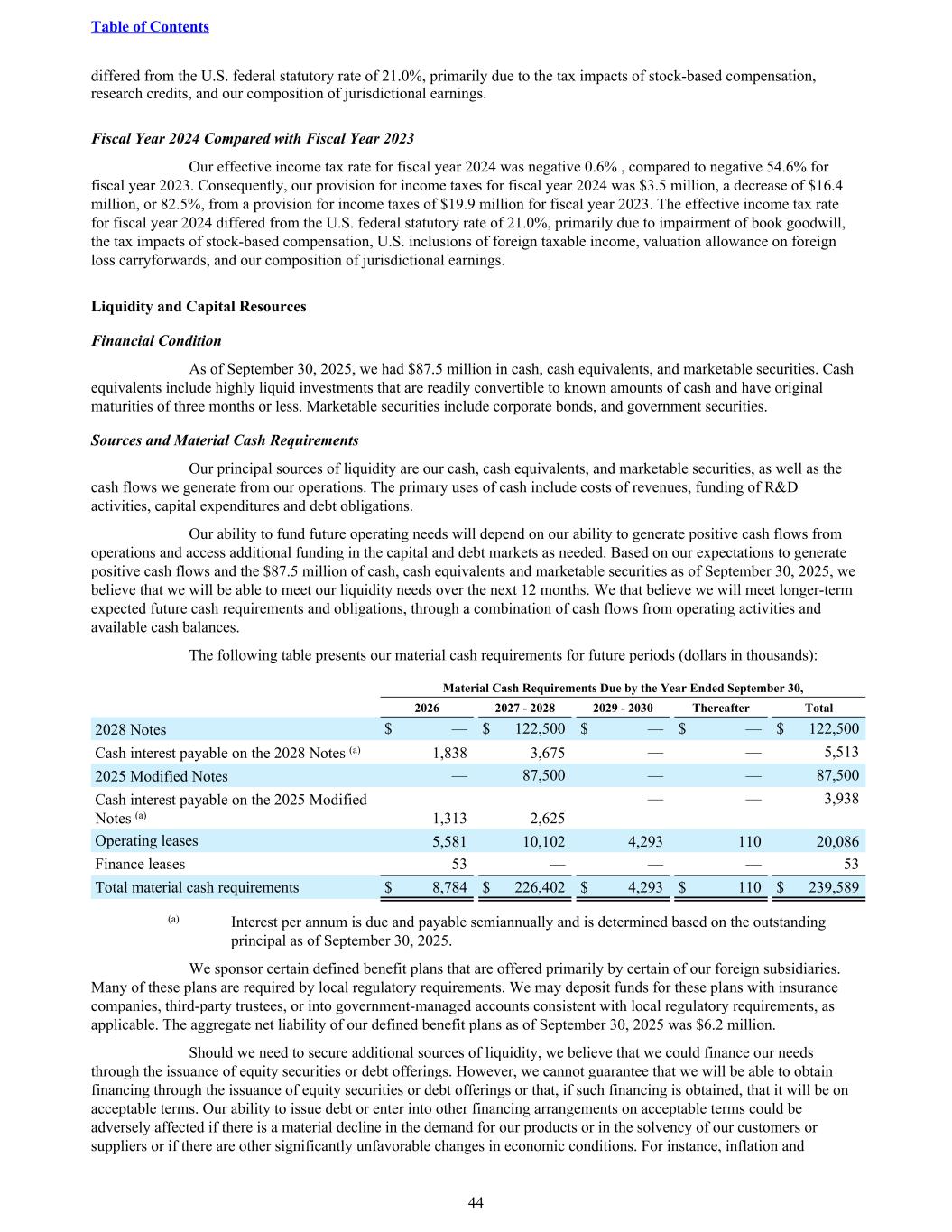 differed from the U.S. federal statutory rate of 21.0%, primarily due to the tax impacts of stock-based compensation, research credits, and our composition of jurisdictional earnings. Fiscal Year 2024 Compared with Fiscal Year 2023 Our effective income tax rate for fiscal year 2024 was negative 0.6% , compared to negative 54.6% for fiscal year 2023. Consequently, our provision for income taxes for fiscal year 2024 was $3.5 million, a decrease of $16.4 million, or 82.5%, from a provision for income taxes of $19.9 million for fiscal year 2023. The effective income tax rate for fiscal year 2024 differed from the U.S. federal statutory rate of 21.0%, primarily due to impairment of book goodwill, the tax impacts of stock-based compensation, U.S. inclusions of foreign taxable income, valuation allowance on foreign loss carryforwards, and our composition of jurisdictional earnings. Liquidity and Capital Resources Financial Condition As of September 30, 2025, we had $87.5 million in cash, cash equivalents, and marketable securities. Cash equivalents include highly liquid investments that are readily convertible to known amounts of cash and have original maturities of three months or less. Marketable securities include corporate bonds, and government securities. Sources and Material Cash Requirements Our principal sources of liquidity are our cash, cash equivalents, and marketable securities, as well as the cash flows we generate from our operations. The primary uses of cash include costs of revenues, funding of R&D activities, capital expenditures and debt obligations. Our ability to fund future operating needs will depend on our ability to generate positive cash flows from operations and access additional funding in the capital and debt markets as needed. Based on our expectations to generate positive cash flows and the $87.5 million of cash, cash equivalents and marketable securities as of September 30, 2025, we believe that we will be able to meet our liquidity needs over the next 12 months. We that believe we will meet longer-term expected future cash requirements and obligations, through a combination of cash flows from operating activities and available cash balances. The following table presents our material cash requirements for future periods (dollars in thousands): Material Cash Requirements Due by the Year Ended September 30, 2026 2027 - 2028 2029 - 2030 Thereafter Total 2028 Notes $ — $ 122,500 $ — $ — $ 122,500 Cash interest payable on the 2028 Notes (a) 1,838 3,675 — — 5,513 2025 Modified Notes — 87,500 — — 87,500 Cash interest payable on the 2025 Modified Notes (a) 1,313 2,625 — — 3,938 Operating leases 5,581 10,102 4,293 110 20,086 Finance leases 53 — — — 53 Total material cash requirements $ 8,784 $ 226,402 $ 4,293 $ 110 $ 239,589 (a) Interest per annum is due and payable semiannually and is determined based on the outstanding principal as of September 30, 2025. We sponsor certain defined benefit plans that are offered primarily by certain of our foreign subsidiaries. Many of these plans are required by local regulatory requirements. We may deposit funds for these plans with insurance companies, third-party trustees, or into government-managed accounts consistent with local regulatory requirements, as applicable. The aggregate net liability of our defined benefit plans as of September 30, 2025 was $6.2 million. Should we need to secure additional sources of liquidity, we believe that we could finance our needs through the issuance of equity securities or debt offerings. However, we cannot guarantee that we will be able to obtain financing through the issuance of equity securities or debt offerings or that, if such financing is obtained, that it will be on acceptable terms. Our ability to issue debt or enter into other financing arrangements on acceptable terms could be adversely affected if there is a material decline in the demand for our products or in the solvency of our customers or suppliers or if there are other significantly unfavorable changes in economic conditions. For instance, inflation and Table of Contents 44