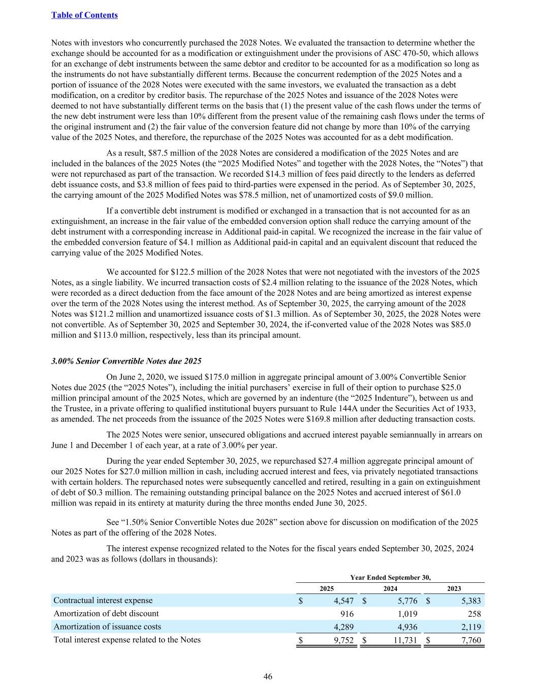 Notes with investors who concurrently purchased the 2028 Notes. We evaluated the transaction to determine whether the exchange should be accounted for as a modification or extinguishment under the provisions of ASC 470-50, which allows for an exchange of debt instruments between the same debtor and creditor to be accounted for as a modification so long as the instruments do not have substantially different terms. Because the concurrent redemption of the 2025 Notes and a portion of issuance of the 2028 Notes were executed with the same investors, we evaluated the transaction as a debt modification, on a creditor by creditor basis. The repurchase of the 2025 Notes and issuance of the 2028 Notes were deemed to not have substantially different terms on the basis that (1) the present value of the cash flows under the terms of the new debt instrument were less than 10% different from the present value of the remaining cash flows under the terms of the original instrument and (2) the fair value of the conversion feature did not change by more than 10% of the carrying value of the 2025 Notes, and therefore, the repurchase of the 2025 Notes was accounted for as a debt modification. As a result, $87.5 million of the 2028 Notes are considered a modification of the 2025 Notes and are included in the balances of the 2025 Notes (the “2025 Modified Notes” and together with the 2028 Notes, the “Notes”) that were not repurchased as part of the transaction. We recorded $14.3 million of fees paid directly to the lenders as deferred debt issuance costs, and $3.8 million of fees paid to third-parties were expensed in the period. As of September 30, 2025, the carrying amount of the 2025 Modified Notes was $78.5 million, net of unamortized costs of $9.0 million. If a convertible debt instrument is modified or exchanged in a transaction that is not accounted for as an extinguishment, an increase in the fair value of the embedded conversion option shall reduce the carrying amount of the debt instrument with a corresponding increase in Additional paid-in capital. We recognized the increase in the fair value of the embedded conversion feature of $4.1 million as Additional paid-in capital and an equivalent discount that reduced the carrying value of the 2025 Modified Notes. We accounted for $122.5 million of the 2028 Notes that were not negotiated with the investors of the 2025 Notes, as a single liability. We incurred transaction costs of $2.4 million relating to the issuance of the 2028 Notes, which were recorded as a direct deduction from the face amount of the 2028 Notes and are being amortized as interest expense over the term of the 2028 Notes using the interest method. As of September 30, 2025, the carrying amount of the 2028 Notes was $121.2 million and unamortized issuance costs of $1.3 million. As of September 30, 2025, the 2028 Notes were not convertible. As of September 30, 2025 and September 30, 2024, the if-converted value of the 2028 Notes was $85.0 million and $113.0 million, respectively, less than its principal amount. 3.00% Senior Convertible Notes due 2025 On June 2, 2020, we issued $175.0 million in aggregate principal amount of 3.00% Convertible Senior Notes due 2025 (the “2025 Notes”), including the initial purchasers’ exercise in full of their option to purchase $25.0 million principal amount of the 2025 Notes, which are governed by an indenture (the “2025 Indenture”), between us and the Trustee, in a private offering to qualified institutional buyers pursuant to Rule 144A under the Securities Act of 1933, as amended. The net proceeds from the issuance of the 2025 Notes were $169.8 million after deducting transaction costs. The 2025 Notes were senior, unsecured obligations and accrued interest payable semiannually in arrears on June 1 and December 1 of each year, at a rate of 3.00% per year. During the year ended September 30, 2025, we repurchased $27.4 million aggregate principal amount of our 2025 Notes for $27.0 million million in cash, including accrued interest and fees, via privately negotiated transactions with certain holders. The repurchased notes were subsequently cancelled and retired, resulting in a gain on extinguishment of debt of $0.3 million. The remaining outstanding principal balance on the 2025 Notes and accrued interest of $61.0 million was repaid in its entirety at maturity during the three months ended June 30, 2025. See “1.50% Senior Convertible Notes due 2028” section above for discussion on modification of the 2025 Notes as part of the offering of the 2028 Notes. The interest expense recognized related to the Notes for the fiscal years ended September 30, 2025, 2024 and 2023 was as follows (dollars in thousands): Year Ended September 30, 2025 2024 2023 Contractual interest expense $ 4,547 $ 5,776 $ 5,383 Amortization of debt discount 916 1,019 258 Amortization of issuance costs 4,289 4,936 2,119 Total interest expense related to the Notes $ 9,752 $ 11,731 $ 7,760 Table of Contents 46