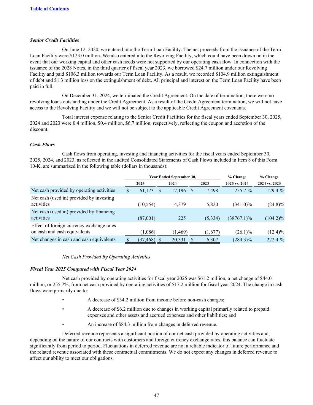 Senior Credit Facilities On June 12, 2020, we entered into the Term Loan Facility. The net proceeds from the issuance of the Term Loan Facility were $123.0 million. We also entered into the Revolving Facility, which could have been drawn on in the event that our working capital and other cash needs were not supported by our operating cash flow. In connection with the issuance of the 2028 Notes, in the third quarter of fiscal year 2023, we borrowed $24.7 million under our Revolving Facility and paid $106.3 million towards our Term Loan Facility. As a result, we recorded $104.9 million extinguishment of debt and $1.3 million loss on the extinguishment of debt. All principal and interest on the Term Loan Facility have been paid in full. On December 31, 2024, we terminated the Credit Agreement. On the date of termination, there were no revolving loans outstanding under the Credit Agreement. As a result of the Credit Agreement termination, we will not have access to the Revolving Facility and we will not be subject to the applicable Credit Agreement covenants. Total interest expense relating to the Senior Credit Facilities for the fiscal years ended September 30, 2025, 2024 and 2023 were 0.4 million, $0.4 million, $6.7 million, respectively, reflecting the coupon and accretion of the discount. Cash Flows Cash flows from operating, investing and financing activities for the fiscal years ended September 30, 2025, 2024, and 2023, as reflected in the audited Consolidated Statements of Cash Flows included in Item 8 of this Form 10-K, are summarized in the following table (dollars in thousands): Year Ended September 30, % Change % Change 2025 2024 2023 2025 vs. 2024 2024 vs. 2023 Net cash provided by operating activities $ 61,173 $ 17,196 $ 7,498 255.7 % 129.4 % Net cash (used in) provided by investing activities (10,554) 4,379 5,820 (341.0) % (24.8) % Net cash (used in) provided by financing activities (87,001) 225 (5,334) (38767.1) % (104.2) % Effect of foreign currency exchange rates on cash and cash equivalents (1,086) (1,469) (1,677) (26.1) % (12.4) % Net changes in cash and cash equivalents $ (37,468) $ 20,331 $ 6,307 (284.3) % 222.4 % Net Cash Provided By Operating Activities Fiscal Year 2025 Compared with Fiscal Year 2024 Net cash provided by operating activities for fiscal year 2025 was $61.2 million, a net change of $44.0 million, or 255.7%, from net cash provided by operating activities of $17.2 million for fiscal year 2024. The change in cash flows were primarily due to: • A decrease of $34.2 million from income before non-cash charges; • A decrease of $6.2 million due to changes in working capital primarily related to prepaid expenses and other assets and accrued expenses and other liabilities; and • An increase of $84.3 million from changes in deferred revenue. Deferred revenue represents a significant portion of our net cash provided by operating activities and, depending on the nature of our contracts with customers and foreign currency exchange rates, this balance can fluctuate significantly from period to period. Fluctuations in deferred revenue are not a reliable indicator of future performance and the related revenue associated with these contractual commitments. We do not expect any changes in deferred revenue to affect our ability to meet our obligations. Table of Contents 47