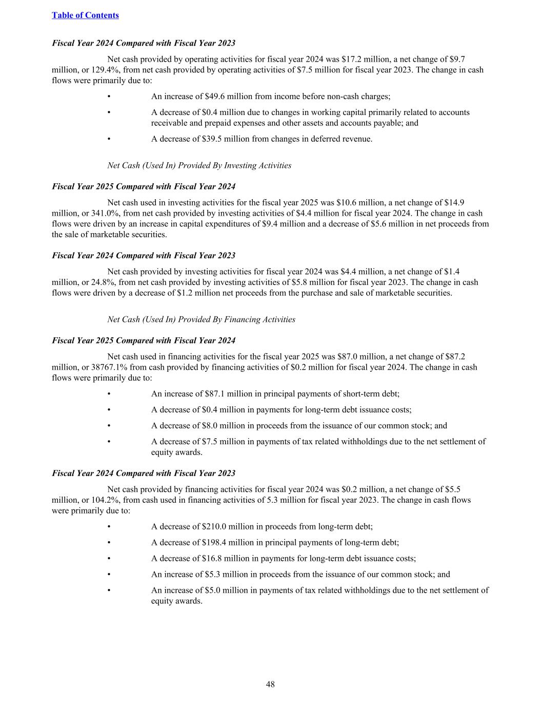 Fiscal Year 2024 Compared with Fiscal Year 2023 Net cash provided by operating activities for fiscal year 2024 was $17.2 million, a net change of $9.7 million, or 129.4%, from net cash provided by operating activities of $7.5 million for fiscal year 2023. The change in cash flows were primarily due to: • An increase of $49.6 million from income before non-cash charges; • A decrease of $0.4 million due to changes in working capital primarily related to accounts receivable and prepaid expenses and other assets and accounts payable; and • A decrease of $39.5 million from changes in deferred revenue. Net Cash (Used In) Provided By Investing Activities Fiscal Year 2025 Compared with Fiscal Year 2024 Net cash used in investing activities for the fiscal year 2025 was $10.6 million, a net change of $14.9 million, or 341.0%, from net cash provided by investing activities of $4.4 million for fiscal year 2024. The change in cash flows were driven by an increase in capital expenditures of $9.4 million and a decrease of $5.6 million in net proceeds from the sale of marketable securities. Fiscal Year 2024 Compared with Fiscal Year 2023 Net cash provided by investing activities for fiscal year 2024 was $4.4 million, a net change of $1.4 million, or 24.8%, from net cash provided by investing activities of $5.8 million for fiscal year 2023. The change in cash flows were driven by a decrease of $1.2 million net proceeds from the purchase and sale of marketable securities. Net Cash (Used In) Provided By Financing Activities Fiscal Year 2025 Compared with Fiscal Year 2024 Net cash used in financing activities for the fiscal year 2025 was $87.0 million, a net change of $87.2 million, or 38767.1% from cash provided by financing activities of $0.2 million for fiscal year 2024. The change in cash flows were primarily due to: • An increase of $87.1 million in principal payments of short-term debt; • A decrease of $0.4 million in payments for long-term debt issuance costs; • A decrease of $8.0 million in proceeds from the issuance of our common stock; and • A decrease of $7.5 million in payments of tax related withholdings due to the net settlement of equity awards. Fiscal Year 2024 Compared with Fiscal Year 2023 Net cash provided by financing activities for fiscal year 2024 was $0.2 million, a net change of $5.5 million, or 104.2%, from cash used in financing activities of 5.3 million for fiscal year 2023. The change in cash flows were primarily due to: • A decrease of $210.0 million in proceeds from long-term debt; • A decrease of $198.4 million in principal payments of long-term debt; • A decrease of $16.8 million in payments for long-term debt issuance costs; • An increase of $5.3 million in proceeds from the issuance of our common stock; and • An increase of $5.0 million in payments of tax related withholdings due to the net settlement of equity awards. Table of Contents 48