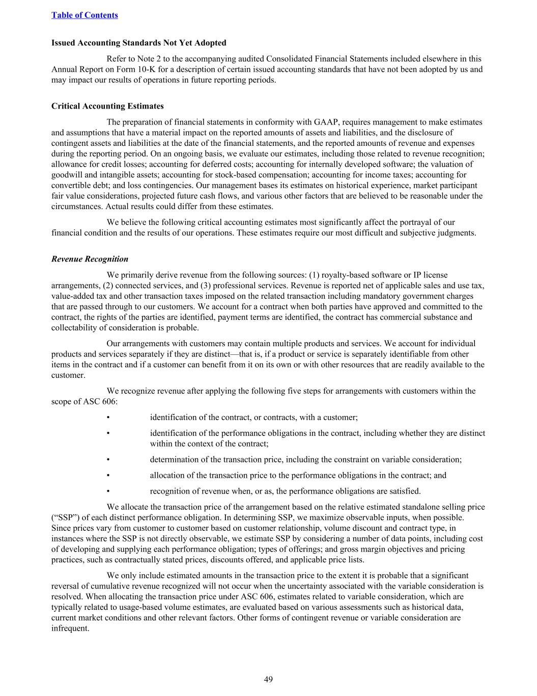 Issued Accounting Standards Not Yet Adopted Refer to Note 2 to the accompanying audited Consolidated Financial Statements included elsewhere in this Annual Report on Form 10-K for a description of certain issued accounting standards that have not been adopted by us and may impact our results of operations in future reporting periods. Critical Accounting Estimates The preparation of financial statements in conformity with GAAP, requires management to make estimates and assumptions that have a material impact on the reported amounts of assets and liabilities, and the disclosure of contingent assets and liabilities at the date of the financial statements, and the reported amounts of revenue and expenses during the reporting period. On an ongoing basis, we evaluate our estimates, including those related to revenue recognition; allowance for credit losses; accounting for deferred costs; accounting for internally developed software; the valuation of goodwill and intangible assets; accounting for stock-based compensation; accounting for income taxes; accounting for convertible debt; and loss contingencies. Our management bases its estimates on historical experience, market participant fair value considerations, projected future cash flows, and various other factors that are believed to be reasonable under the circumstances. Actual results could differ from these estimates. We believe the following critical accounting estimates most significantly affect the portrayal of our financial condition and the results of our operations. These estimates require our most difficult and subjective judgments. Revenue Recognition We primarily derive revenue from the following sources: (1) royalty-based software or IP license arrangements, (2) connected services, and (3) professional services. Revenue is reported net of applicable sales and use tax, value-added tax and other transaction taxes imposed on the related transaction including mandatory government charges that are passed through to our customers. We account for a contract when both parties have approved and committed to the contract, the rights of the parties are identified, payment terms are identified, the contract has commercial substance and collectability of consideration is probable. Our arrangements with customers may contain multiple products and services. We account for individual products and services separately if they are distinct—that is, if a product or service is separately identifiable from other items in the contract and if a customer can benefit from it on its own or with other resources that are readily available to the customer. We recognize revenue after applying the following five steps for arrangements with customers within the scope of ASC 606: • identification of the contract, or contracts, with a customer; • identification of the performance obligations in the contract, including whether they are distinct within the context of the contract; • determination of the transaction price, including the constraint on variable consideration; • allocation of the transaction price to the performance obligations in the contract; and • recognition of revenue when, or as, the performance obligations are satisfied. We allocate the transaction price of the arrangement based on the relative estimated standalone selling price (“SSP”) of each distinct performance obligation. In determining SSP, we maximize observable inputs, when possible. Since prices vary from customer to customer based on customer relationship, volume discount and contract type, in instances where the SSP is not directly observable, we estimate SSP by considering a number of data points, including cost of developing and supplying each performance obligation; types of offerings; and gross margin objectives and pricing practices, such as contractually stated prices, discounts offered, and applicable price lists. We only include estimated amounts in the transaction price to the extent it is probable that a significant reversal of cumulative revenue recognized will not occur when the uncertainty associated with the variable consideration is resolved. When allocating the transaction price under ASC 606, estimates related to variable consideration, which are typically related to usage-based volume estimates, are evaluated based on various assessments such as historical data, current market conditions and other relevant factors. Other forms of contingent revenue or variable consideration are infrequent. Table of Contents 49