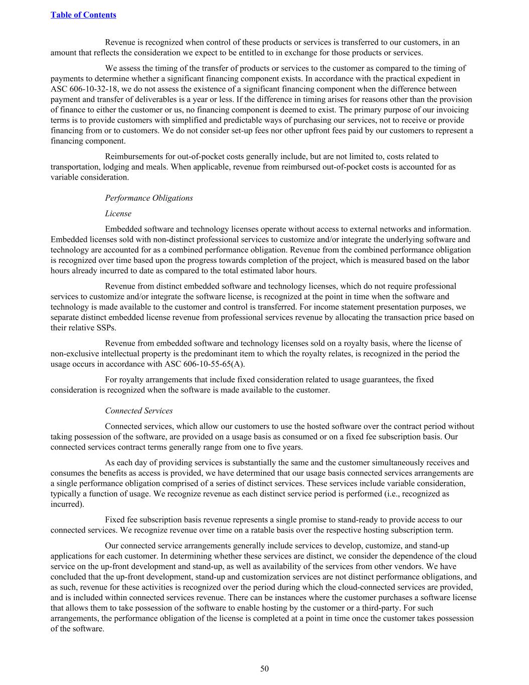 Revenue is recognized when control of these products or services is transferred to our customers, in an amount that reflects the consideration we expect to be entitled to in exchange for those products or services. We assess the timing of the transfer of products or services to the customer as compared to the timing of payments to determine whether a significant financing component exists. In accordance with the practical expedient in ASC 606-10-32-18, we do not assess the existence of a significant financing component when the difference between payment and transfer of deliverables is a year or less. If the difference in timing arises for reasons other than the provision of finance to either the customer or us, no financing component is deemed to exist. The primary purpose of our invoicing terms is to provide customers with simplified and predictable ways of purchasing our services, not to receive or provide financing from or to customers. We do not consider set-up fees nor other upfront fees paid by our customers to represent a financing component. Reimbursements for out-of-pocket costs generally include, but are not limited to, costs related to transportation, lodging and meals. When applicable, revenue from reimbursed out-of-pocket costs is accounted for as variable consideration. Performance Obligations License Embedded software and technology licenses operate without access to external networks and information. Embedded licenses sold with non-distinct professional services to customize and/or integrate the underlying software and technology are accounted for as a combined performance obligation. Revenue from the combined performance obligation is recognized over time based upon the progress towards completion of the project, which is measured based on the labor hours already incurred to date as compared to the total estimated labor hours. Revenue from distinct embedded software and technology licenses, which do not require professional services to customize and/or integrate the software license, is recognized at the point in time when the software and technology is made available to the customer and control is transferred. For income statement presentation purposes, we separate distinct embedded license revenue from professional services revenue by allocating the transaction price based on their relative SSPs. Revenue from embedded software and technology licenses sold on a royalty basis, where the license of non-exclusive intellectual property is the predominant item to which the royalty relates, is recognized in the period the usage occurs in accordance with ASC 606-10-55-65(A). For royalty arrangements that include fixed consideration related to usage guarantees, the fixed consideration is recognized when the software is made available to the customer. Connected Services Connected services, which allow our customers to use the hosted software over the contract period without taking possession of the software, are provided on a usage basis as consumed or on a fixed fee subscription basis. Our connected services contract terms generally range from one to five years. As each day of providing services is substantially the same and the customer simultaneously receives and consumes the benefits as access is provided, we have determined that our usage basis connected services arrangements are a single performance obligation comprised of a series of distinct services. These services include variable consideration, typically a function of usage. We recognize revenue as each distinct service period is performed (i.e., recognized as incurred). Fixed fee subscription basis revenue represents a single promise to stand-ready to provide access to our connected services. We recognize revenue over time on a ratable basis over the respective hosting subscription term. Our connected service arrangements generally include services to develop, customize, and stand-up applications for each customer. In determining whether these services are distinct, we consider the dependence of the cloud service on the up-front development and stand-up, as well as availability of the services from other vendors. We have concluded that the up-front development, stand-up and customization services are not distinct performance obligations, and as such, revenue for these activities is recognized over the period during which the cloud-connected services are provided, and is included within connected services revenue. There can be instances where the customer purchases a software license that allows them to take possession of the software to enable hosting by the customer or a third-party. For such arrangements, the performance obligation of the license is completed at a point in time once the customer takes possession of the software. Table of Contents 50