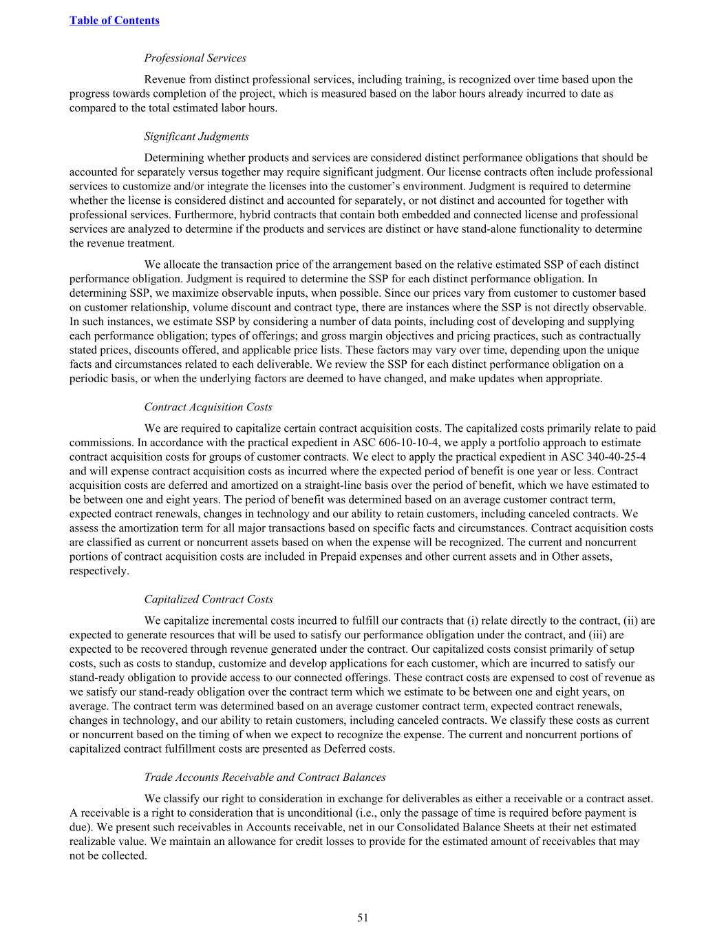 Professional Services Revenue from distinct professional services, including training, is recognized over time based upon the progress towards completion of the project, which is measured based on the labor hours already incurred to date as compared to the total estimated labor hours. Significant Judgments Determining whether products and services are considered distinct performance obligations that should be accounted for separately versus together may require significant judgment. Our license contracts often include professional services to customize and/or integrate the licenses into the customer’s environment. Judgment is required to determine whether the license is considered distinct and accounted for separately, or not distinct and accounted for together with professional services. Furthermore, hybrid contracts that contain both embedded and connected license and professional services are analyzed to determine if the products and services are distinct or have stand-alone functionality to determine the revenue treatment. We allocate the transaction price of the arrangement based on the relative estimated SSP of each distinct performance obligation. Judgment is required to determine the SSP for each distinct performance obligation. In determining SSP, we maximize observable inputs, when possible. Since our prices vary from customer to customer based on customer relationship, volume discount and contract type, there are instances where the SSP is not directly observable. In such instances, we estimate SSP by considering a number of data points, including cost of developing and supplying each performance obligation; types of offerings; and gross margin objectives and pricing practices, such as contractually stated prices, discounts offered, and applicable price lists. These factors may vary over time, depending upon the unique facts and circumstances related to each deliverable. We review the SSP for each distinct performance obligation on a periodic basis, or when the underlying factors are deemed to have changed, and make updates when appropriate. Contract Acquisition Costs We are required to capitalize certain contract acquisition costs. The capitalized costs primarily relate to paid commissions. In accordance with the practical expedient in ASC 606-10-10-4, we apply a portfolio approach to estimate contract acquisition costs for groups of customer contracts. We elect to apply the practical expedient in ASC 340-40-25-4 and will expense contract acquisition costs as incurred where the expected period of benefit is one year or less. Contract acquisition costs are deferred and amortized on a straight-line basis over the period of benefit, which we have estimated to be between one and eight years. The period of benefit was determined based on an average customer contract term, expected contract renewals, changes in technology and our ability to retain customers, including canceled contracts. We assess the amortization term for all major transactions based on specific facts and circumstances. Contract acquisition costs are classified as current or noncurrent assets based on when the expense will be recognized. The current and noncurrent portions of contract acquisition costs are included in Prepaid expenses and other current assets and in Other assets, respectively. Capitalized Contract Costs We capitalize incremental costs incurred to fulfill our contracts that (i) relate directly to the contract, (ii) are expected to generate resources that will be used to satisfy our performance obligation under the contract, and (iii) are expected to be recovered through revenue generated under the contract. Our capitalized costs consist primarily of setup costs, such as costs to standup, customize and develop applications for each customer, which are incurred to satisfy our stand-ready obligation to provide access to our connected offerings. These contract costs are expensed to cost of revenue as we satisfy our stand-ready obligation over the contract term which we estimate to be between one and eight years, on average. The contract term was determined based on an average customer contract term, expected contract renewals, changes in technology, and our ability to retain customers, including canceled contracts. We classify these costs as current or noncurrent based on the timing of when we expect to recognize the expense. The current and noncurrent portions of capitalized contract fulfillment costs are presented as Deferred costs. Trade Accounts Receivable and Contract Balances We classify our right to consideration in exchange for deliverables as either a receivable or a contract asset. A receivable is a right to consideration that is unconditional (i.e., only the passage of time is required before payment is due). We present such receivables in Accounts receivable, net in our Consolidated Balance Sheets at their net estimated realizable value. We maintain an allowance for credit losses to provide for the estimated amount of receivables that may not be collected. Table of Contents 51