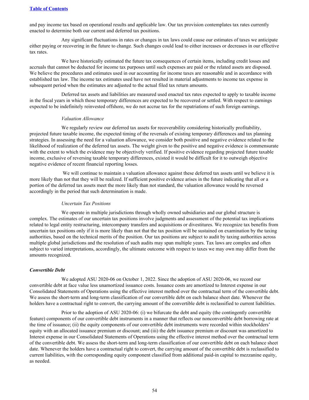 and pay income tax based on operational results and applicable law. Our tax provision contemplates tax rates currently enacted to determine both our current and deferred tax positions. Any significant fluctuations in rates or changes in tax laws could cause our estimates of taxes we anticipate either paying or recovering in the future to change. Such changes could lead to either increases or decreases in our effective tax rates. We have historically estimated the future tax consequences of certain items, including credit losses and accruals that cannot be deducted for income tax purposes until such expenses are paid or the related assets are disposed. We believe the procedures and estimates used in our accounting for income taxes are reasonable and in accordance with established tax law. The income tax estimates used have not resulted in material adjustments to income tax expense in subsequent period when the estimates are adjusted to the actual filed tax return amounts. Deferred tax assets and liabilities are measured used enacted tax rates expected to apply to taxable income in the fiscal years in which those temporary differences are expected to be recovered or settled. With respect to earnings expected to be indefinitely reinvested offshore, we do not accrue tax for the repatriations of such foreign earnings. Valuation Allowance We regularly review our deferred tax assets for recoverability considering historically profitability, projected future taxable income, the expected timing of the reversals of existing temporary differences and tax planning strategies. In assessing the need for a valuation allowance, we consider both positive and negative evidence related to the likelihood of realization of the deferred tax assets. The weight given to the positive and negative evidence is commensurate with the extent to which the evidence may be objectively verified. If positive evidence regarding projected future taxable income, exclusive of reversing taxable temporary differences, existed it would be difficult for it to outweigh objective negative evidence of recent financial reporting losses. We will continue to maintain a valuation allowance against these deferred tax assets until we believe it is more likely than not that they will be realized. If sufficient positive evidence arises in the future indicating that all or a portion of the deferred tax assets meet the more likely than not standard, the valuation allowance would be reversed accordingly in the period that such determination is made. Uncertain Tax Positions We operate in multiple jurisdictions through wholly owned subsidiaries and our global structure is complex. The estimates of our uncertain tax positions involve judgments and assessment of the potential tax implications related to legal entity restructuring, intercompany transfers and acquisitions or divestitures. We recognize tax benefits from uncertain tax positions only if it is more likely than not that the tax position will be sustained on examination by the taxing authorities, based on the technical merits of the position. Our tax positions are subject to audit by taxing authorities across multiple global jurisdictions and the resolution of such audits may span multiple years. Tax laws are complex and often subject to varied interpretations, accordingly, the ultimate outcome with respect to taxes we may own may differ from the amounts recognized. Convertible Debt We adopted ASU 2020-06 on October 1, 2022. Since the adoption of ASU 2020-06, we record our convertible debt at face value less unamortized issuance costs. Issuance costs are amortized to Interest expense in our Consolidated Statements of Operations using the effective interest method over the contractual term of the convertible debt. We assess the short-term and long-term classification of our convertible debt on each balance sheet date. Whenever the holders have a contractual right to convert, the carrying amount of the convertible debt is reclassified to current liabilities. Prior to the adoption of ASU 2020-06: (i) we bifurcate the debt and equity (the contingently convertible feature) components of our convertible debt instruments in a manner that reflects our nonconvertible debt borrowing rate at the time of issuance; (ii) the equity components of our convertible debt instruments were recorded within stockholders’ equity with an allocated issuance premium or discount; and (iii) the debt issuance premium or discount was amortized to Interest expense in our Consolidated Statements of Operations using the effective interest method over the contractual term of the convertible debt. We assess the short-term and long-term classification of our convertible debt on each balance sheet date. Whenever the holders have a contractual right to convert, the carrying amount of the convertible debt is reclassified to current liabilities, with the corresponding equity component classified from additional paid-in capital to mezzanine equity, as needed. Table of Contents 54