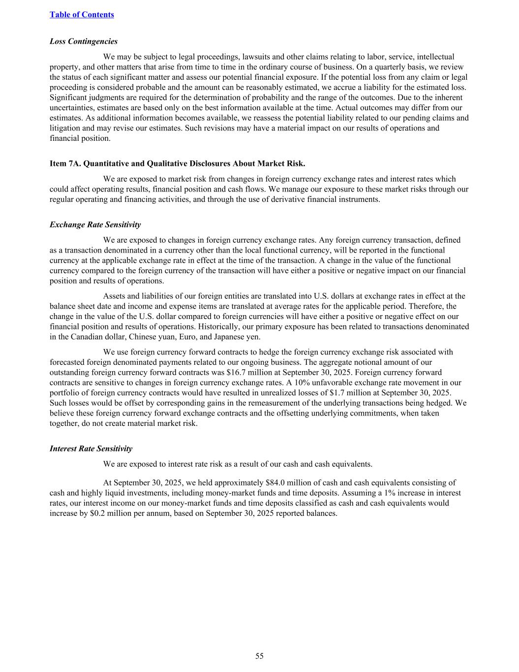 Loss Contingencies We may be subject to legal proceedings, lawsuits and other claims relating to labor, service, intellectual property, and other matters that arise from time to time in the ordinary course of business. On a quarterly basis, we review the status of each significant matter and assess our potential financial exposure. If the potential loss from any claim or legal proceeding is considered probable and the amount can be reasonably estimated, we accrue a liability for the estimated loss. Significant judgments are required for the determination of probability and the range of the outcomes. Due to the inherent uncertainties, estimates are based only on the best information available at the time. Actual outcomes may differ from our estimates. As additional information becomes available, we reassess the potential liability related to our pending claims and litigation and may revise our estimates. Such revisions may have a material impact on our results of operations and financial position. Item 7A. Quantitative and Qualitative Disclosures About Market Risk. We are exposed to market risk from changes in foreign currency exchange rates and interest rates which could affect operating results, financial position and cash flows. We manage our exposure to these market risks through our regular operating and financing activities, and through the use of derivative financial instruments. Exchange Rate Sensitivity We are exposed to changes in foreign currency exchange rates. Any foreign currency transaction, defined as a transaction denominated in a currency other than the local functional currency, will be reported in the functional currency at the applicable exchange rate in effect at the time of the transaction. A change in the value of the functional currency compared to the foreign currency of the transaction will have either a positive or negative impact on our financial position and results of operations. Assets and liabilities of our foreign entities are translated into U.S. dollars at exchange rates in effect at the balance sheet date and income and expense items are translated at average rates for the applicable period. Therefore, the change in the value of the U.S. dollar compared to foreign currencies will have either a positive or negative effect on our financial position and results of operations. Historically, our primary exposure has been related to transactions denominated in the Canadian dollar, Chinese yuan, Euro, and Japanese yen. We use foreign currency forward contracts to hedge the foreign currency exchange risk associated with forecasted foreign denominated payments related to our ongoing business. The aggregate notional amount of our outstanding foreign currency forward contracts was $16.7 million at September 30, 2025. Foreign currency forward contracts are sensitive to changes in foreign currency exchange rates. A 10% unfavorable exchange rate movement in our portfolio of foreign currency contracts would have resulted in unrealized losses of $1.7 million at September 30, 2025. Such losses would be offset by corresponding gains in the remeasurement of the underlying transactions being hedged. We believe these foreign currency forward exchange contracts and the offsetting underlying commitments, when taken together, do not create material market risk. Interest Rate Sensitivity We are exposed to interest rate risk as a result of our cash and cash equivalents. At September 30, 2025, we held approximately $84.0 million of cash and cash equivalents consisting of cash and highly liquid investments, including money-market funds and time deposits. Assuming a 1% increase in interest rates, our interest income on our money-market funds and time deposits classified as cash and cash equivalents would increase by $0.2 million per annum, based on September 30, 2025 reported balances. Table of Contents 55