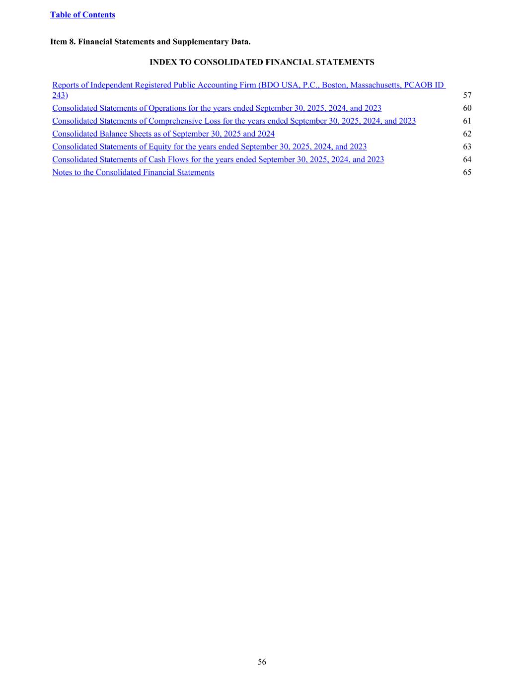 Item 8. Financial Statements and Supplementary Data. INDEX TO CONSOLIDATED FINANCIAL STATEMENTS Reports of Independent Registered Public Accounting Firm (BDO USA, P.C., Boston, Massachusetts, PCAOB ID 243) 57 Consolidated Statements of Operations for the years ended September 30, 2025, 2024, and 2023 60 Consolidated Statements of Comprehensive Loss for the years ended September 30, 2025, 2024, and 2023 61 Consolidated Balance Sheets as of September 30, 2025 and 2024 62 Consolidated Statements of Equity for the years ended September 30, 2025, 2024, and 2023 63 Consolidated Statements of Cash Flows for the years ended September 30, 2025, 2024, and 2023 64 Notes to the Consolidated Financial Statements 65 Table of Contents 56