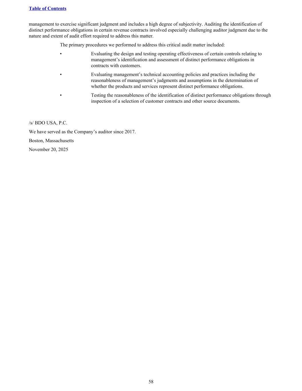 management to exercise significant judgment and includes a high degree of subjectivity. Auditing the identification of distinct performance obligations in certain revenue contracts involved especially challenging auditor judgment due to the nature and extent of audit effort required to address this matter. The primary procedures we performed to address this critical audit matter included: • Evaluating the design and testing operating effectiveness of certain controls relating to management’s identification and assessment of distinct performance obligations in contracts with customers. • Evaluating management’s technical accounting policies and practices including the reasonableness of management’s judgments and assumptions in the determination of whether the products and services represent distinct performance obligations. • Testing the reasonableness of the identification of distinct performance obligations through inspection of a selection of customer contracts and other source documents. /s/ BDO USA, P.C. We have served as the Company’s auditor since 2017. Boston, Massachusetts November 20, 2025 Table of Contents 58