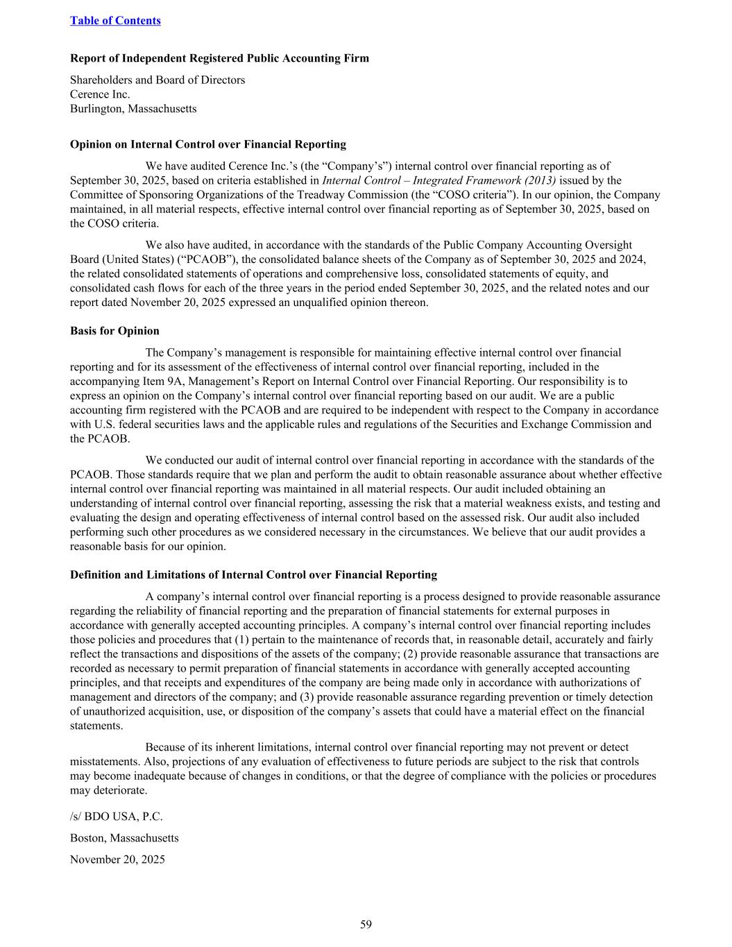 Report of Independent Registered Public Accounting Firm Shareholders and Board of Directors Cerence Inc. Burlington, Massachusetts Opinion on Internal Control over Financial Reporting We have audited Cerence Inc.’s (the “Company’s”) internal control over financial reporting as of September 30, 2025, based on criteria established in Internal Control – Integrated Framework (2013) issued by the Committee of Sponsoring Organizations of the Treadway Commission (the “COSO criteria”). In our opinion, the Company maintained, in all material respects, effective internal control over financial reporting as of September 30, 2025, based on the COSO criteria. We also have audited, in accordance with the standards of the Public Company Accounting Oversight Board (United States) (“PCAOB”), the consolidated balance sheets of the Company as of September 30, 2025 and 2024, the related consolidated statements of operations and comprehensive loss, consolidated statements of equity, and consolidated cash flows for each of the three years in the period ended September 30, 2025, and the related notes and our report dated November 20, 2025 expressed an unqualified opinion thereon. Basis for Opinion The Company’s management is responsible for maintaining effective internal control over financial reporting and for its assessment of the effectiveness of internal control over financial reporting, included in the accompanying Item 9A, Management’s Report on Internal Control over Financial Reporting. Our responsibility is to express an opinion on the Company’s internal control over financial reporting based on our audit. We are a public accounting firm registered with the PCAOB and are required to be independent with respect to the Company in accordance with U.S. federal securities laws and the applicable rules and regulations of the Securities and Exchange Commission and the PCAOB. We conducted our audit of internal control over financial reporting in accordance with the standards of the PCAOB. Those standards require that we plan and perform the audit to obtain reasonable assurance about whether effective internal control over financial reporting was maintained in all material respects. Our audit included obtaining an understanding of internal control over financial reporting, assessing the risk that a material weakness exists, and testing and evaluating the design and operating effectiveness of internal control based on the assessed risk. Our audit also included performing such other procedures as we considered necessary in the circumstances. We believe that our audit provides a reasonable basis for our opinion. Definition and Limitations of Internal Control over Financial Reporting A company’s internal control over financial reporting is a process designed to provide reasonable assurance regarding the reliability of financial reporting and the preparation of financial statements for external purposes in accordance with generally accepted accounting principles. A company’s internal control over financial reporting includes those policies and procedures that (1) pertain to the maintenance of records that, in reasonable detail, accurately and fairly reflect the transactions and dispositions of the assets of the company; (2) provide reasonable assurance that transactions are recorded as necessary to permit preparation of financial statements in accordance with generally accepted accounting principles, and that receipts and expenditures of the company are being made only in accordance with authorizations of management and directors of the company; and (3) provide reasonable assurance regarding prevention or timely detection of unauthorized acquisition, use, or disposition of the company’s assets that could have a material effect on the financial statements. Because of its inherent limitations, internal control over financial reporting may not prevent or detect misstatements. Also, projections of any evaluation of effectiveness to future periods are subject to the risk that controls may become inadequate because of changes in conditions, or that the degree of compliance with the policies or procedures may deteriorate. /s/ BDO USA, P.C. Boston, Massachusetts November 20, 2025 Table of Contents 59