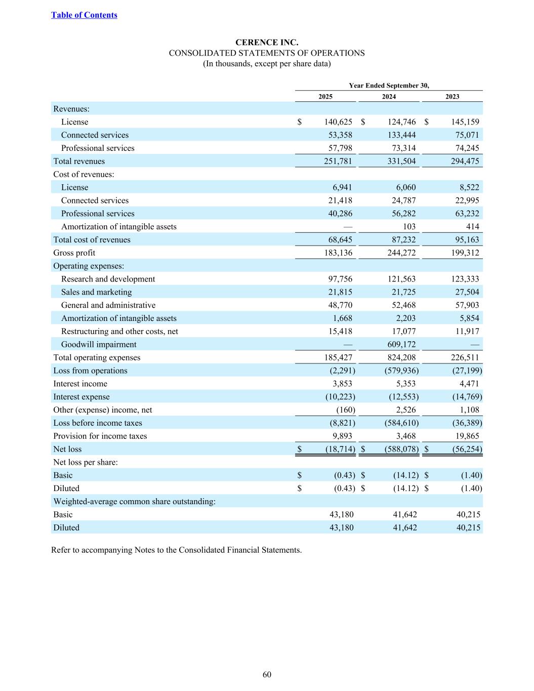 CERENCE INC. CONSOLIDATED STATEMENTS OF OPERATIONS (In thousands, except per share data) Year Ended September 30, 2025 2024 2023 Revenues: License $ 140,625 $ 124,746 $ 145,159 Connected services 53,358 133,444 75,071 Professional services 57,798 73,314 74,245 Total revenues 251,781 331,504 294,475 Cost of revenues: License 6,941 6,060 8,522 Connected services 21,418 24,787 22,995 Professional services 40,286 56,282 63,232 Amortization of intangible assets — 103 414 Total cost of revenues 68,645 87,232 95,163 Gross profit 183,136 244,272 199,312 Operating expenses: Research and development 97,756 121,563 123,333 Sales and marketing 21,815 21,725 27,504 General and administrative 48,770 52,468 57,903 Amortization of intangible assets 1,668 2,203 5,854 Restructuring and other costs, net 15,418 17,077 11,917 Goodwill impairment — 609,172 — Total operating expenses 185,427 824,208 226,511 Loss from operations (2,291) (579,936) (27,199) Interest income 3,853 5,353 4,471 Interest expense (10,223) (12,553) (14,769) Other (expense) income, net (160) 2,526 1,108 Loss before income taxes (8,821) (584,610) (36,389) Provision for income taxes 9,893 3,468 19,865 Net loss $ (18,714) $ (588,078) $ (56,254) Net loss per share: Basic $ (0.43) $ (14.12) $ (1.40) Diluted $ (0.43) $ (14.12) $ (1.40) Weighted-average common share outstanding: Basic 43,180 41,642 40,215 Diluted 43,180 41,642 40,215 Refer to accompanying Notes to the Consolidated Financial Statements. Table of Contents 60