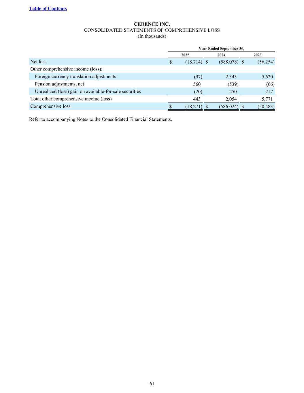 CERENCE INC. CONSOLIDATED STATEMENTS OF COMPREHENSIVE LOSS (In thousands) Year Ended September 30, 2025 2024 2023 Net loss $ (18,714) $ (588,078) $ (56,254) Other comprehensive income (loss): Foreign currency translation adjustments (97) 2,343 5,620 Pension adjustments, net 560 (539) (66) Unrealized (loss) gain on available-for-sale securities (20) 250 217 Total other comprehensive income (loss) 443 2,054 5,771 Comprehensive loss $ (18,271) $ (586,024) $ (50,483) Refer to accompanying Notes to the Consolidated Financial Statements. Table of Contents 61