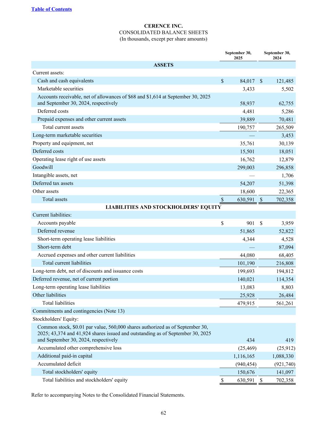 CERENCE INC. CONSOLIDATED BALANCE SHEETS (In thousands, except per share amounts) September 30, 2025 September 30, 2024 ASSETS Current assets: Cash and cash equivalents $ 84,017 $ 121,485 Marketable securities 3,433 5,502 Accounts receivable, net of allowances of $68 and $1,614 at September 30, 2025 and September 30, 2024, respectively 58,937 62,755 Deferred costs 4,481 5,286 Prepaid expenses and other current assets 39,889 70,481 Total current assets 190,757 265,509 Long-term marketable securities — 3,453 Property and equipment, net 35,761 30,139 Deferred costs 15,501 18,051 Operating lease right of use assets 16,762 12,879 Goodwill 299,003 296,858 Intangible assets, net — 1,706 Deferred tax assets 54,207 51,398 Other assets 18,600 22,365 Total assets $ 630,591 $ 702,358 LIABILITIES AND STOCKHOLDERS' EQUITY Current liabilities: Accounts payable $ 901 $ 3,959 Deferred revenue 51,865 52,822 Short-term operating lease liabilities 4,344 4,528 Short-term debt — 87,094 Accrued expenses and other current liabilities 44,080 68,405 Total current liabilities 101,190 216,808 Long-term debt, net of discounts and issuance costs 199,693 194,812 Deferred revenue, net of current portion 140,021 114,354 Long-term operating lease liabilities 13,083 8,803 Other liabilities 25,928 26,484 Total liabilities 479,915 561,261 Commitments and contingencies (Note 13) Stockholders' Equity: Common stock, $0.01 par value, 560,000 shares authorized as of September 30, 2025; 43,374 and 41,924 shares issued and outstanding as of September 30, 2025 and September 30, 2024, respectively 434 419 Accumulated other comprehensive loss (25,469) (25,912) Additional paid-in capital 1,116,165 1,088,330 Accumulated deficit (940,454) (921,740) Total stockholders' equity 150,676 141,097 Total liabilities and stockholders' equity $ 630,591 $ 702,358 Refer to accompanying Notes to the Consolidated Financial Statements. Table of Contents 62