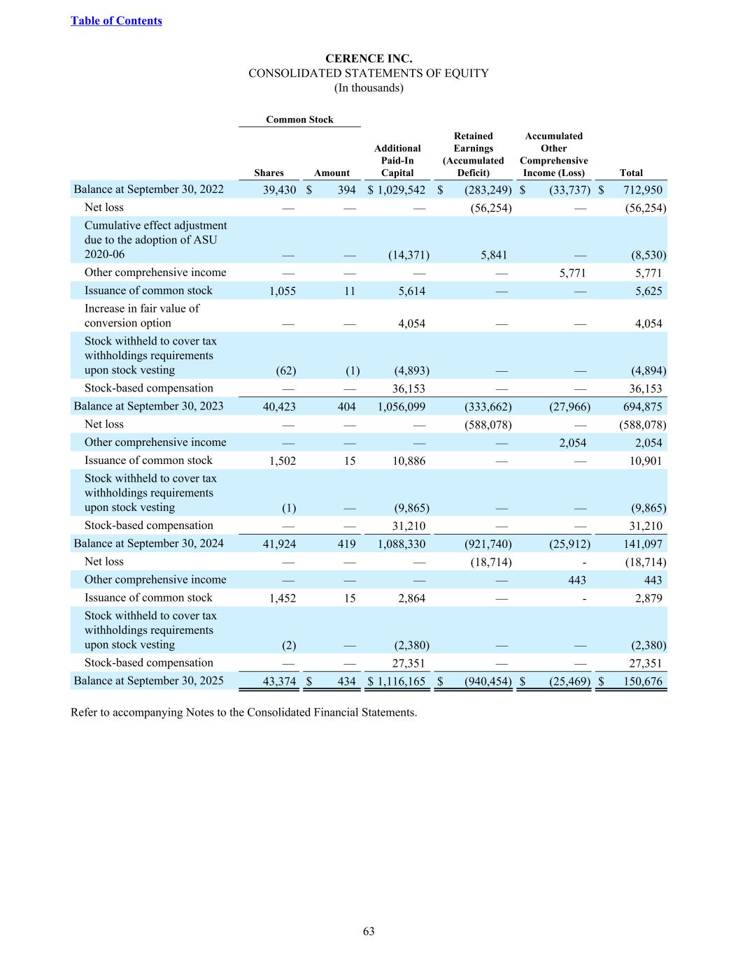 CERENCE INC. CONSOLIDATED STATEMENTS OF EQUITY (In thousands) Common Stock Shares Amount Additional Paid-In Capital Retained Earnings (Accumulated Deficit) Accumulated Other Comprehensive Income (Loss) Total Balance at September 30, 2022 39,430 $ 394 $ 1,029,542 $ (283,249) $ (33,737) $ 712,950 Net loss — — — (56,254) — (56,254) Cumulative effect adjustment due to the adoption of ASU 2020-06 — — (14,371) 5,841 — (8,530) Other comprehensive income — — — — 5,771 5,771 Issuance of common stock 1,055 11 5,614 — — 5,625 Increase in fair value of conversion option — — 4,054 — — 4,054 Stock withheld to cover tax withholdings requirements upon stock vesting (62) (1) (4,893) — — (4,894) Stock-based compensation — — 36,153 — — 36,153 Balance at September 30, 2023 40,423 404 1,056,099 (333,662) (27,966) 694,875 Net loss — — — (588,078) — (588,078) Other comprehensive income — — — — 2,054 2,054 Issuance of common stock 1,502 15 10,886 — — 10,901 Stock withheld to cover tax withholdings requirements upon stock vesting (1) — (9,865) — — (9,865) Stock-based compensation — — 31,210 — — 31,210 Balance at September 30, 2024 41,924 419 1,088,330 (921,740) (25,912) 141,097 Net loss — — — (18,714) - (18,714) Other comprehensive income — — — — 443 443 Issuance of common stock 1,452 15 2,864 — - 2,879 Stock withheld to cover tax withholdings requirements upon stock vesting (2) — (2,380) — — (2,380) Stock-based compensation — — 27,351 — — 27,351 Balance at September 30, 2025 43,374 $ 434 $ 1,116,165 $ (940,454) $ (25,469) $ 150,676 Refer to accompanying Notes to the Consolidated Financial Statements. Table of Contents 63